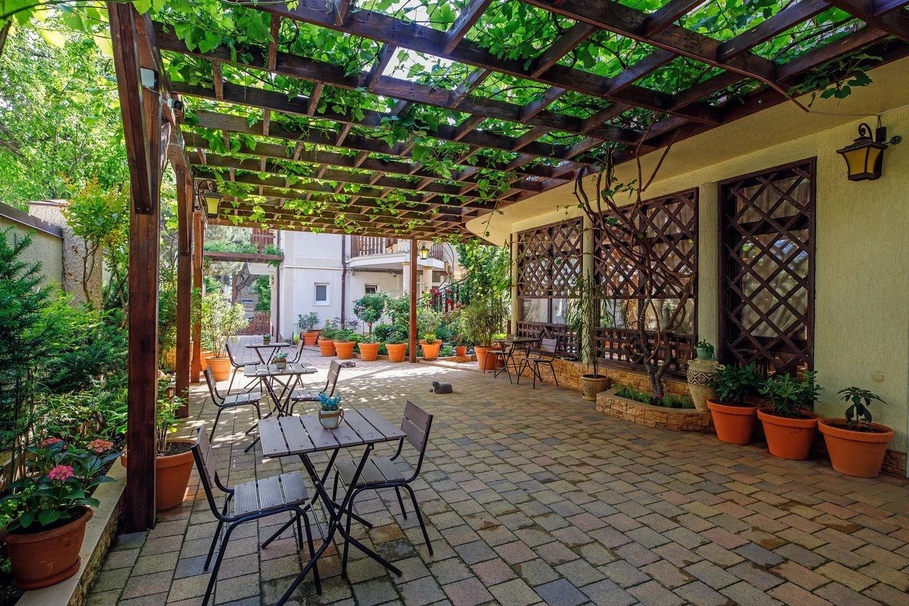 Безусловно расположение отеля и благоустройство дворика делают огромный плюс отелю. На кухне очень чисто, есть вся посуда. Смена белья и полотенец каждые 3 дня, уборка номера по запросу. Удивило, что в номере есть большой холодильник с дифузером для охлаждения питьевой воды. На балконе плетеная мебель , столик и даже есть оригинальная закрытая пепельница. Вход в номер по скетч-карте,что тоже удобно. Ограничений по времени ухода и возвращения с прогулок нет. И отель очень красиво подсвечивается ночью. Мы были на личном авто. Проблем с парковкой не было. Улица тупиковая, много гостевые домов на ней и все ставят машины по одной стороне. Деревьев много и поэтому авто стояло не на солнце. Всё в шаговой доступности (по яндекс навигатору) - до моря 5 минут пешком, до автостанции - 8 минут, до фаникулера канатной дороги на горе Олимп - 23 минуты. Огромный выбор кафе и столовых самообслуживания также в пределах 5 минут пешком. Однозначно хотелось бы вернутся туда снова! Спасибо хозяйке Ларисе!