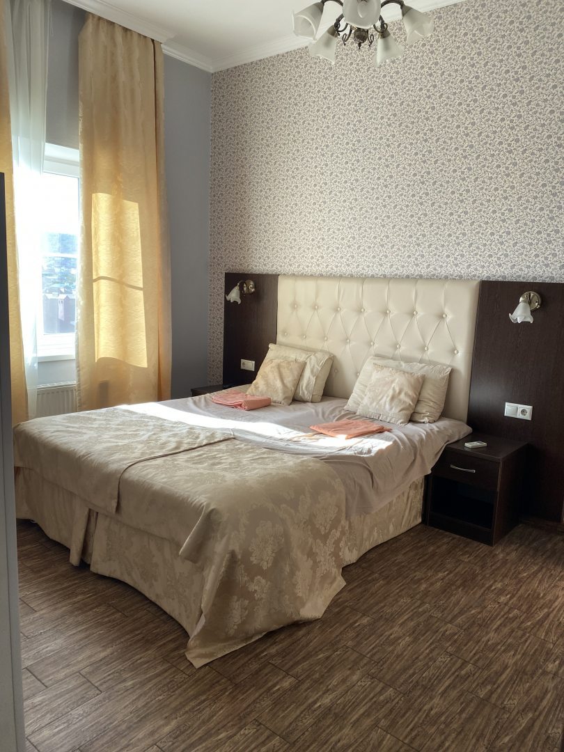 Отличный номер. Просторный, чистый и с балконом. Из окна видно горы. Высокие потолки. Горячая вода есть постоянно. Кухня общая, на которой есть вся необходимая посуда для приготовления пищи. В отеле свежий ремонт и везде чисто. Не далеко от моря и рынка. Машину можно оставить вдоль дороги или есть платная парковка возле самого отеля.