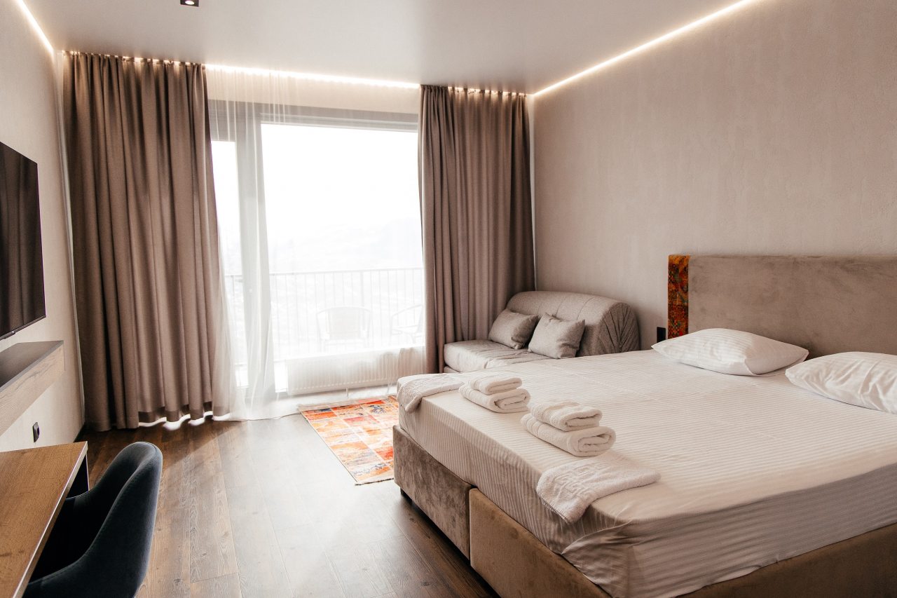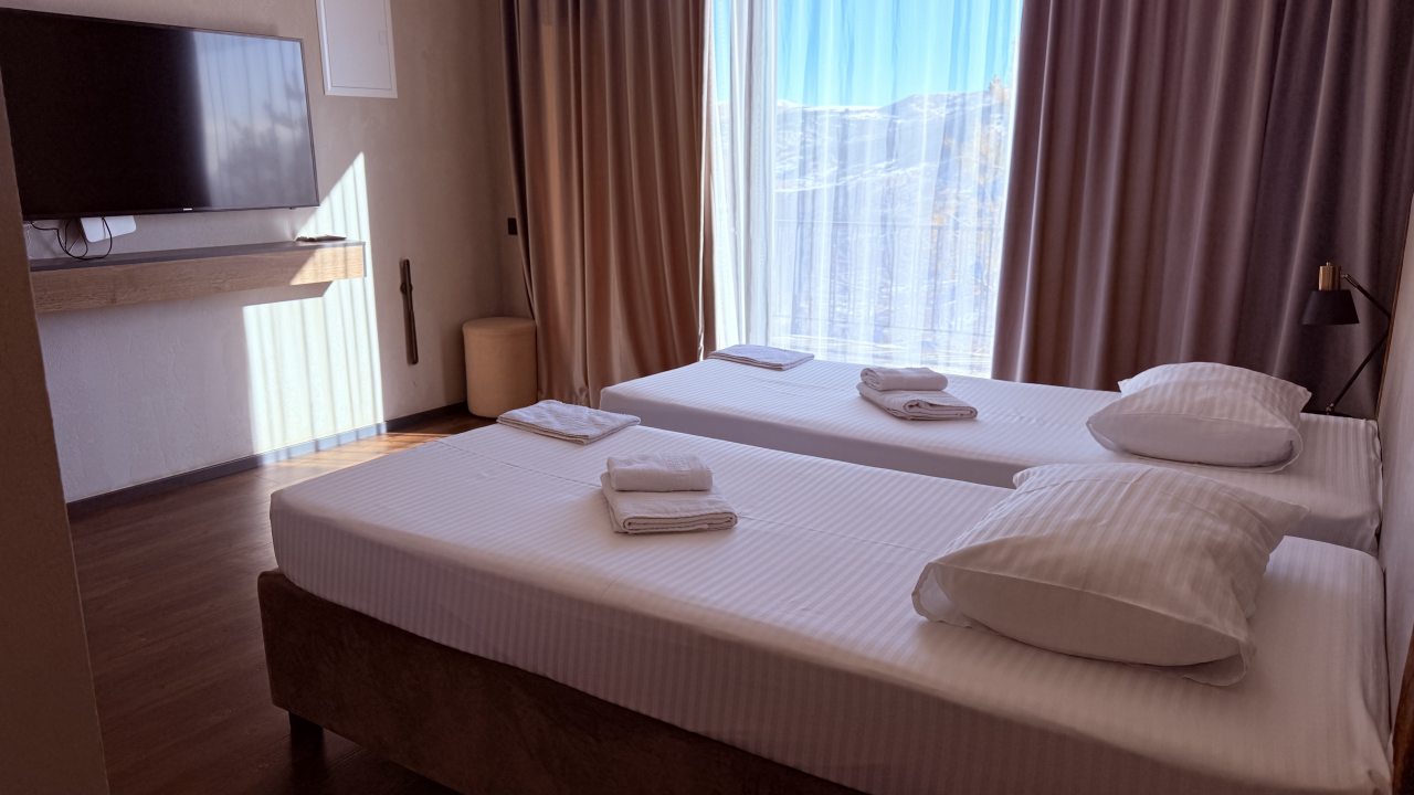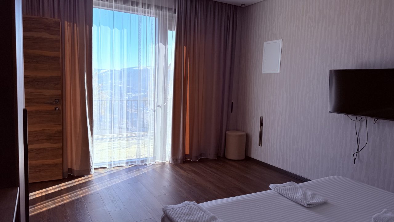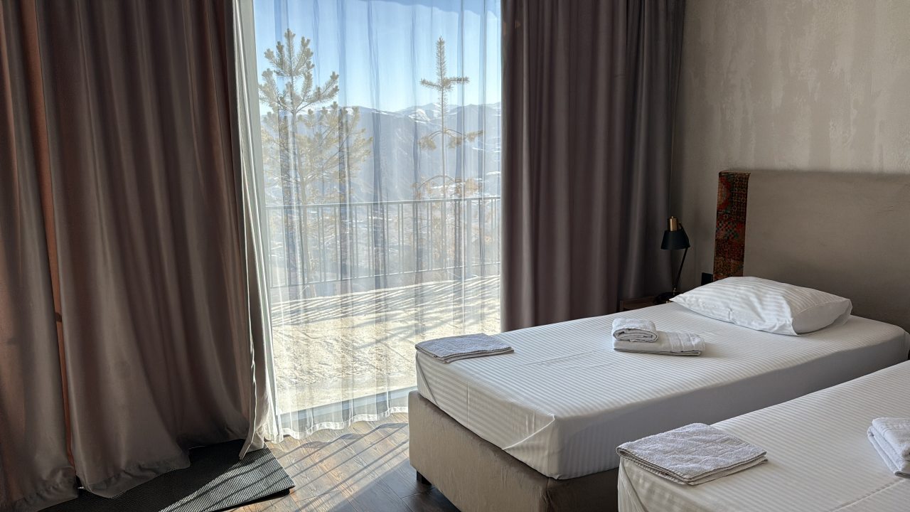 Гостиница очень уютная, есть разные номера по цене и удобствам. Приятно впечатлила звукоизоляция в отеле, так что спалось, как детстве крепко и ничего не мешало. В номере было панорамное окно, такие условия радовали душу, ведь виды красивейшие. В целом и локация отличная, есть возможность посетить крепость, водопады.