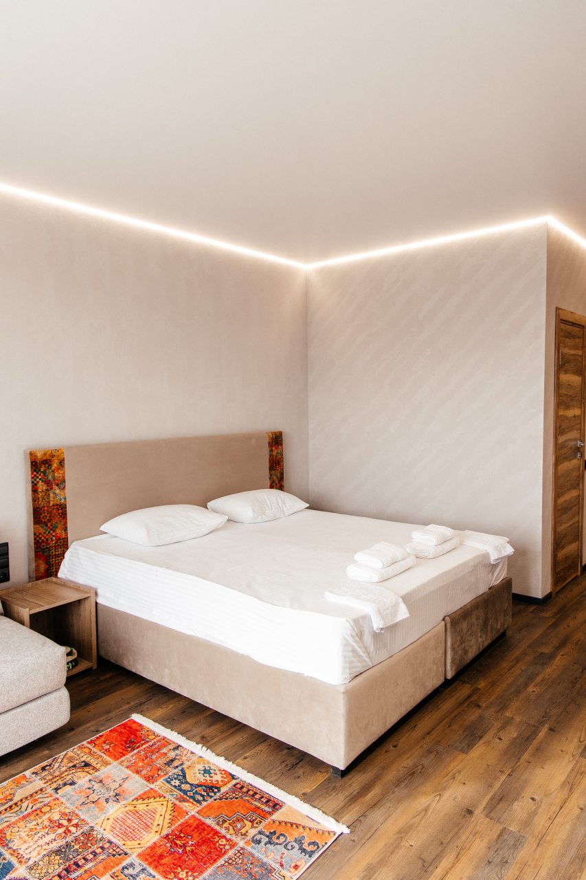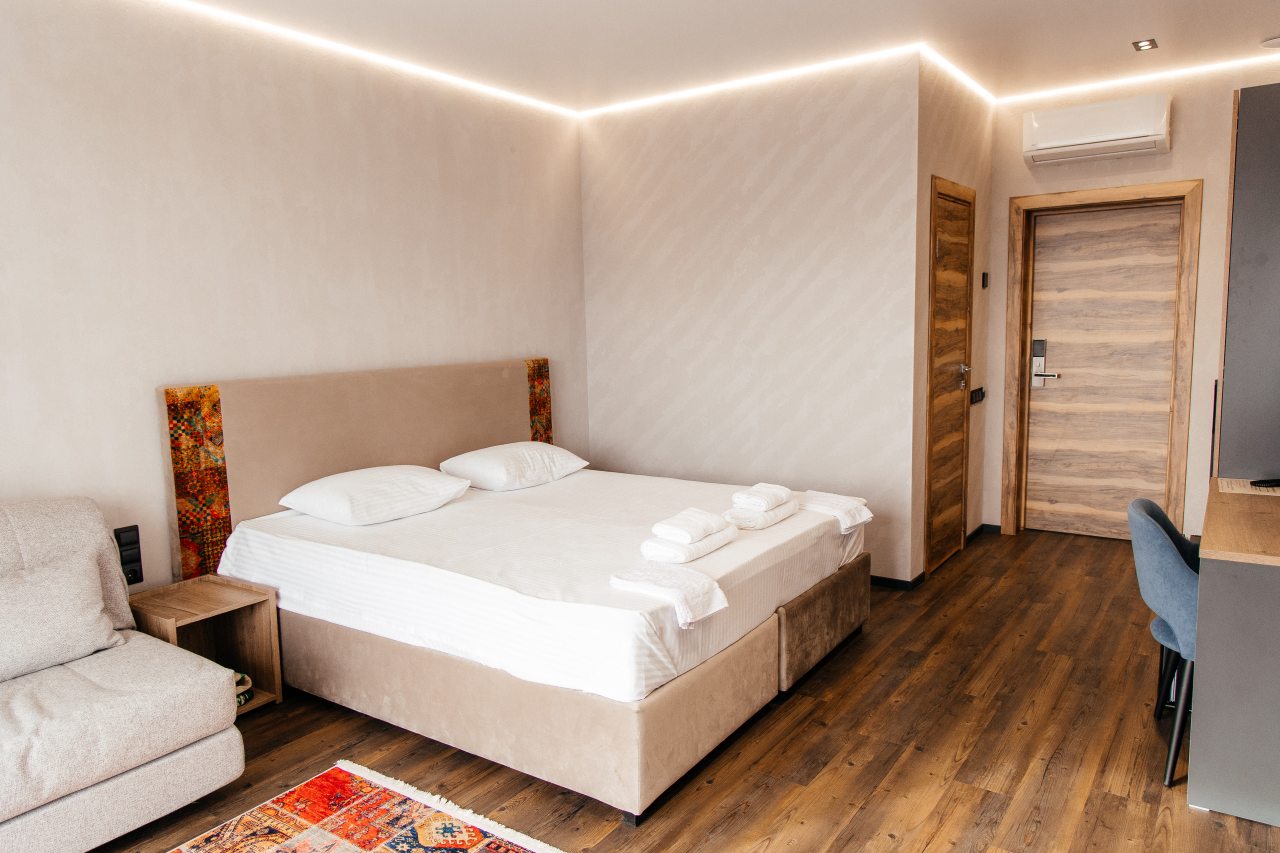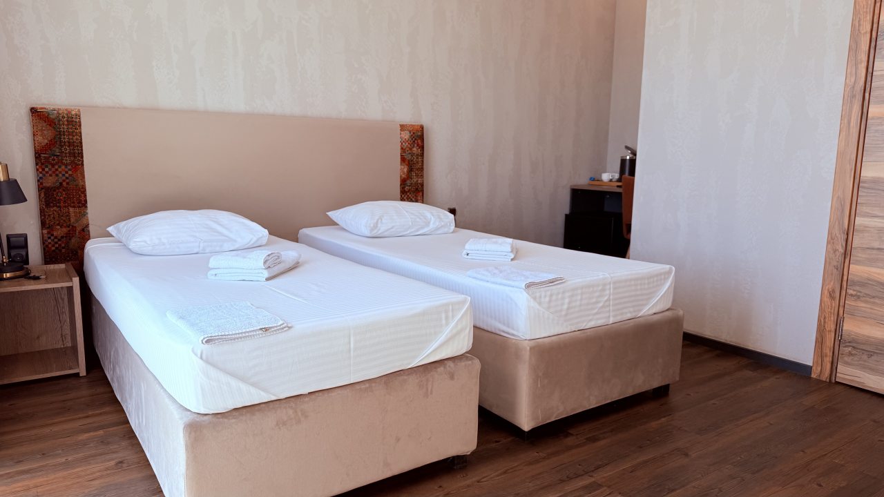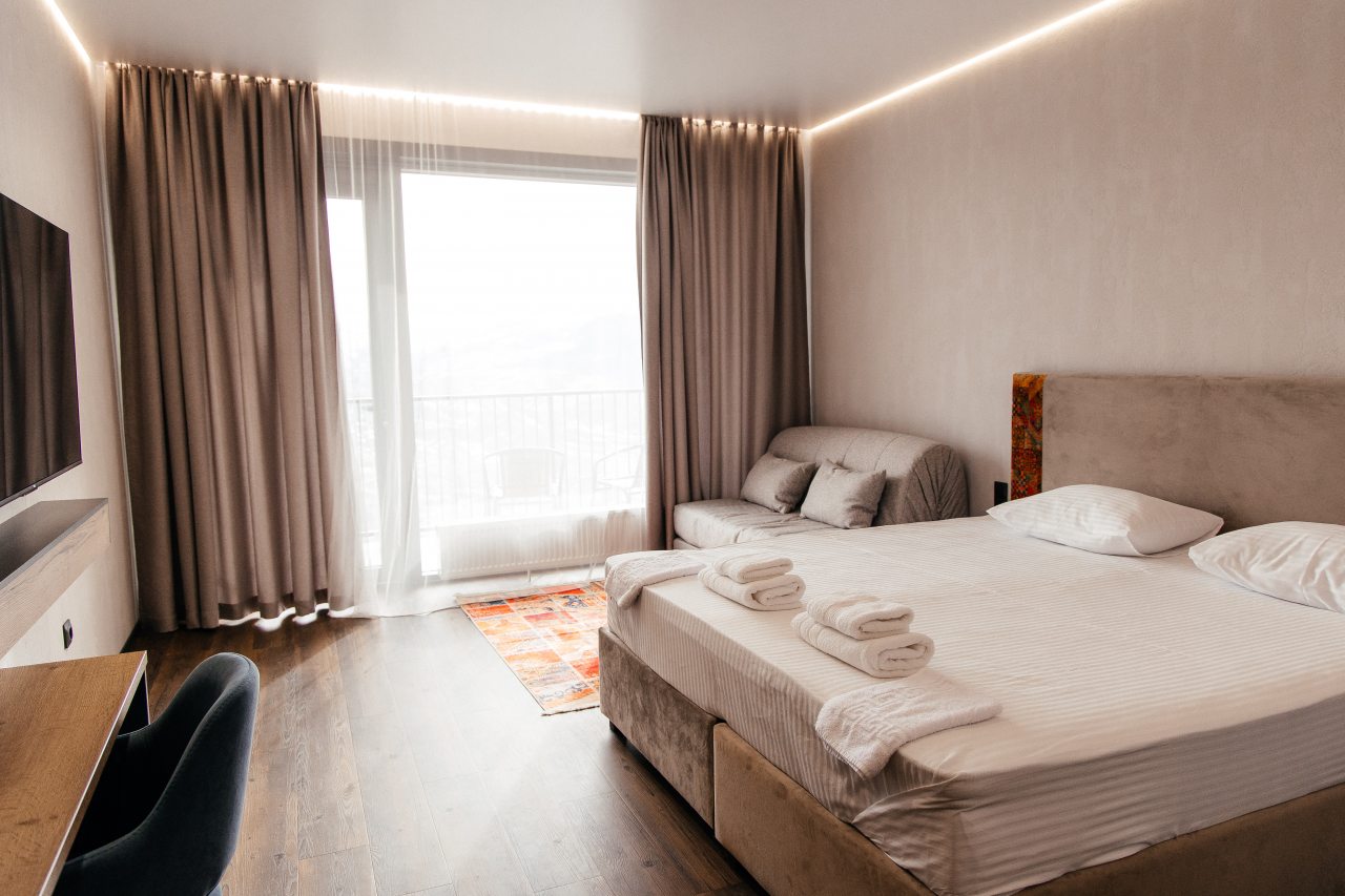 Гостиница очень уютная, есть разные номера по цене и удобствам. Приятно впечатлила звукоизоляция в отеле, так что спалось, как детстве крепко и ничего не мешало. В номере было панорамное окно, такие условия радовали душу, ведь виды красивейшие. В целом и локация отличная, есть возможность посетить крепость, водопады.