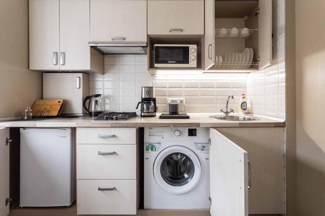 Апартаменты находятся недалеко от центральной части Калининграда. Вокзал совсем рядом, поэтому мы выбрали эту квартиру. Она хорошо обустроена, на кухне есть и техника для приготовления еды, и стиральная машина инсталлирована. Спальные места, телевизор, интернет работают отлично.