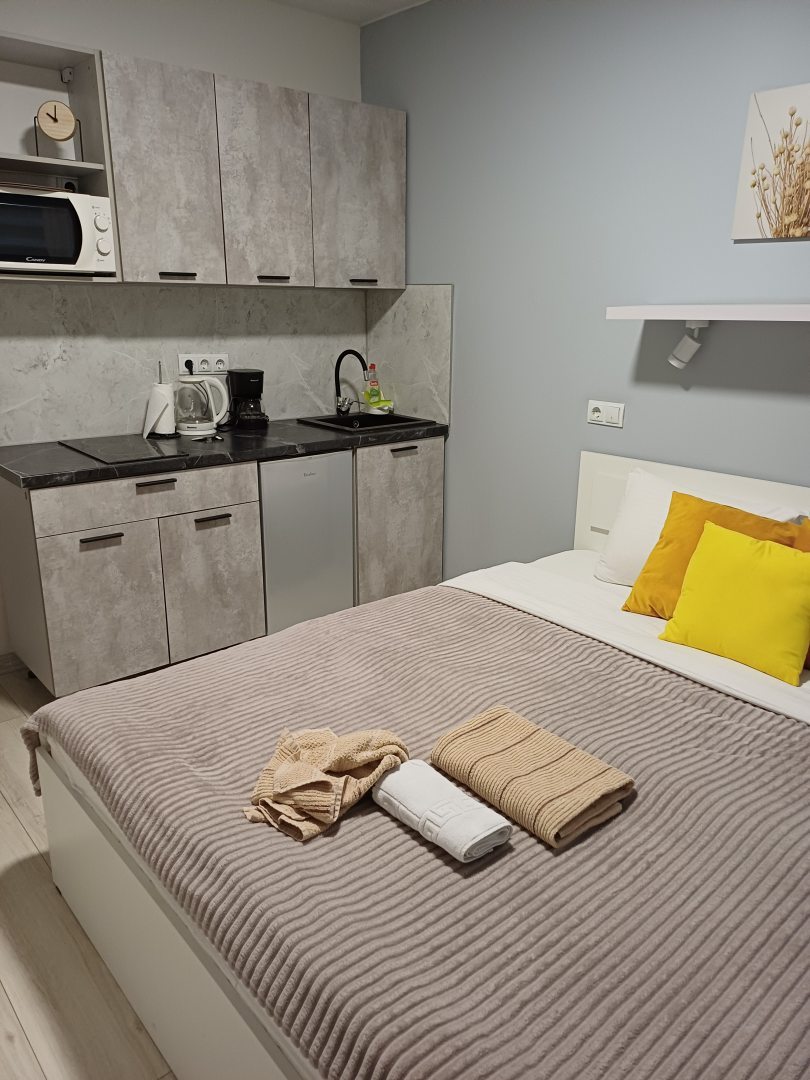 От апартаментов мы в восторге! Красивая и современная квартира оборудована отличной техникой. Есть места для хранения мелких вещей, все распределено очень компактно. Мне понравилось и расположение кухонного гарнитура рядом с кроватью. Очень удобно оказалось. Телевизор тоже есть напротив спального места. Апартаменты для удобного пребывания.