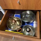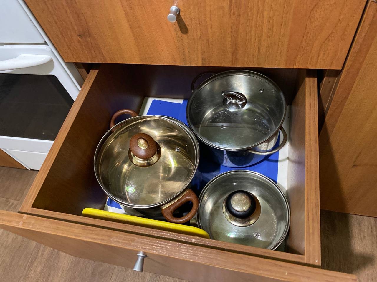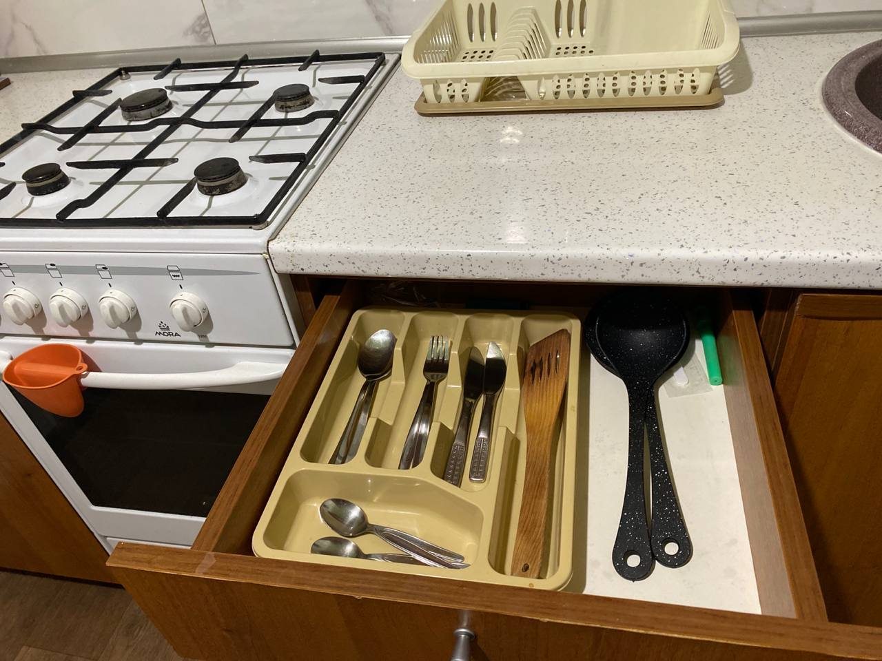 Оборудованная кухня: плита, микроволновка, электрический чайник, посуда, кое-какие продукты (чай, кофе, сахар, приправы, крупы), моющие средства.
