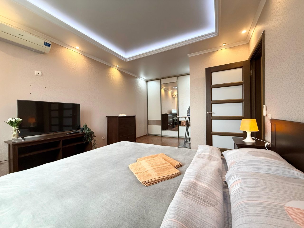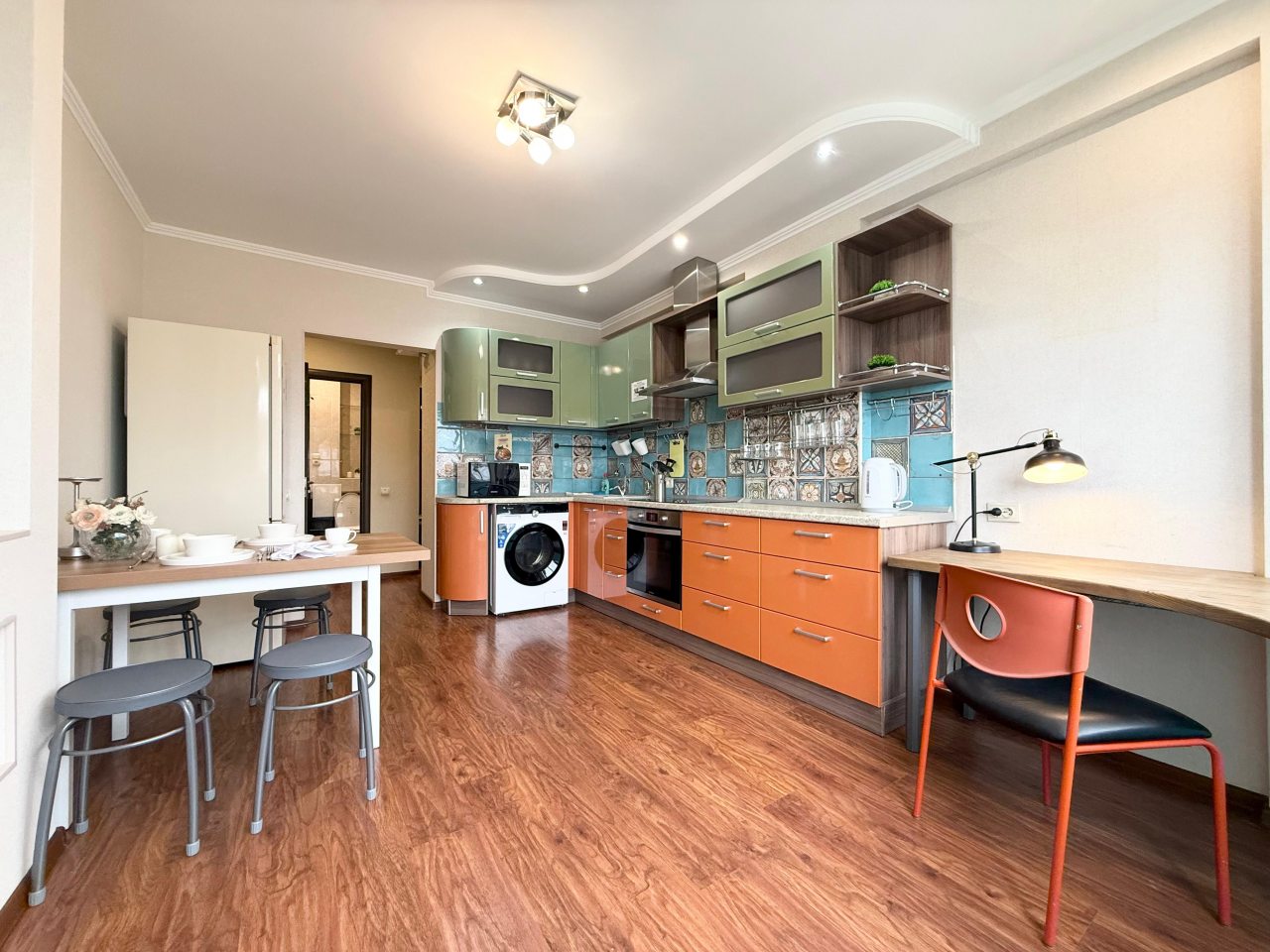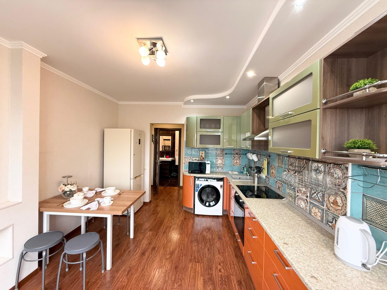 Уютная просторная квартира со всем необходимым. Интерьер радует взгляд, есть телевизоры в комнатах, теплые полы в туалете. Хорошая ванная, отличный напор воды. Тепло. Очень чисто. Кухня-столовая функциональная .