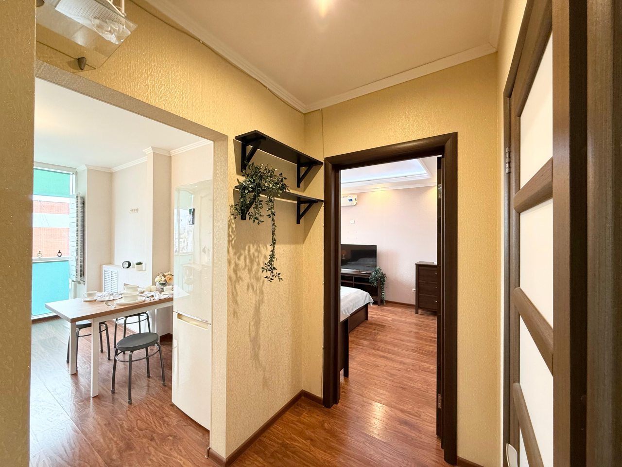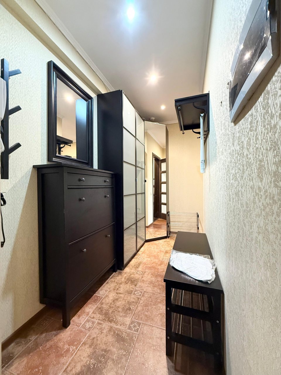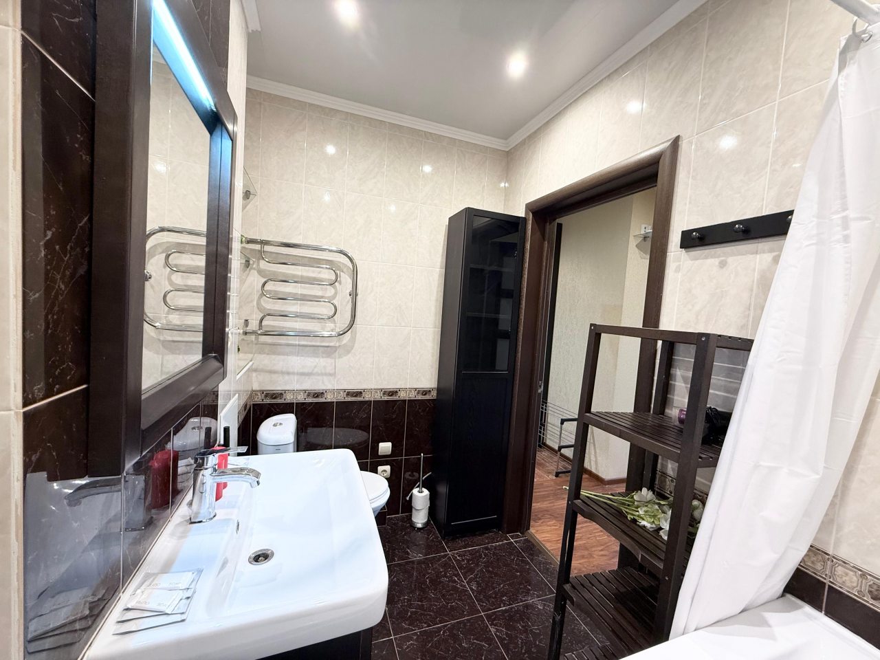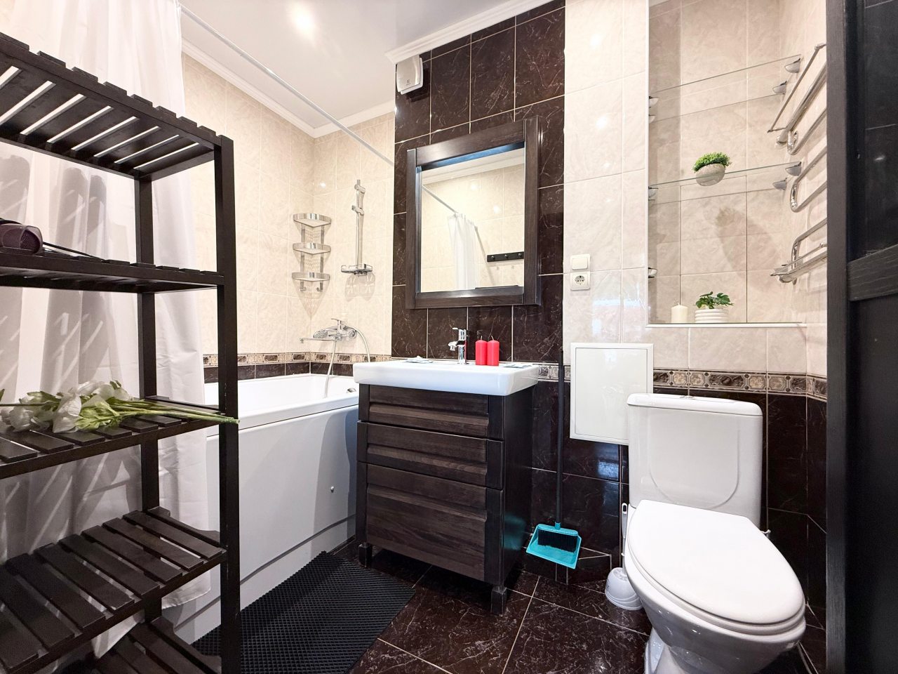 Уютная просторная квартира со всем необходимым. Интерьер радует взгляд, есть телевизоры в комнатах, теплые полы в туалете. Хорошая ванная, отличный напор воды. Тепло. Очень чисто. Кухня-столовая функциональная .
