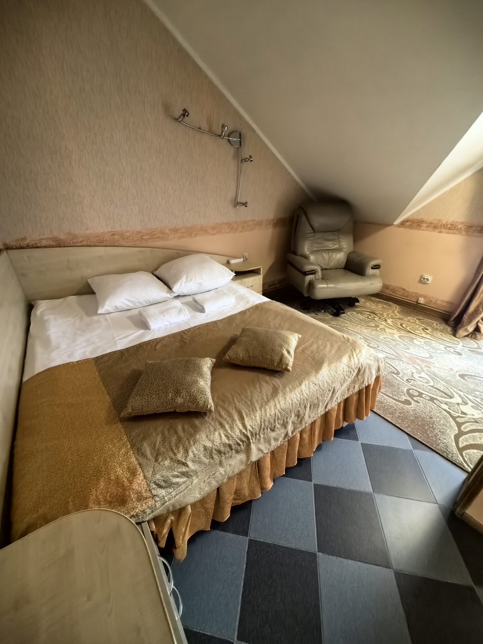Отель маленький, 2, расположен на отшибе, но т.к. город не большой за 10-15 мин можно добраться на такси до любого места. В номере есть холодильник, мыльные принадлеж6ности, чайник, тапочки. Номер большой (полулюкс). Матрас и подушки удобные, спать было комфортно. Напротив гостиницы река, набережная, пляж и шикарный вид. Цена качество.