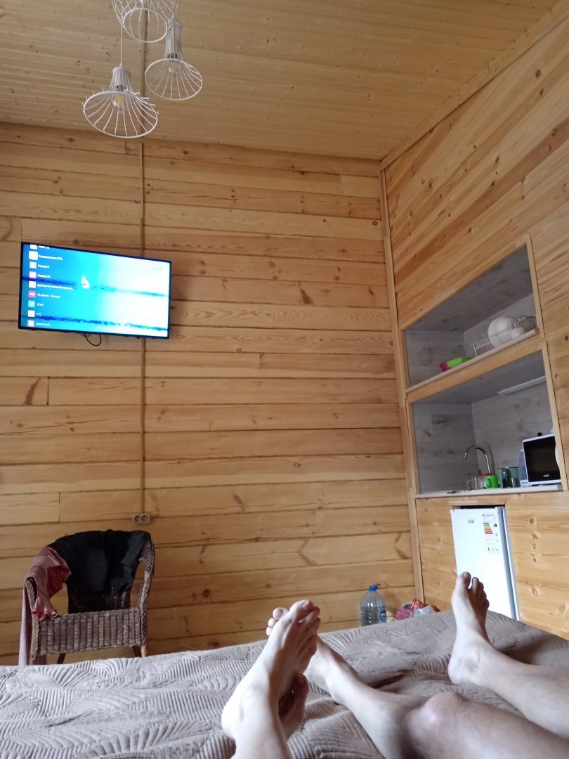 В третьих - очень комфортное проживание, понравилось всё. Заказывали бунгало, на месте нам пошли на встречу и переселили в Шале, поближе к бассейну - много пространства, чисто, большая беседка, комфортно и удобно. Посуда была, чайник, холодильник, микроволновка, телевизор - всё рабочее. Разрешили пользоваться стиральной машинкой. В мангальной зоне были решетки, мангалы, столы с навесами и даже раковина, не приходилось бегать с посудой в домик.