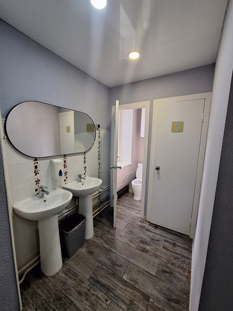 Расположение отличное. Три душевых, два санузла, кухонная зона с холодильником, микроволновкой, чайник, чай, сахар. Находится на четвёртом этаже, но есть лифт.