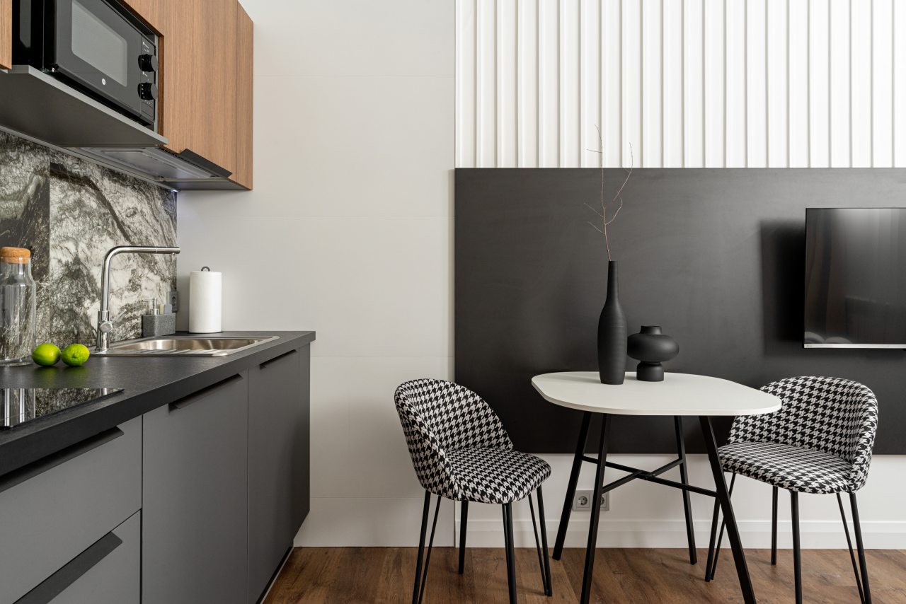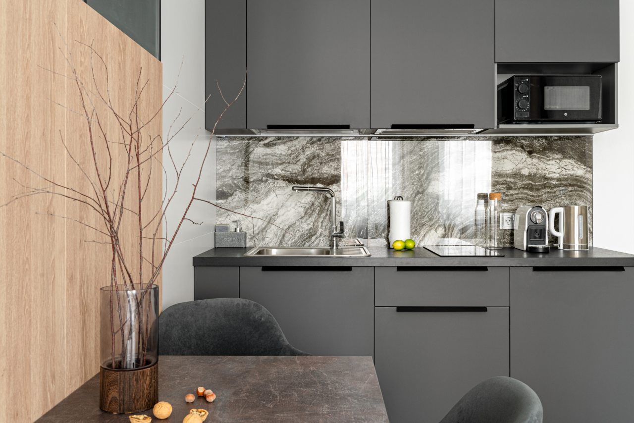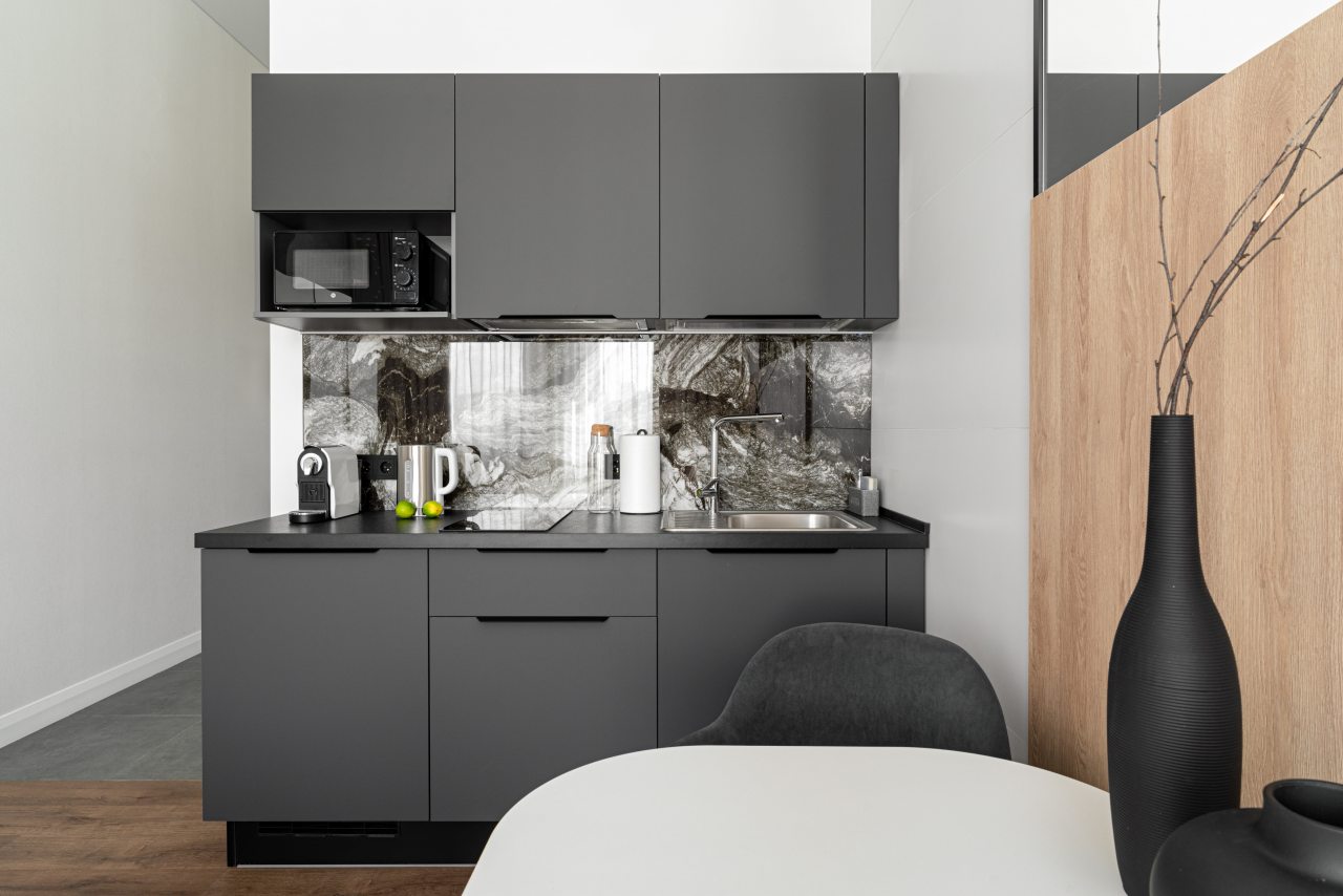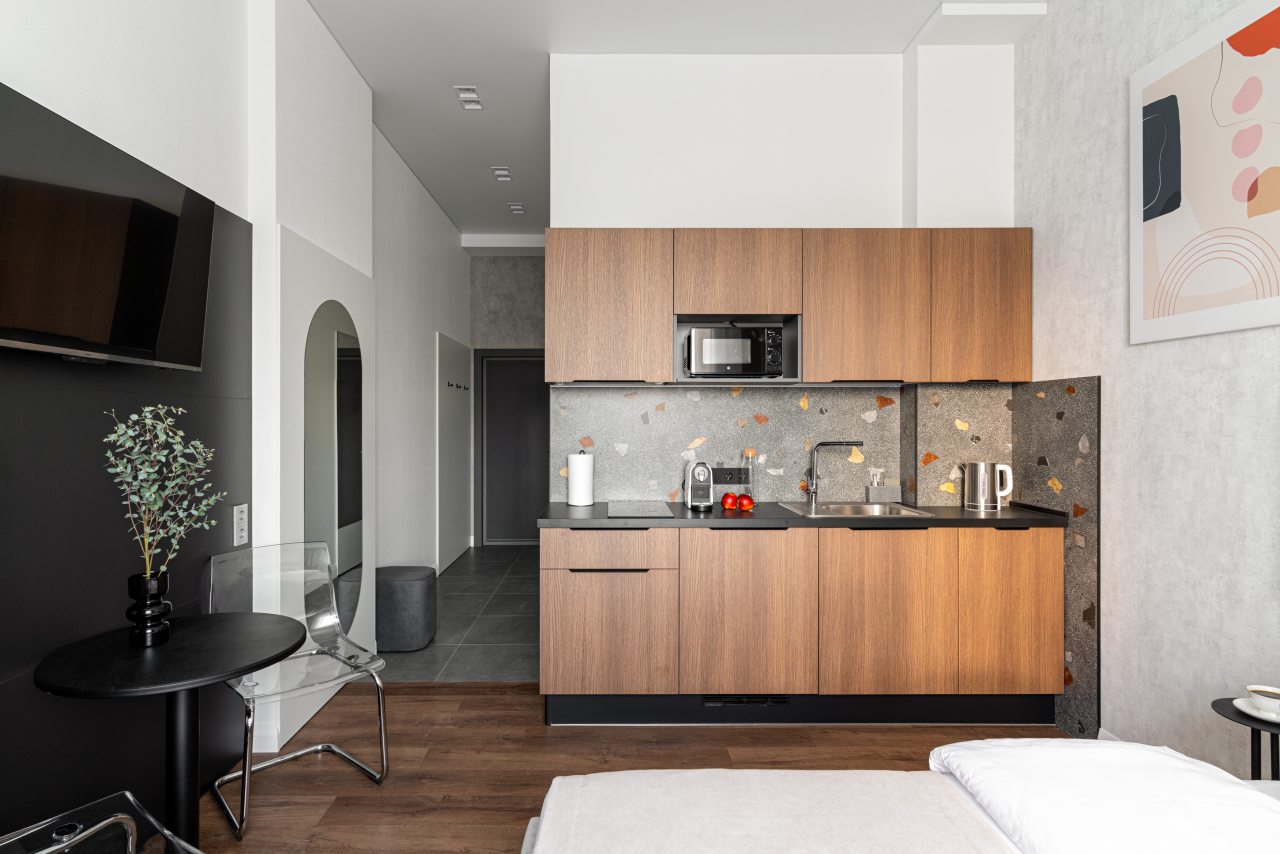 Отель имеет современные и комфортабельные номера, в которых приятно находиться. Интерьер минималистичный, есть все удобства для проживания, которые могут понадобиться. Посуды на кухне вполне хватило, и бытовой техники тоже. Местоположение суперское, все что может понадобиться поблизости.