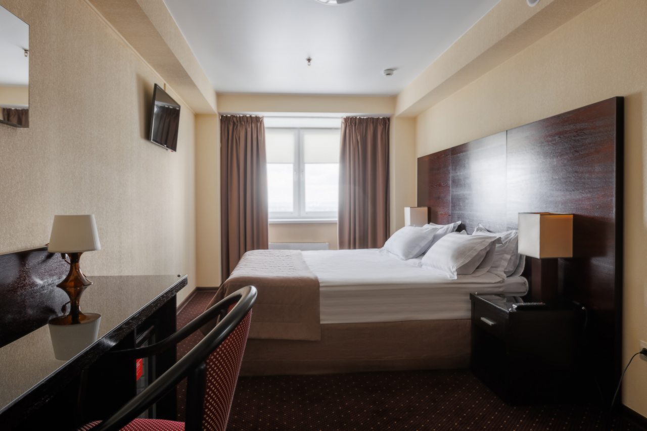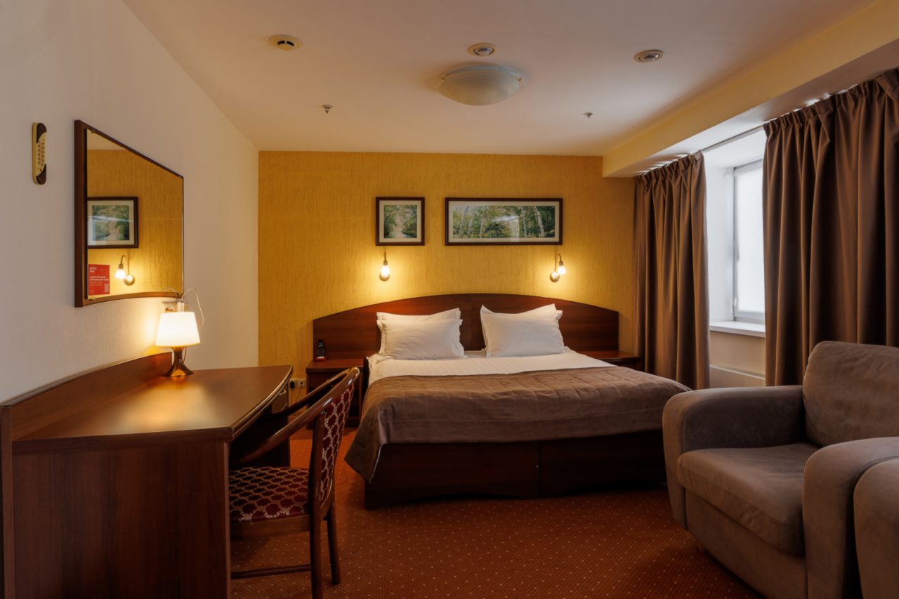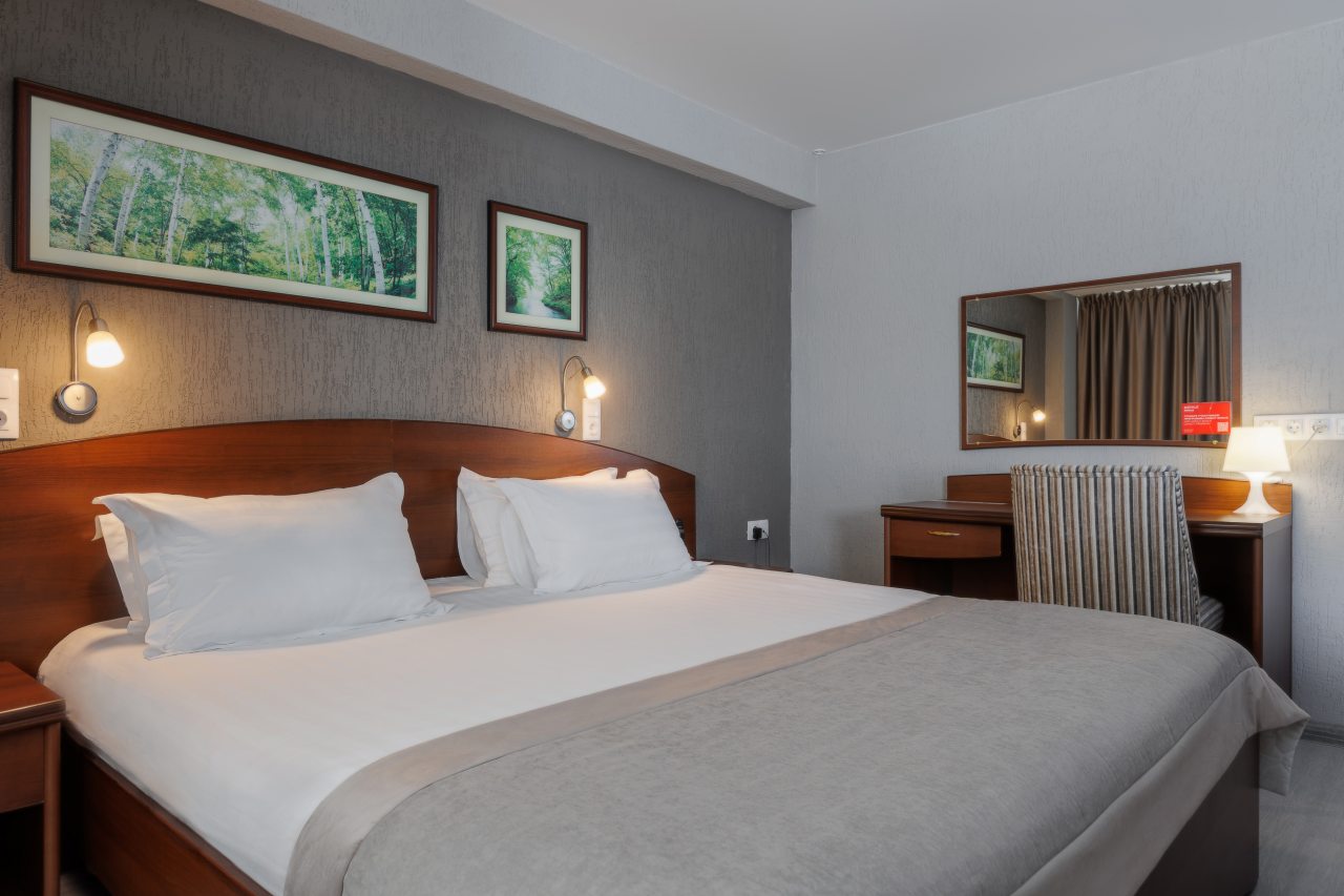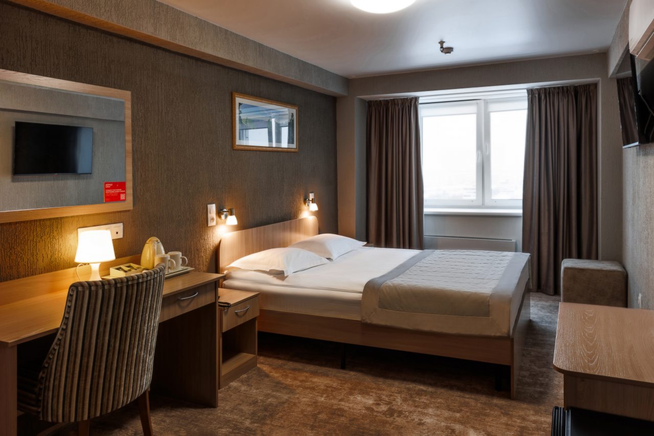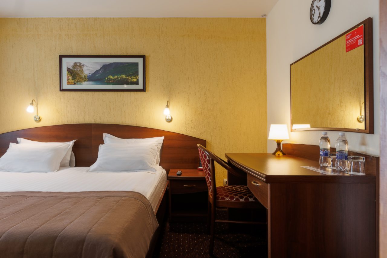 Гостиница большая, в ней предлагается много номеров и отличный сервис. На 4 звезды все соответствует, как и обещано. Мы располагались в двухместном комфорте с одной большой кроватью. В нем хороший современный ремонт, ковровое покрытие было чистым. На окнах плотные шторы, тщательно закрывающие от дневного света. Есть стол большой и зеркало, телевизор. В душе сантехника современная плюс есть бойлер, благодаря которому горячая вода была постоянна в номере.