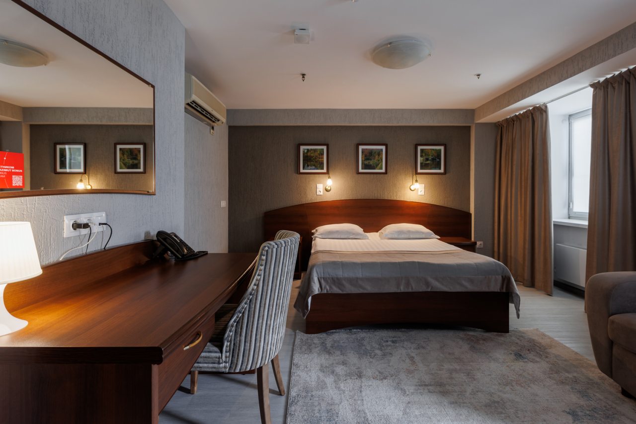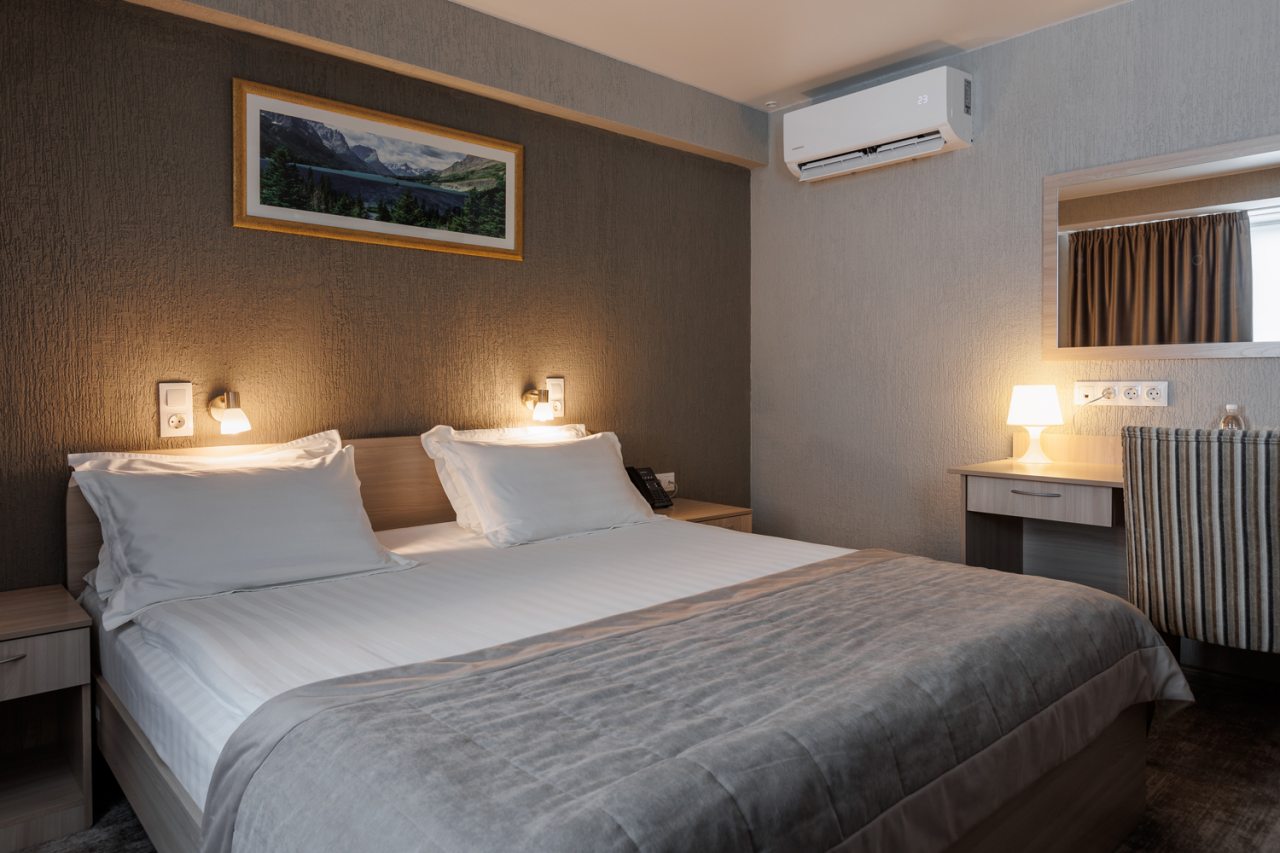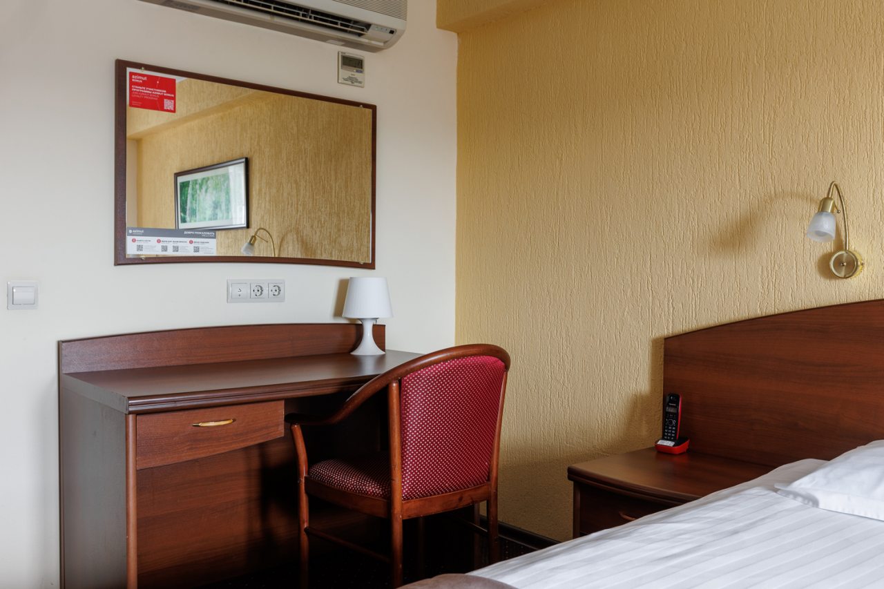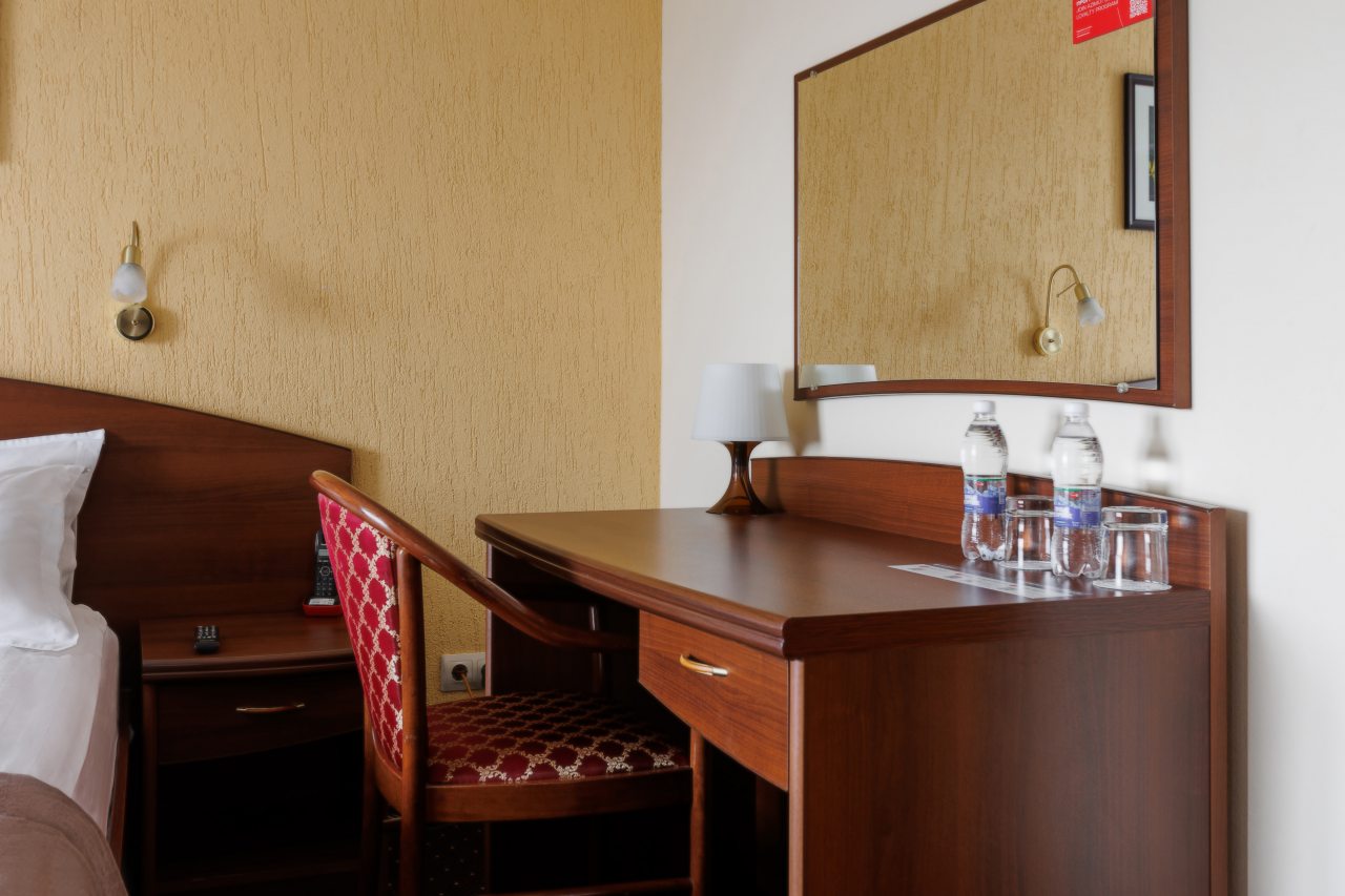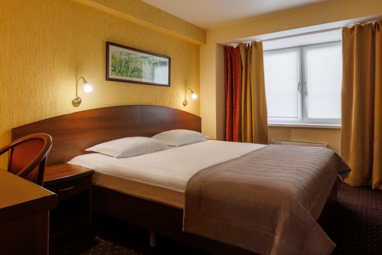 Гостиница большая, в ней предлагается много номеров и отличный сервис. На 4 звезды все соответствует, как и обещано. Мы располагались в двухместном комфорте с одной большой кроватью. В нем хороший современный ремонт, ковровое покрытие было чистым. На окнах плотные шторы, тщательно закрывающие от дневного света. Есть стол большой и зеркало, телевизор. В душе сантехника современная плюс есть бойлер, благодаря которому горячая вода была постоянна в номере.