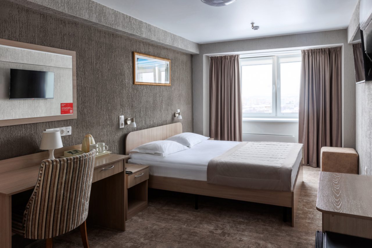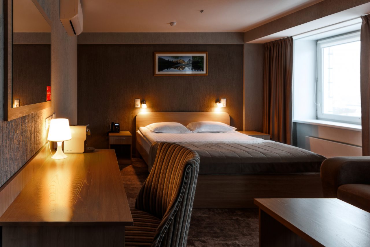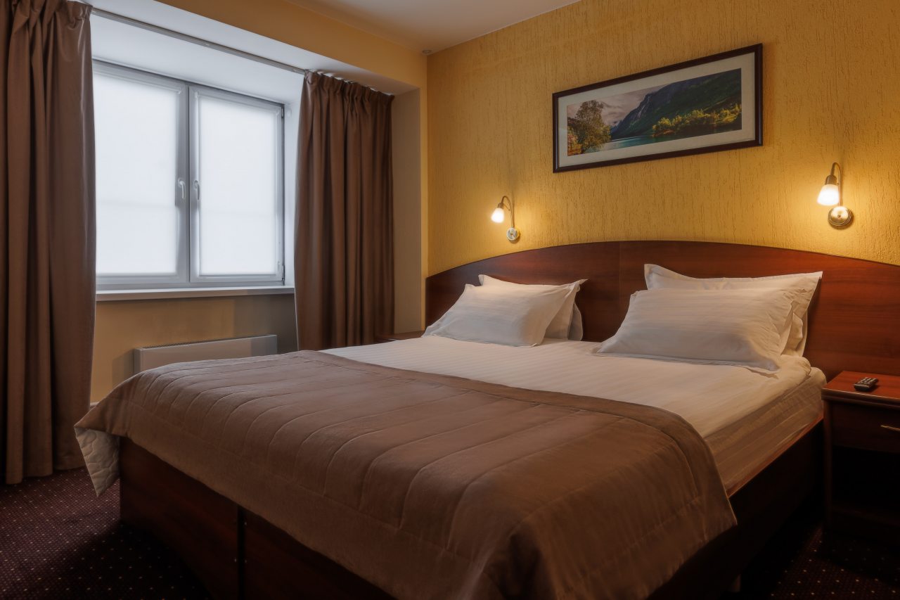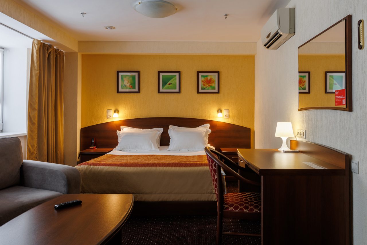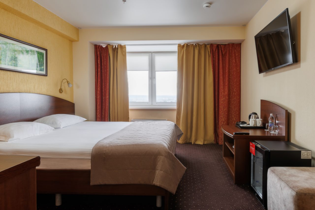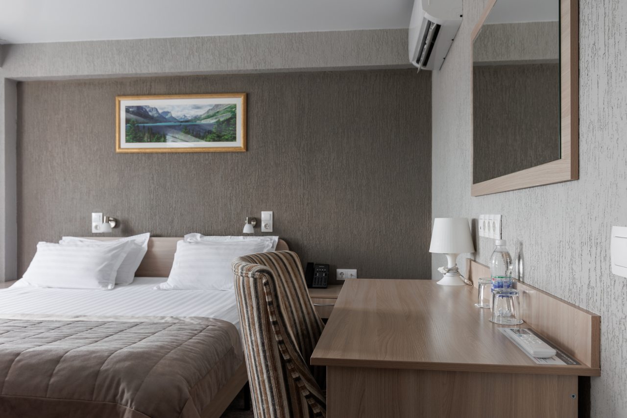 Гостиница большая, в ней предлагается много номеров и отличный сервис. На 4 звезды все соответствует, как и обещано. Мы располагались в двухместном комфорте с одной большой кроватью. В нем хороший современный ремонт, ковровое покрытие было чистым. На окнах плотные шторы, тщательно закрывающие от дневного света. Есть стол большой и зеркало, телевизор. В душе сантехника современная плюс есть бойлер, благодаря которому горячая вода была постоянна в номере.