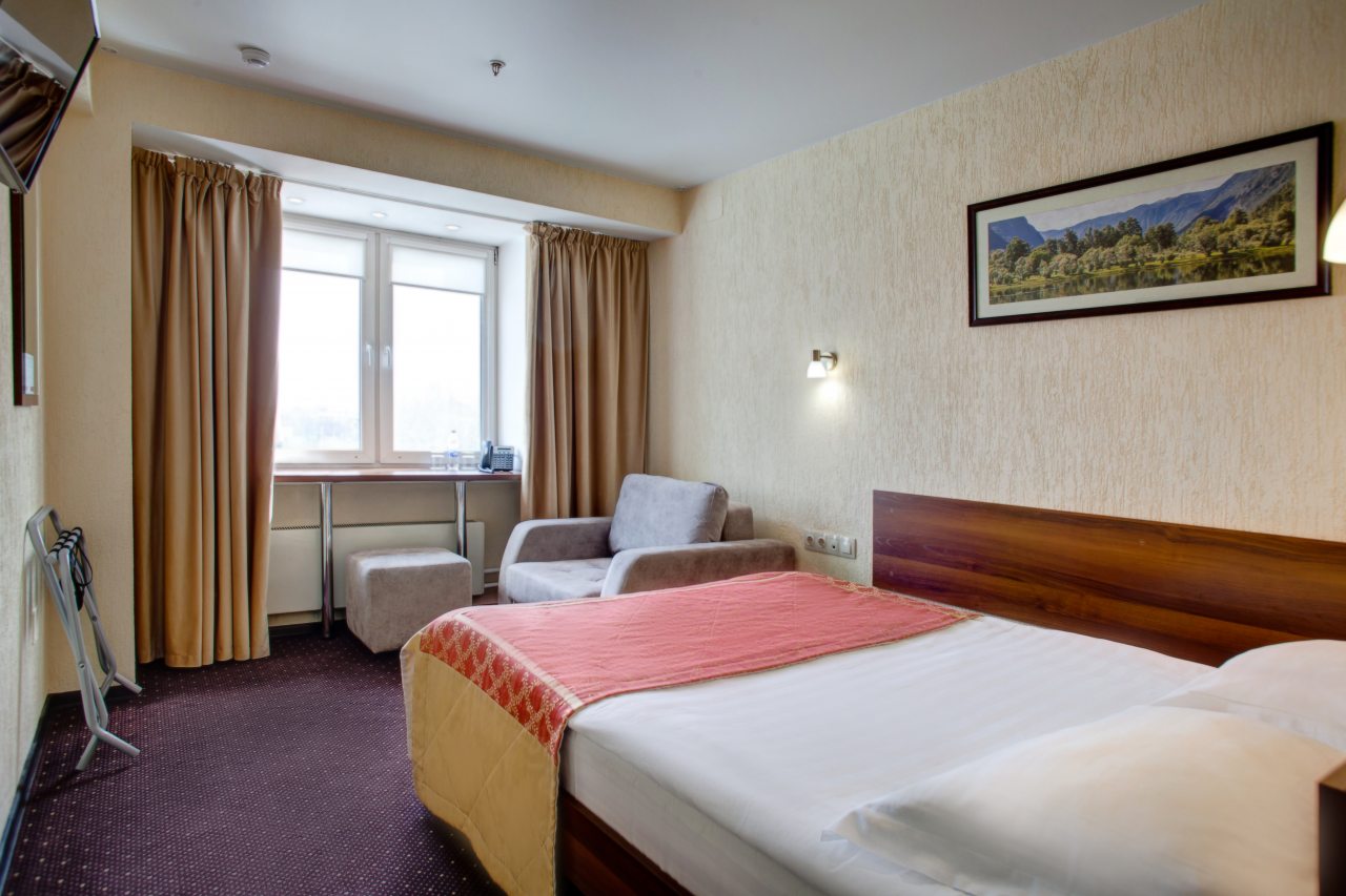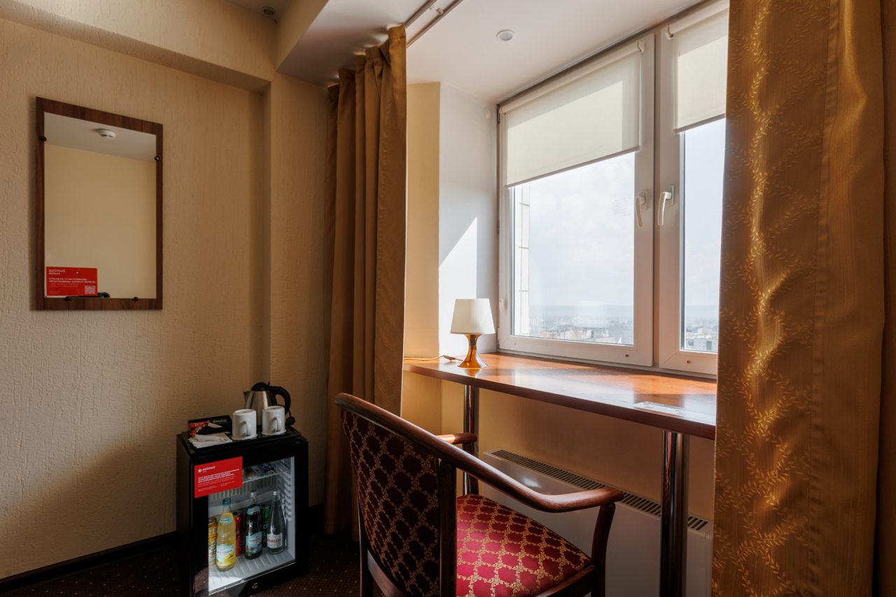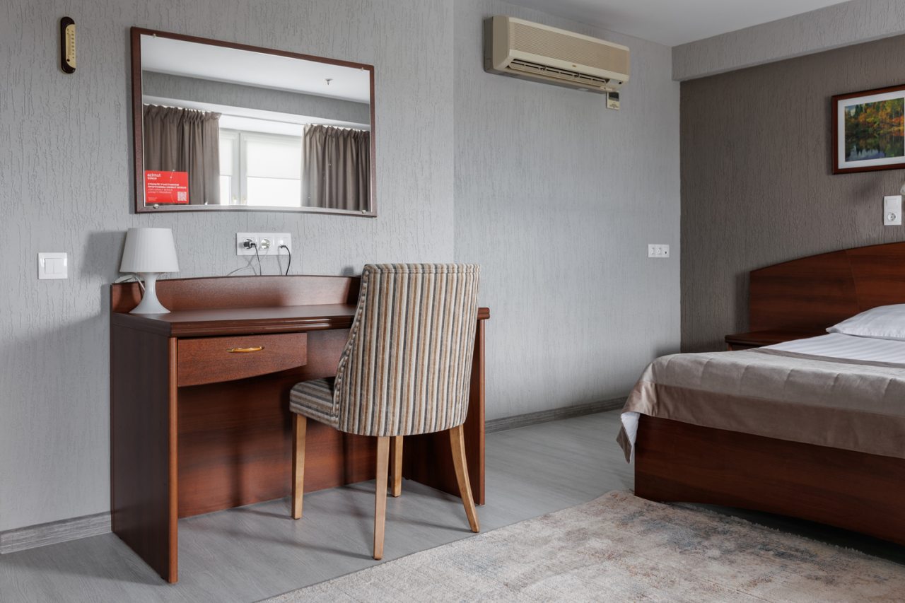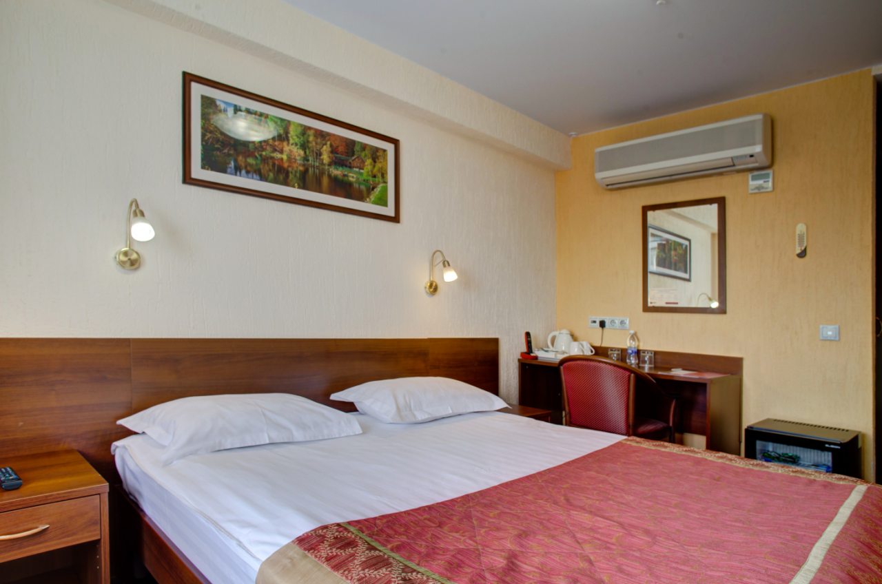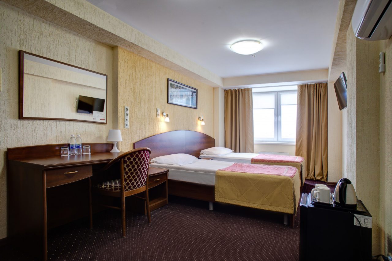 Гостиница большая, в ней предлагается много номеров и отличный сервис. На 4 звезды все соответствует, как и обещано. Мы располагались в двухместном комфорте с одной большой кроватью. В нем хороший современный ремонт, ковровое покрытие было чистым. На окнах плотные шторы, тщательно закрывающие от дневного света. Есть стол большой и зеркало, телевизор. В душе сантехника современная плюс есть бойлер, благодаря которому горячая вода была постоянна в номере.