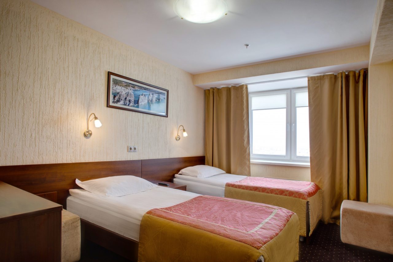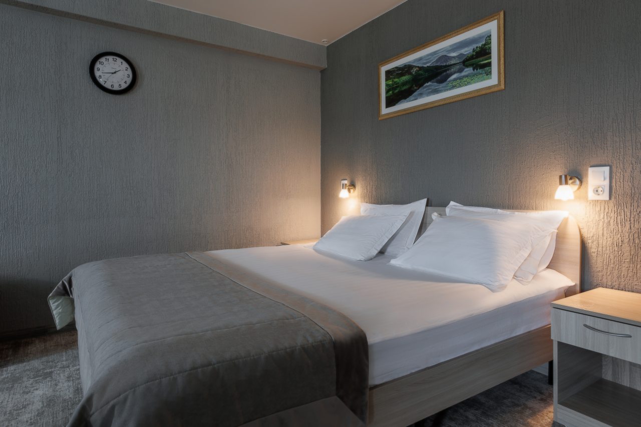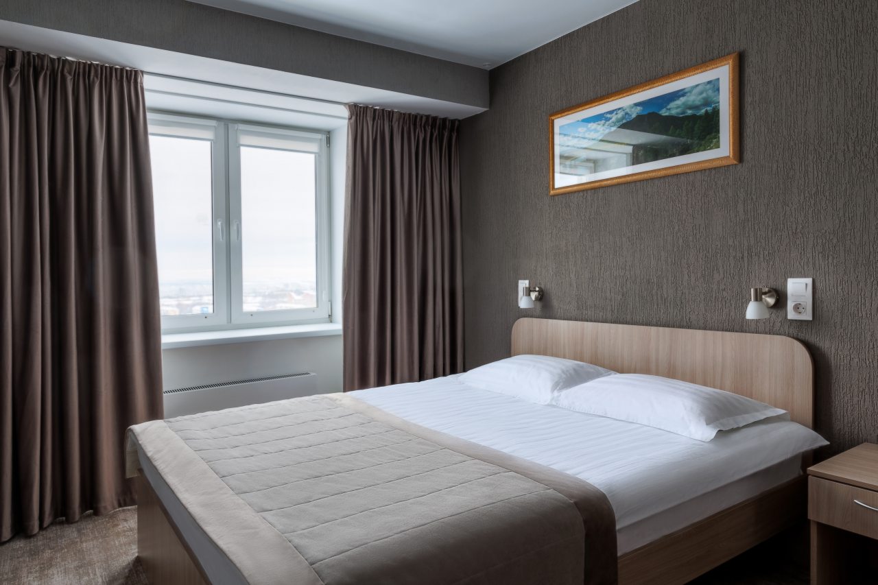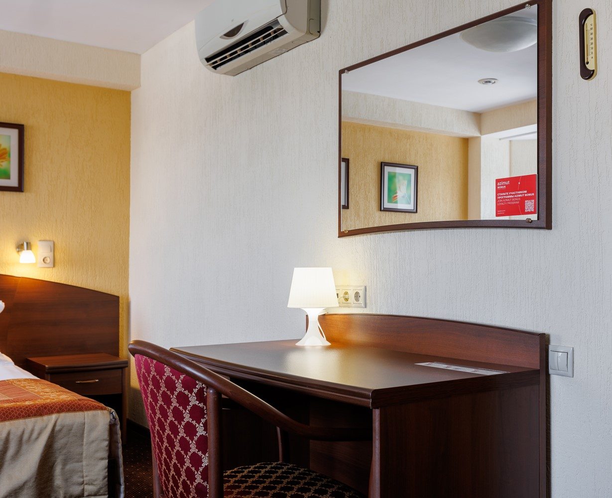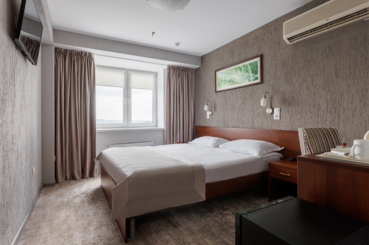 Гостиница большая, в ней предлагается много номеров и отличный сервис. На 4 звезды все соответствует, как и обещано. Мы располагались в двухместном комфорте с одной большой кроватью. В нем хороший современный ремонт, ковровое покрытие было чистым. На окнах плотные шторы, тщательно закрывающие от дневного света. Есть стол большой и зеркало, телевизор. В душе сантехника современная плюс есть бойлер, благодаря которому горячая вода была постоянна в номере.