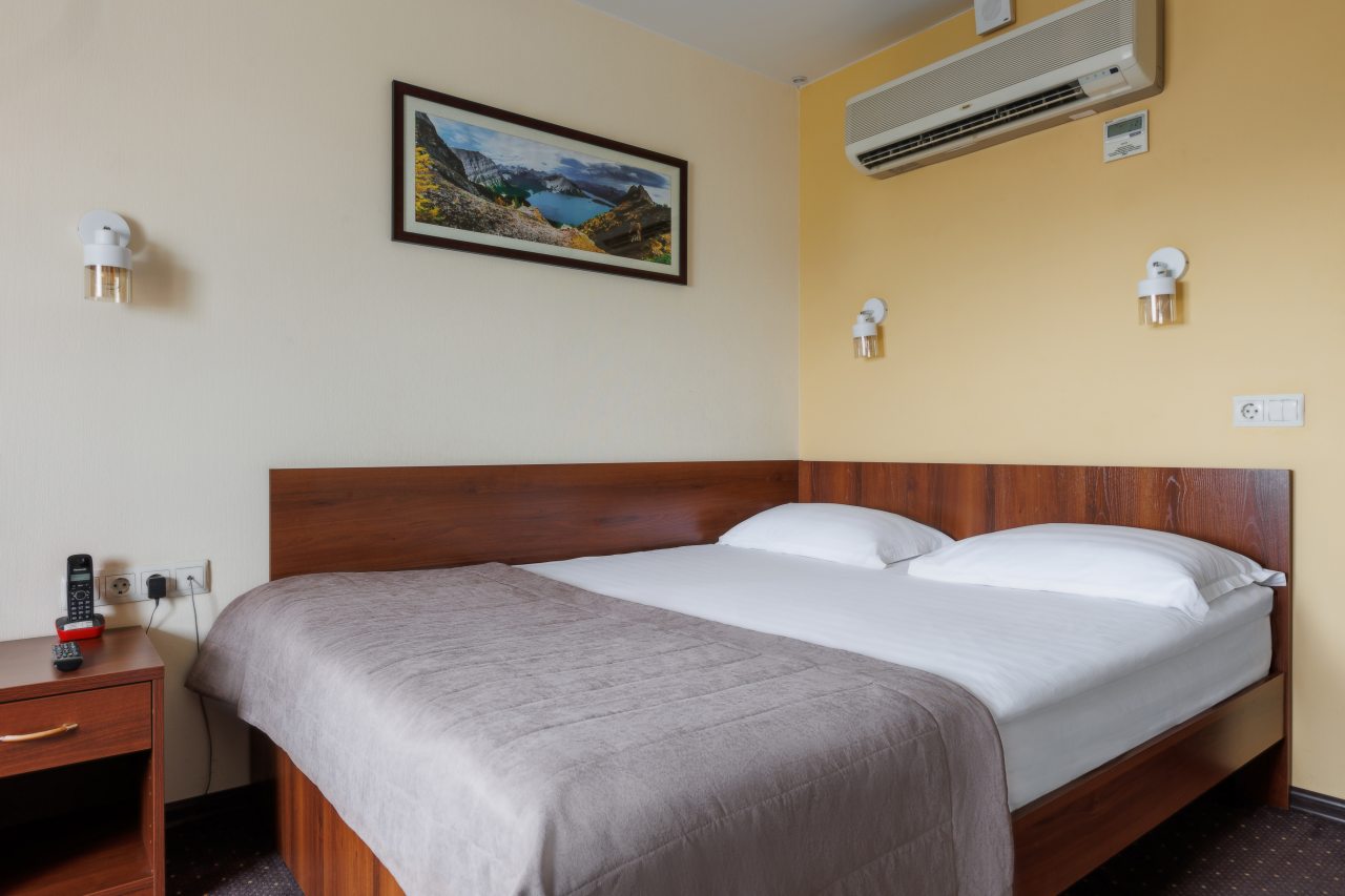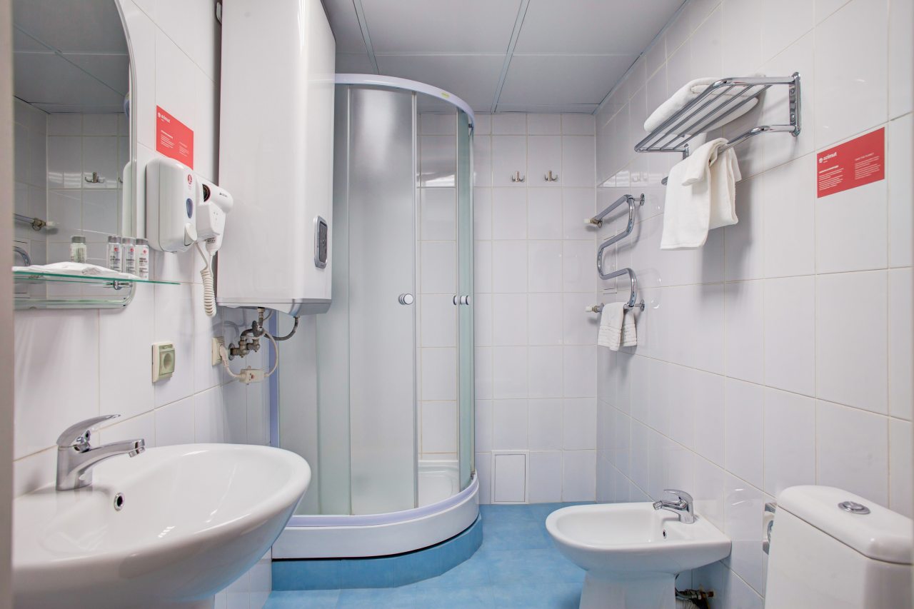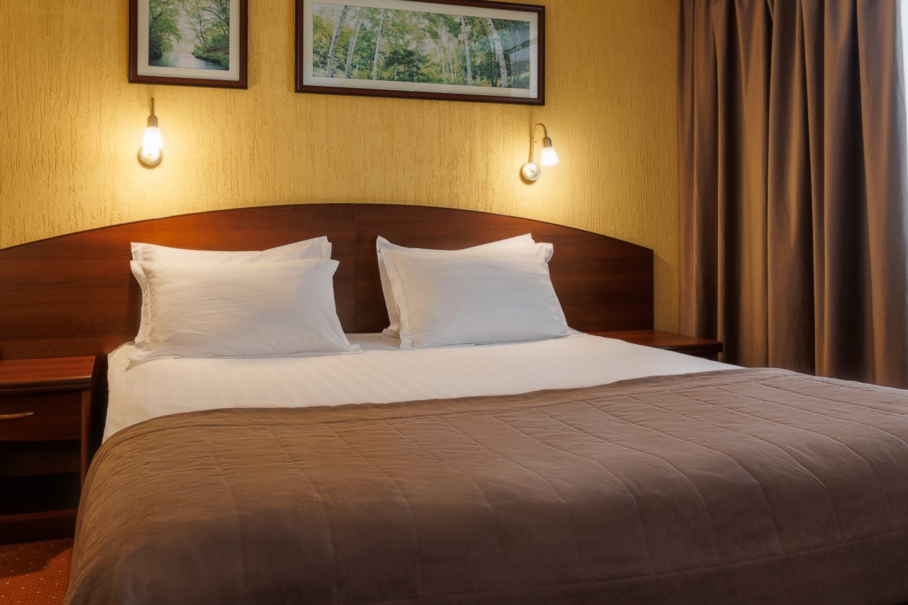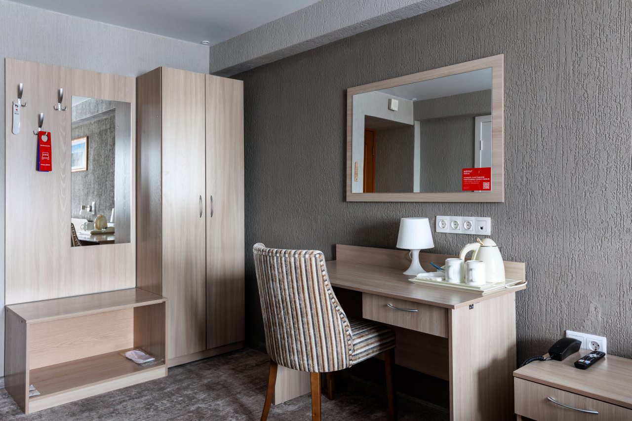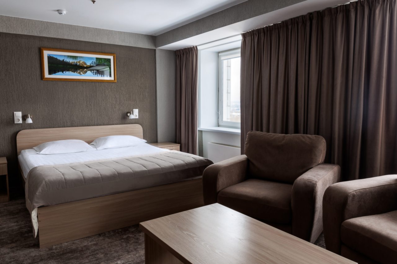 Гостиница большая, в ней предлагается много номеров и отличный сервис. На 4 звезды все соответствует, как и обещано. Мы располагались в двухместном комфорте с одной большой кроватью. В нем хороший современный ремонт, ковровое покрытие было чистым. На окнах плотные шторы, тщательно закрывающие от дневного света. Есть стол большой и зеркало, телевизор. В душе сантехника современная плюс есть бойлер, благодаря которому горячая вода была постоянна в номере.