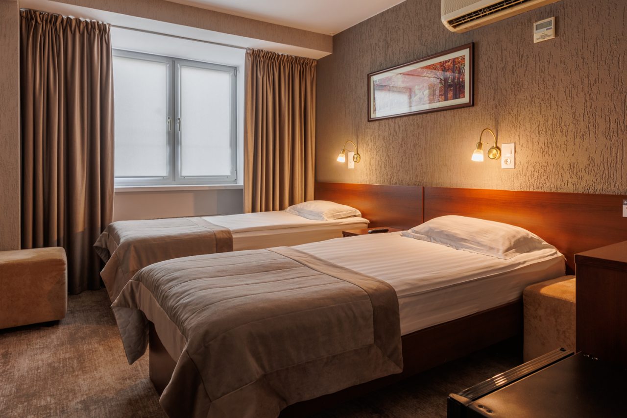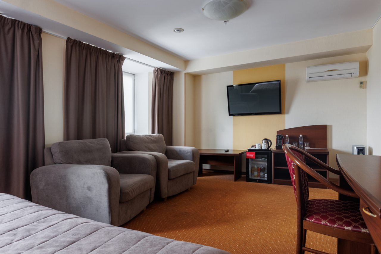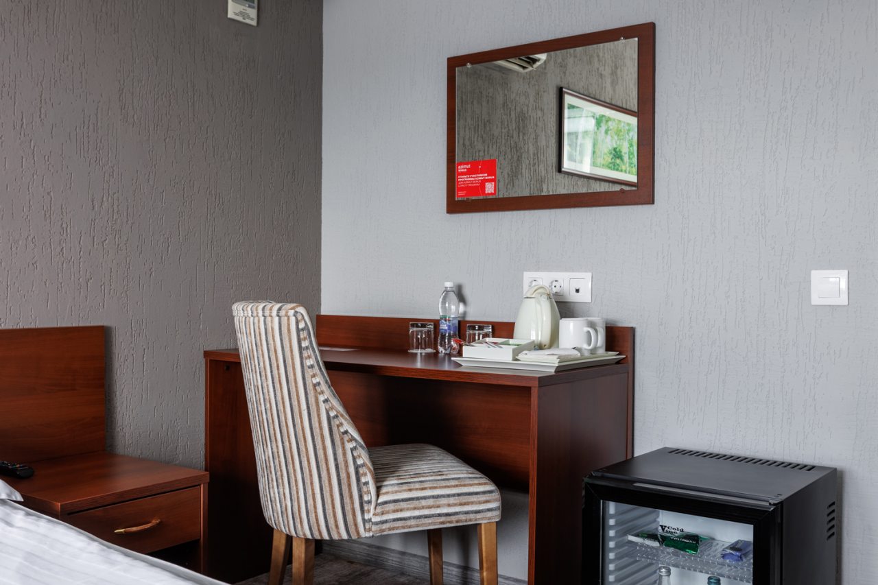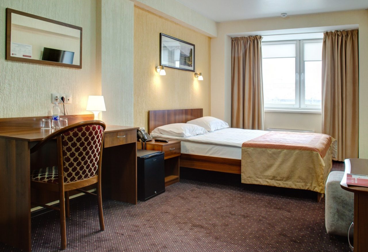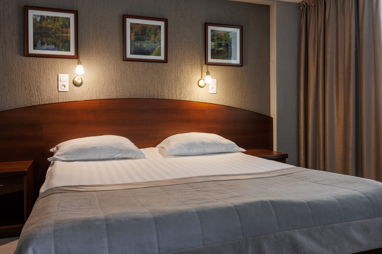 Гостиница большая, в ней предлагается много номеров и отличный сервис. На 4 звезды все соответствует, как и обещано. Мы располагались в двухместном комфорте с одной большой кроватью. В нем хороший современный ремонт, ковровое покрытие было чистым. На окнах плотные шторы, тщательно закрывающие от дневного света. Есть стол большой и зеркало, телевизор. В душе сантехника современная плюс есть бойлер, благодаря которому горячая вода была постоянна в номере.
