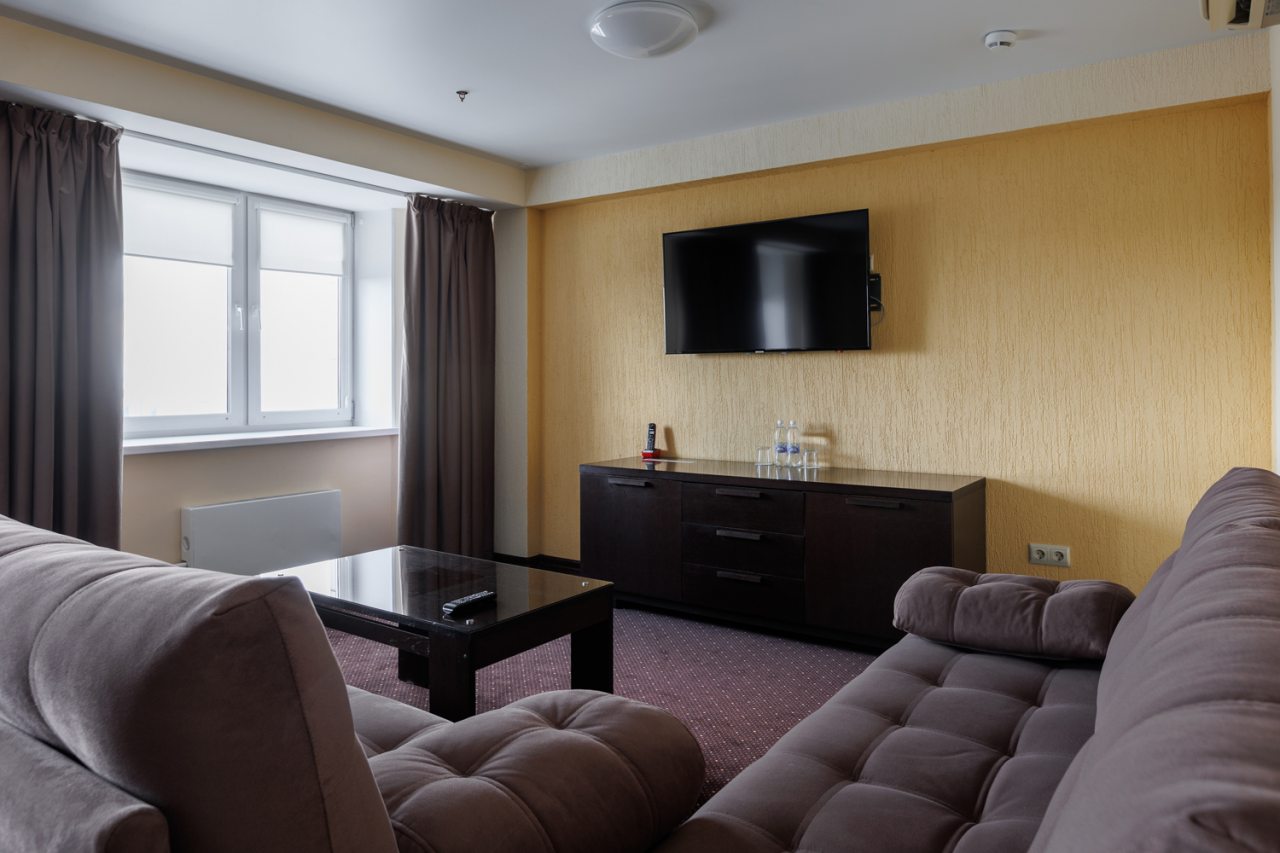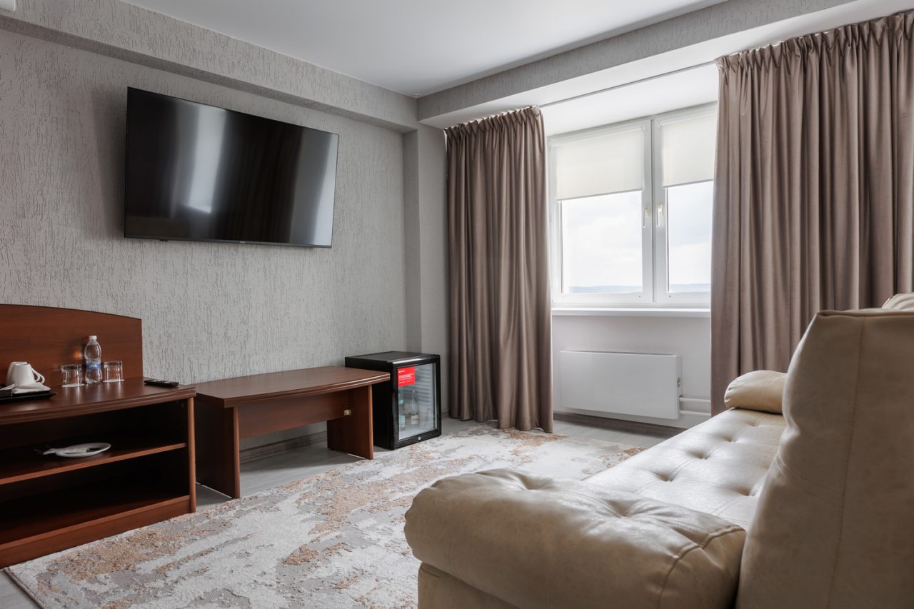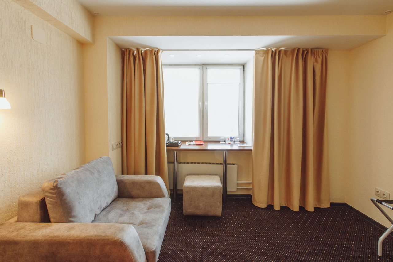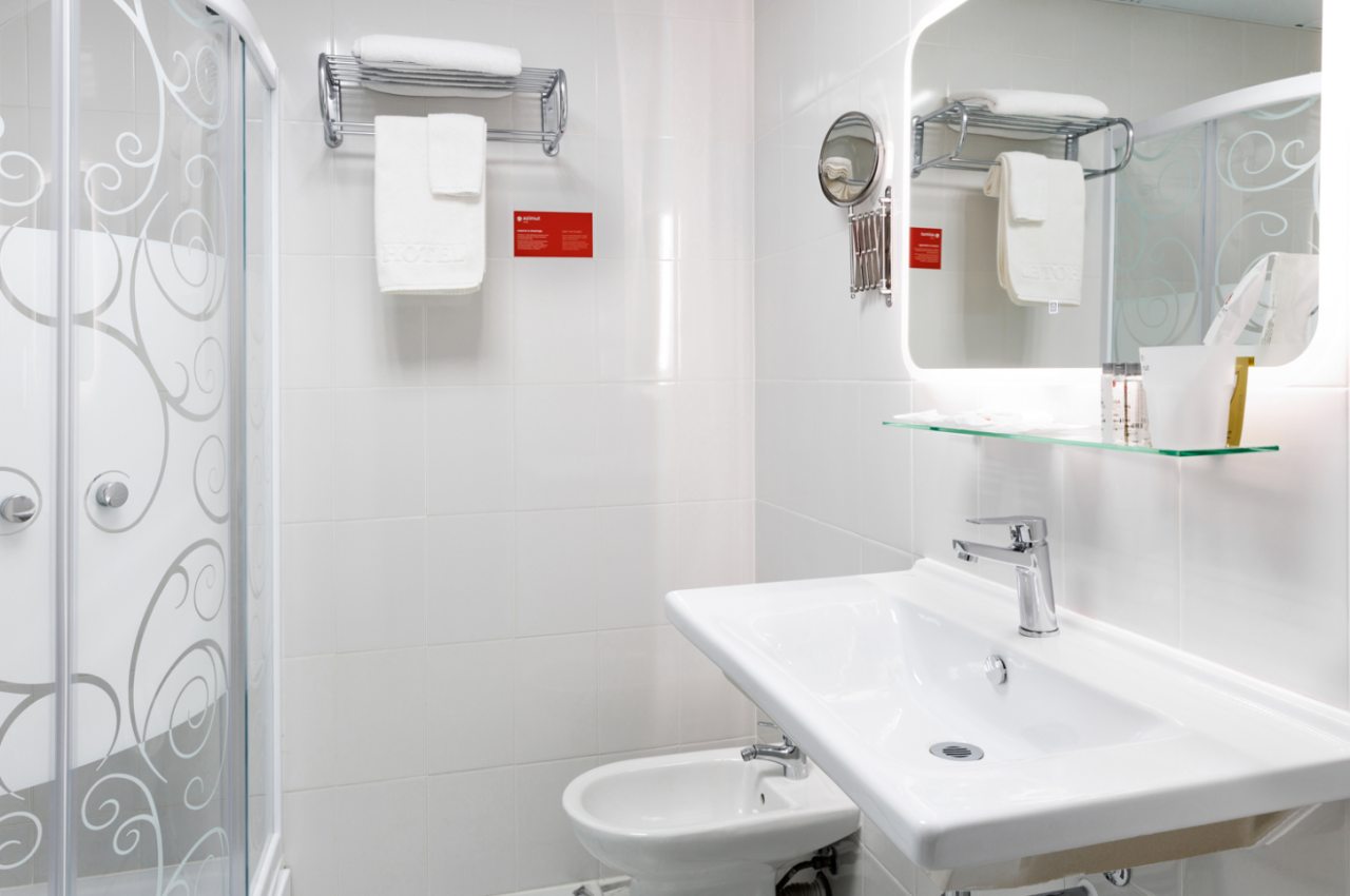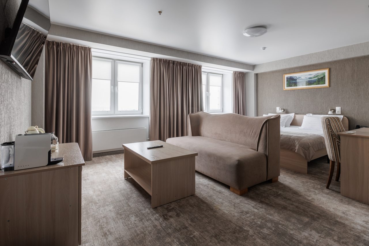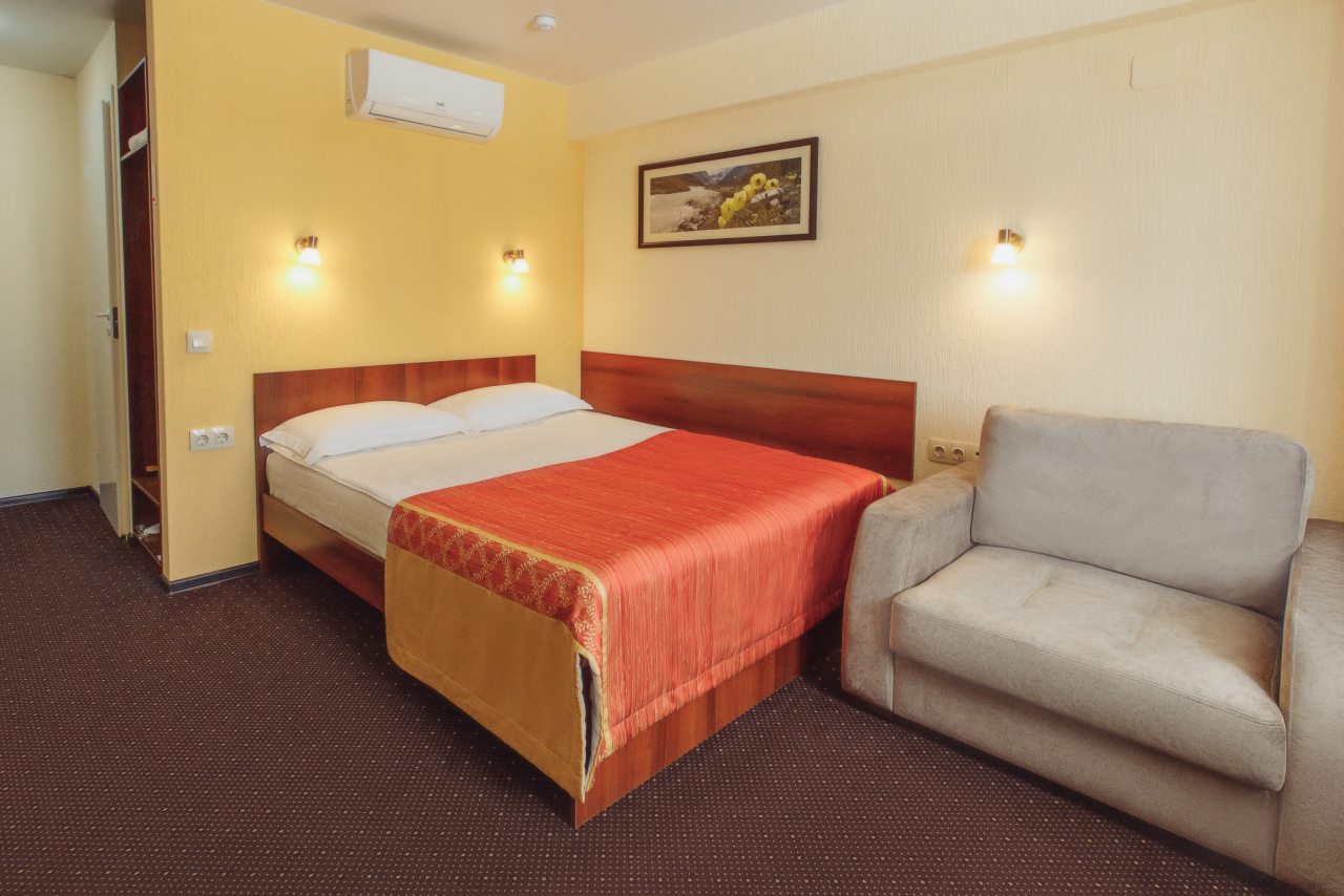 Гостиница большая, в ней предлагается много номеров и отличный сервис. На 4 звезды все соответствует, как и обещано. Мы располагались в двухместном комфорте с одной большой кроватью. В нем хороший современный ремонт, ковровое покрытие было чистым. На окнах плотные шторы, тщательно закрывающие от дневного света. Есть стол большой и зеркало, телевизор. В душе сантехника современная плюс есть бойлер, благодаря которому горячая вода была постоянна в номере.