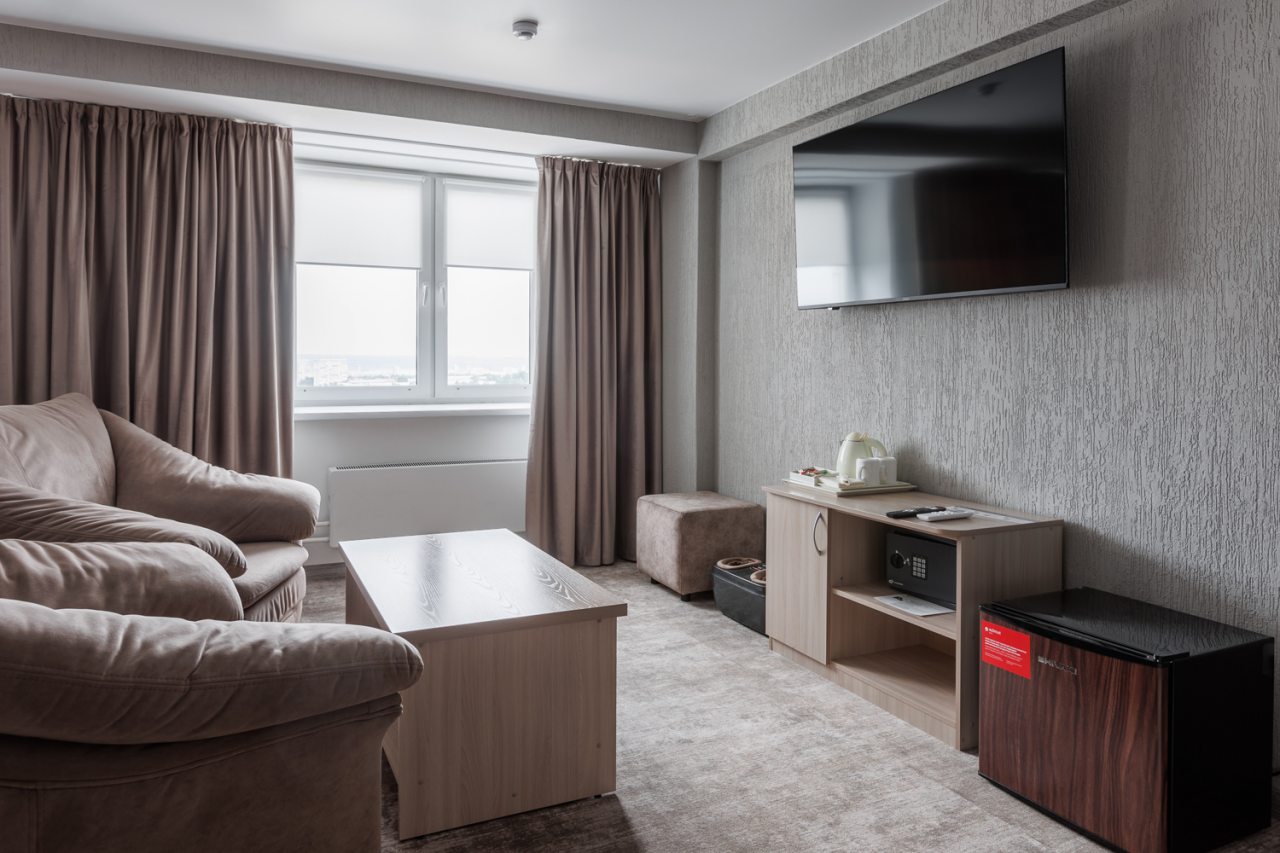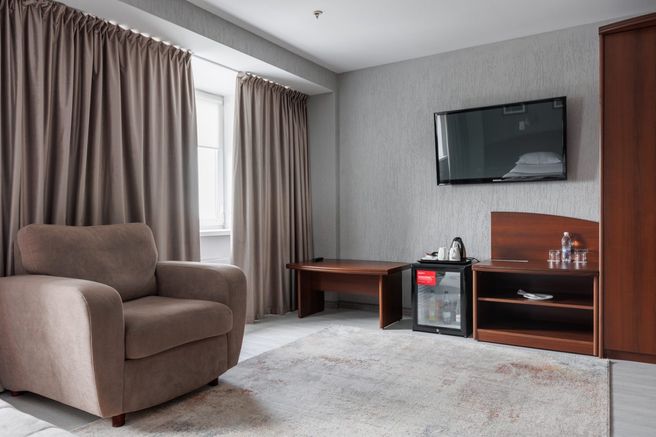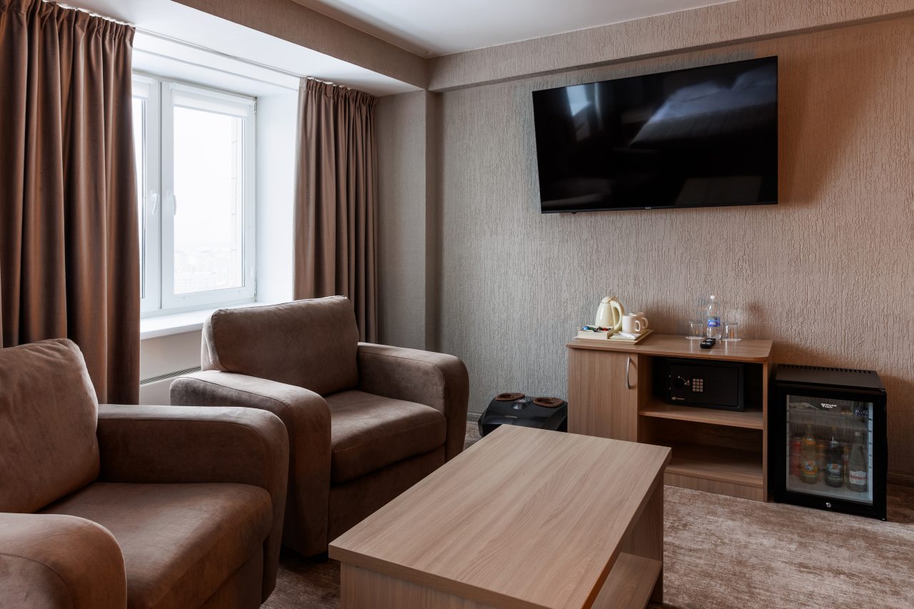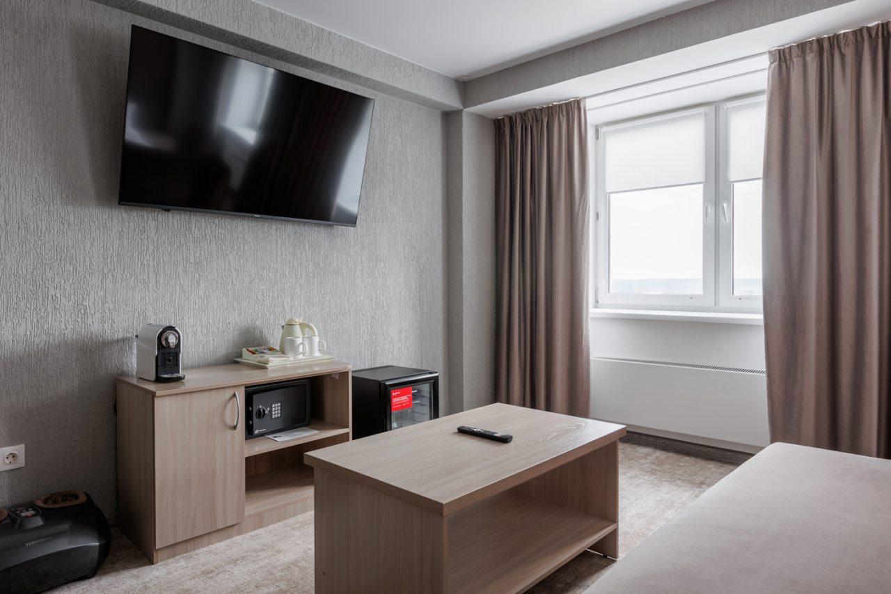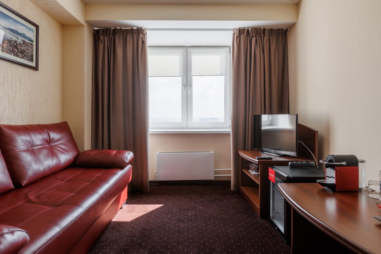 Гостиница большая, в ней предлагается много номеров и отличный сервис. На 4 звезды все соответствует, как и обещано. Мы располагались в двухместном комфорте с одной большой кроватью. В нем хороший современный ремонт, ковровое покрытие было чистым. На окнах плотные шторы, тщательно закрывающие от дневного света. Есть стол большой и зеркало, телевизор. В душе сантехника современная плюс есть бойлер, благодаря которому горячая вода была постоянна в номере.