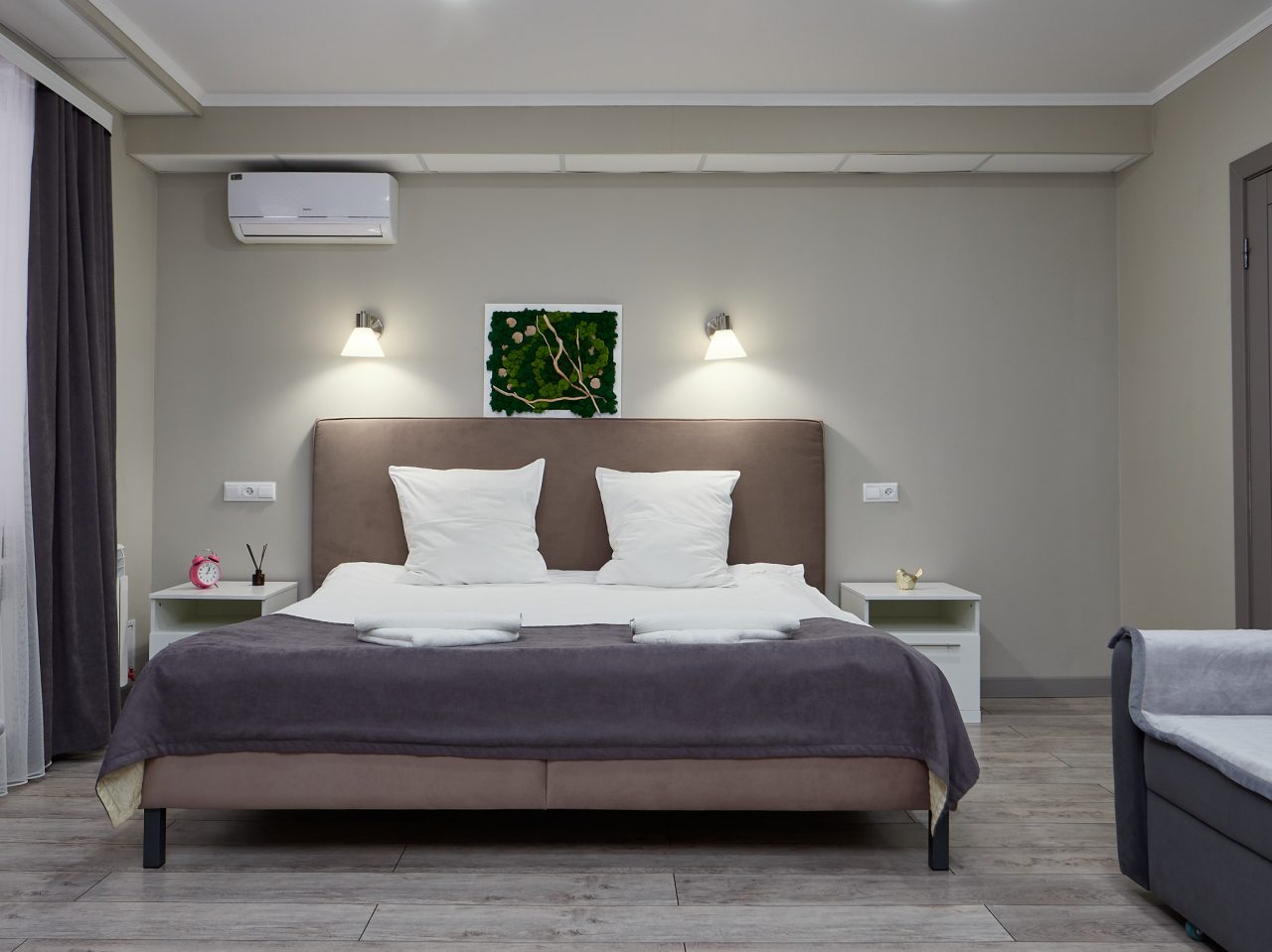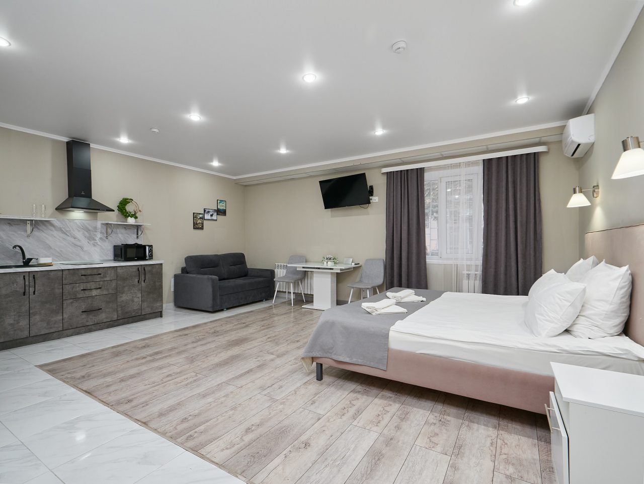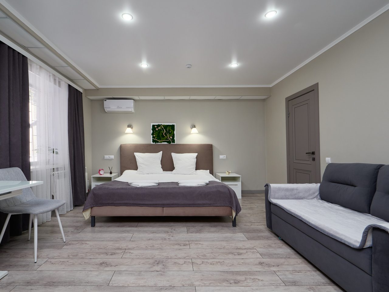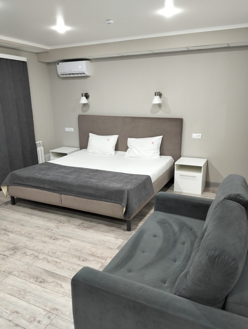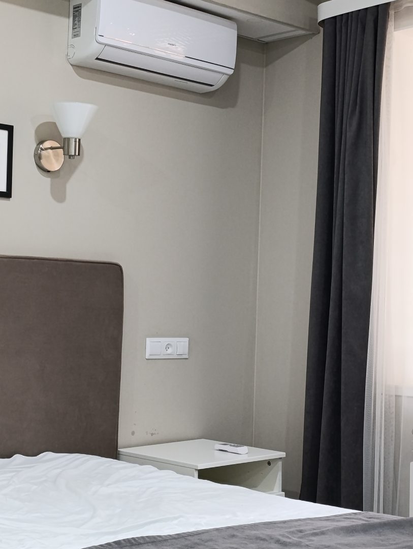 Современный стильный интерьер, чисто, есть всё необходимое. Кондиционер, тв, большая кровать, диван, кухня в номере, ванная комната. Расположение в тихом районе, шторы блэкаут, спать ничего не мешает.
