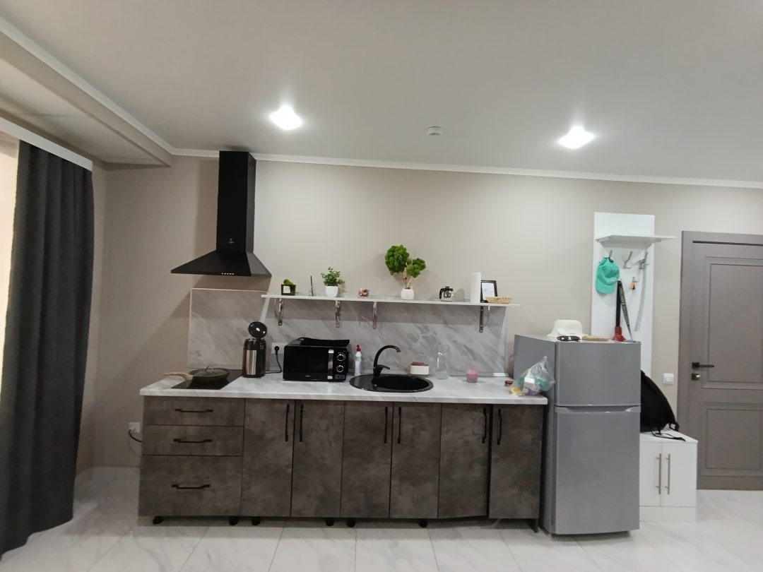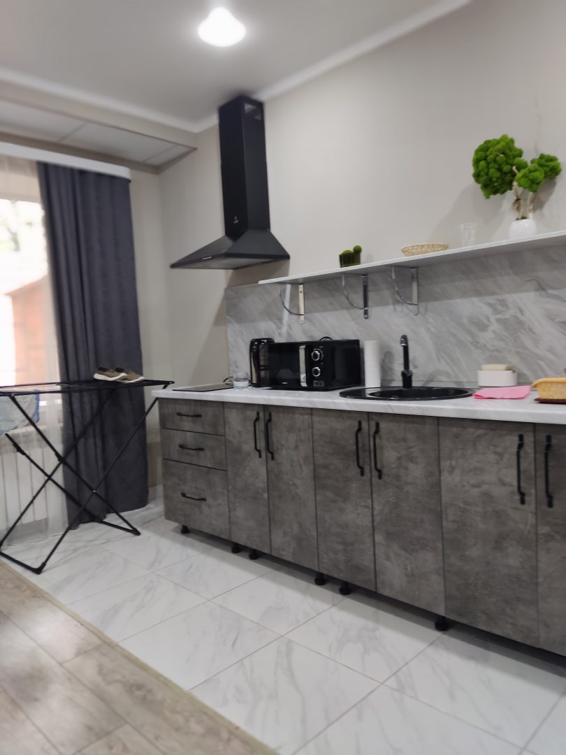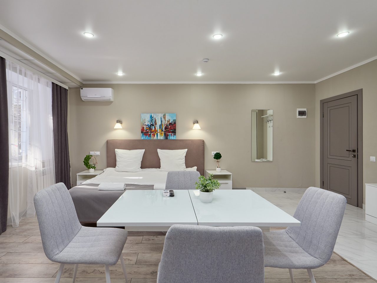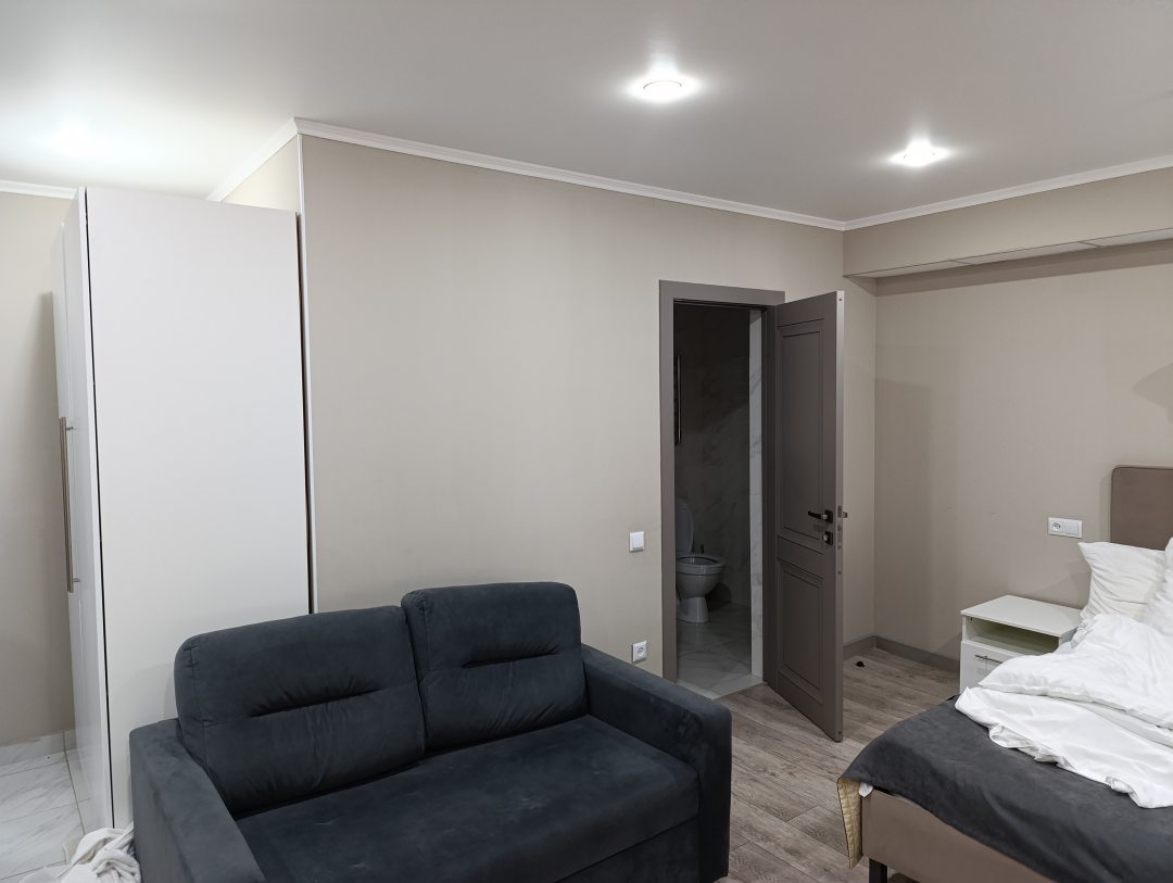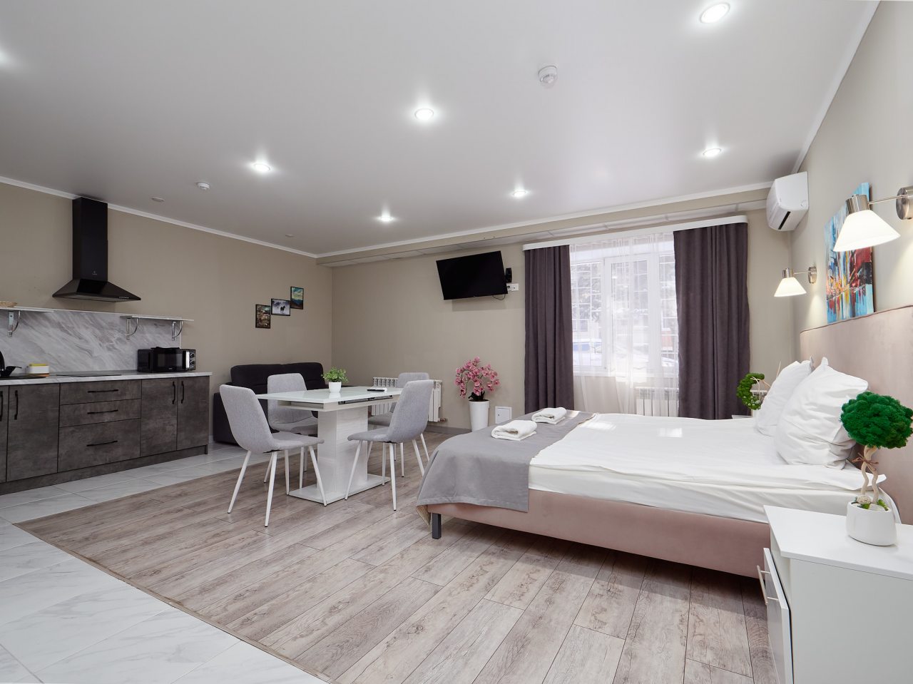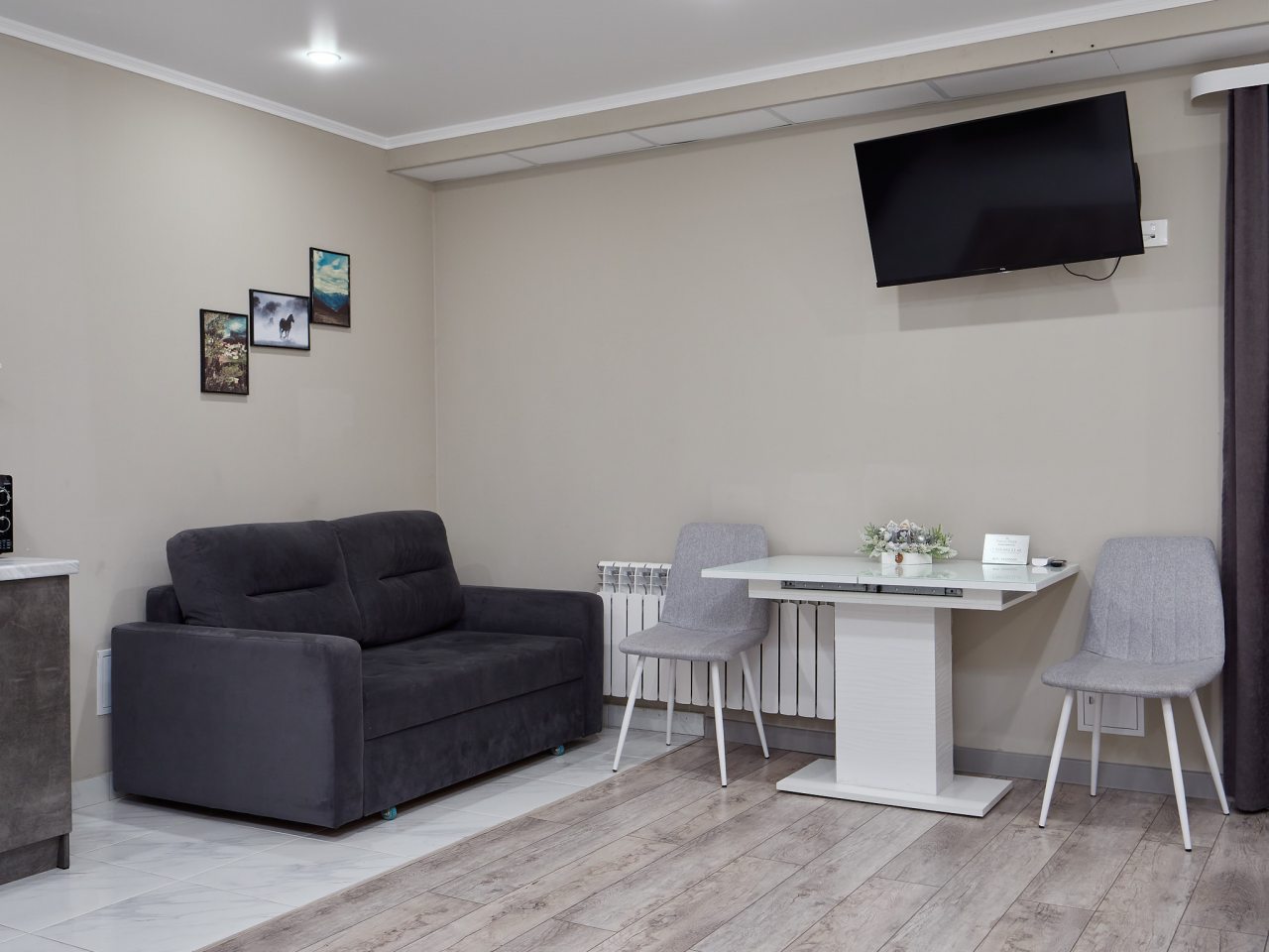Современный стильный интерьер, чисто, есть всё необходимое. Кондиционер, тв, большая кровать, диван, кухня в номере, ванная комната. Расположение в тихом районе, шторы блэкаут, спать ничего не мешает.