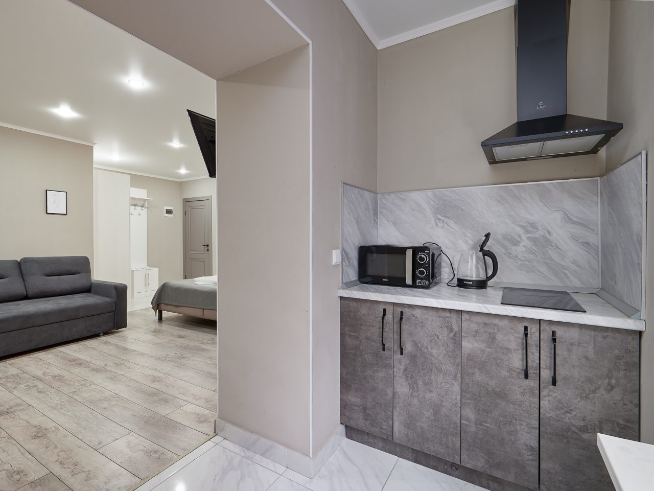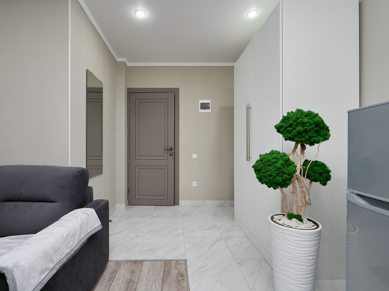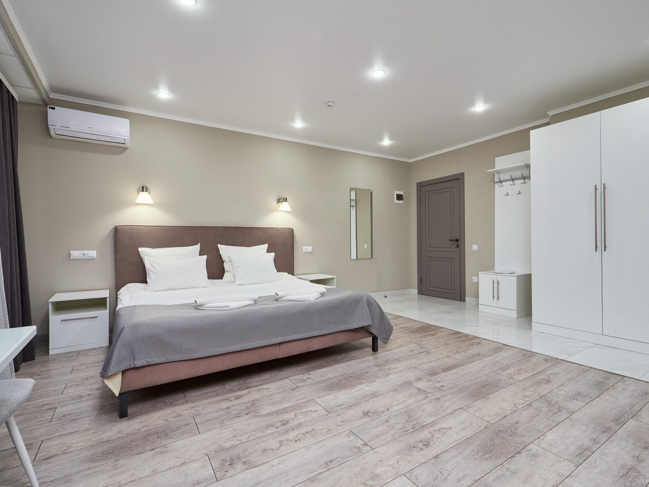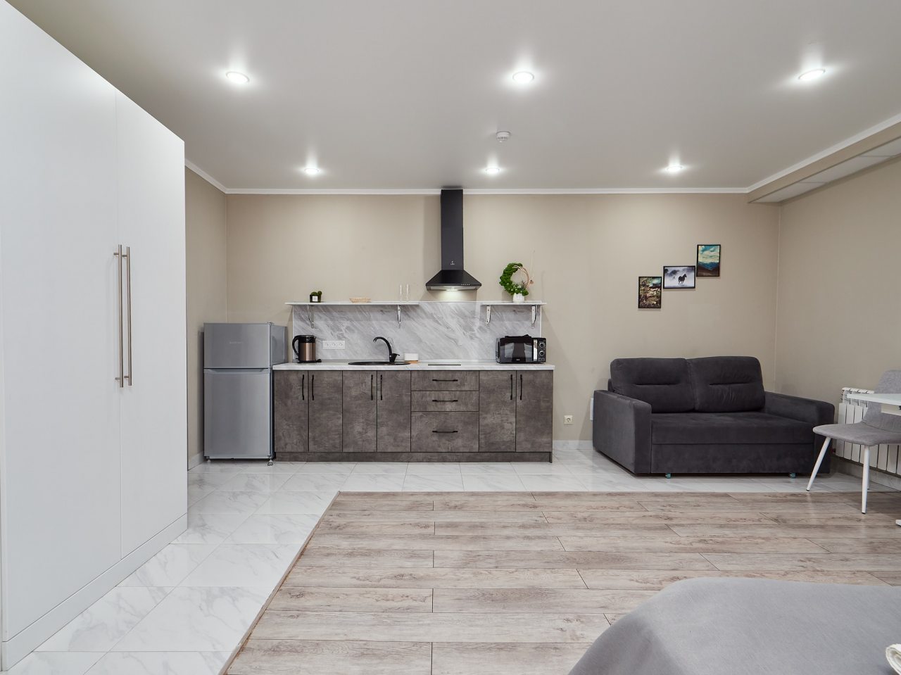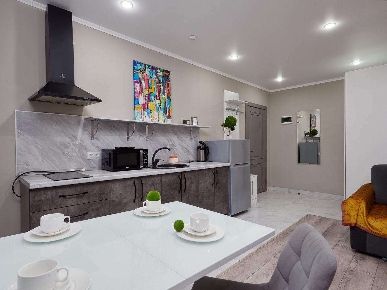 Современный стильный интерьер, чисто, есть всё необходимое. Кондиционер, тв, большая кровать, диван, кухня в номере, ванная комната. Расположение в тихом районе, шторы блэкаут, спать ничего не мешает.