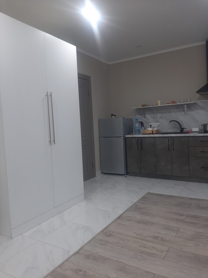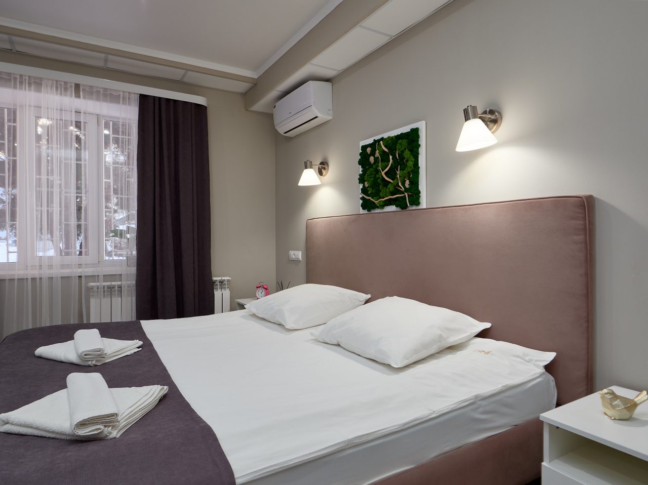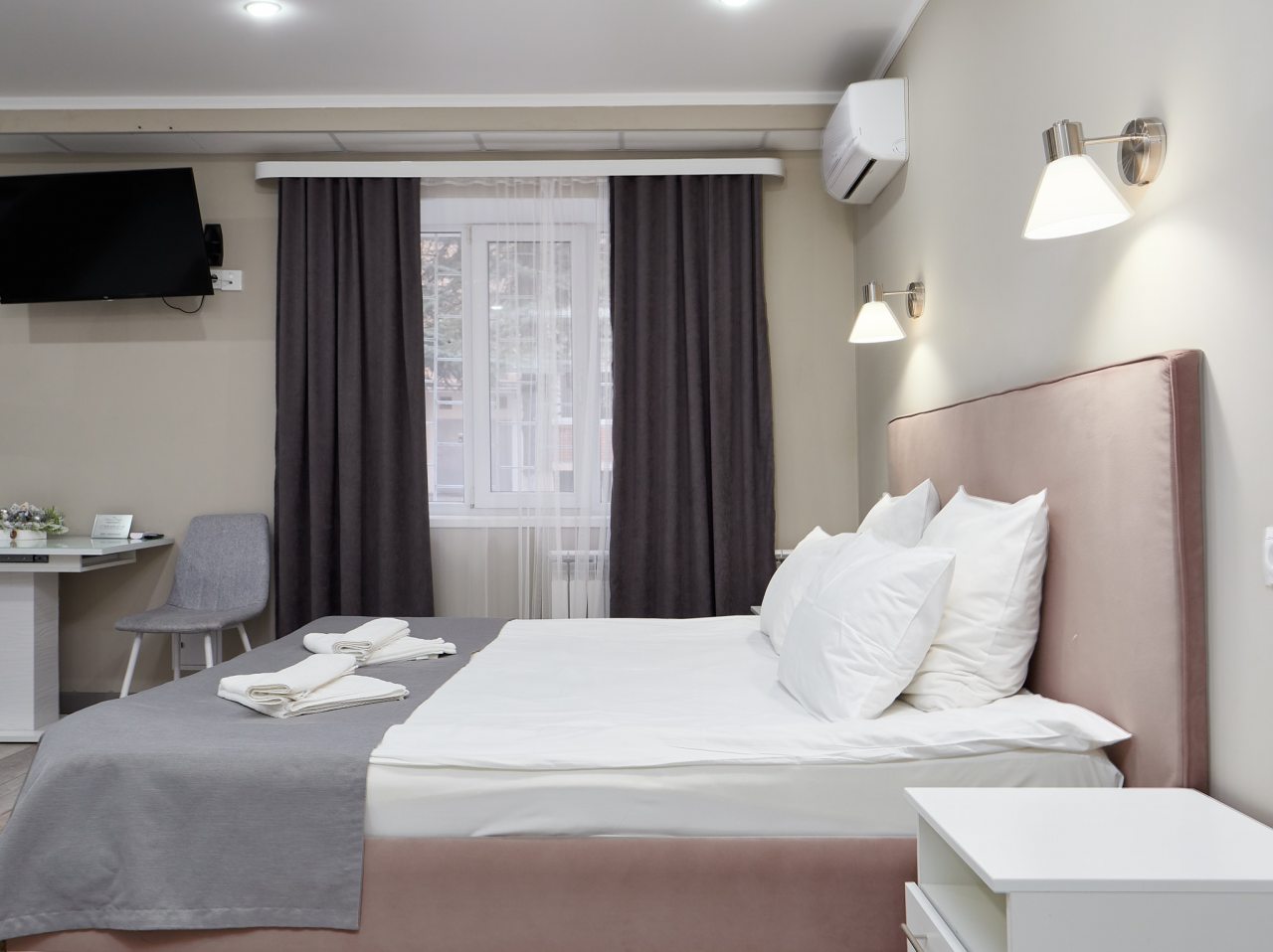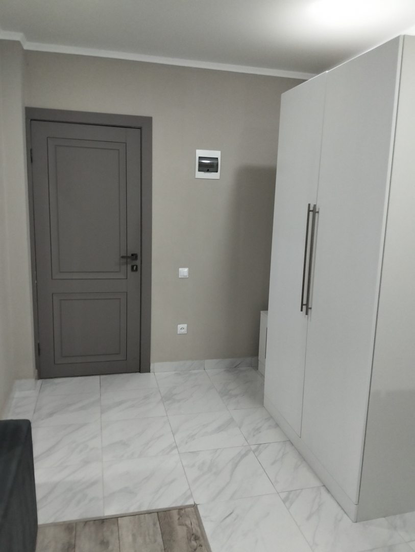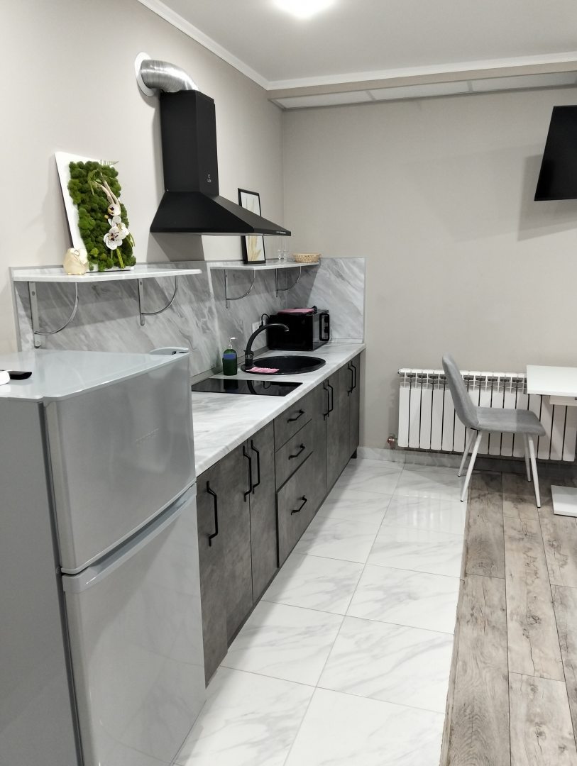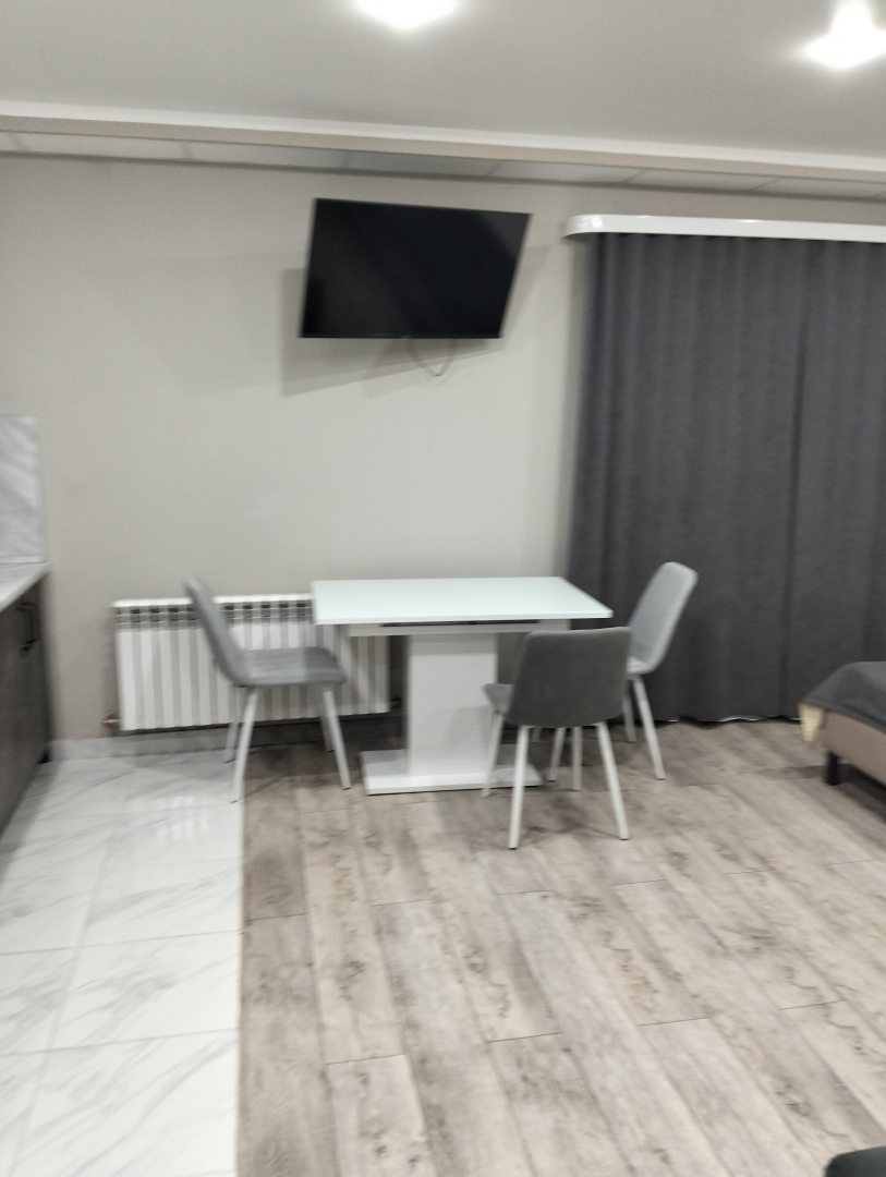 Современный стильный интерьер, чисто, есть всё необходимое. Кондиционер, тв, большая кровать, диван, кухня в номере, ванная комната. Расположение в тихом районе, шторы блэкаут, спать ничего не мешает.
