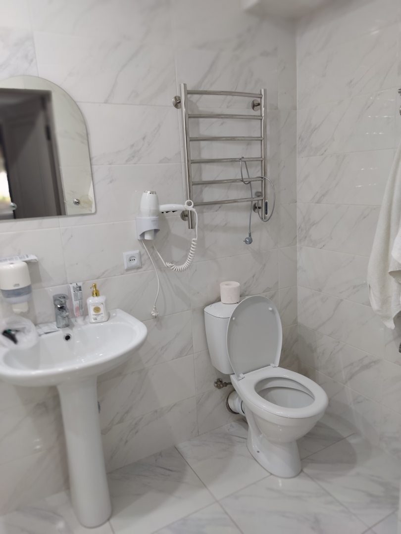 Из недостатков: апартаменты рассчитаны на 3 человек, а стульев только 2 шт., приходилось двигать стол к дивану и обратно, что немного не удобно. Не было рюмок. Только 1 рулон туалетной бумаги, нет зубной пасты и тапочек. Добавьте стул, бумагу, пасту тапочки и будет на 5+++, а так только на 5.