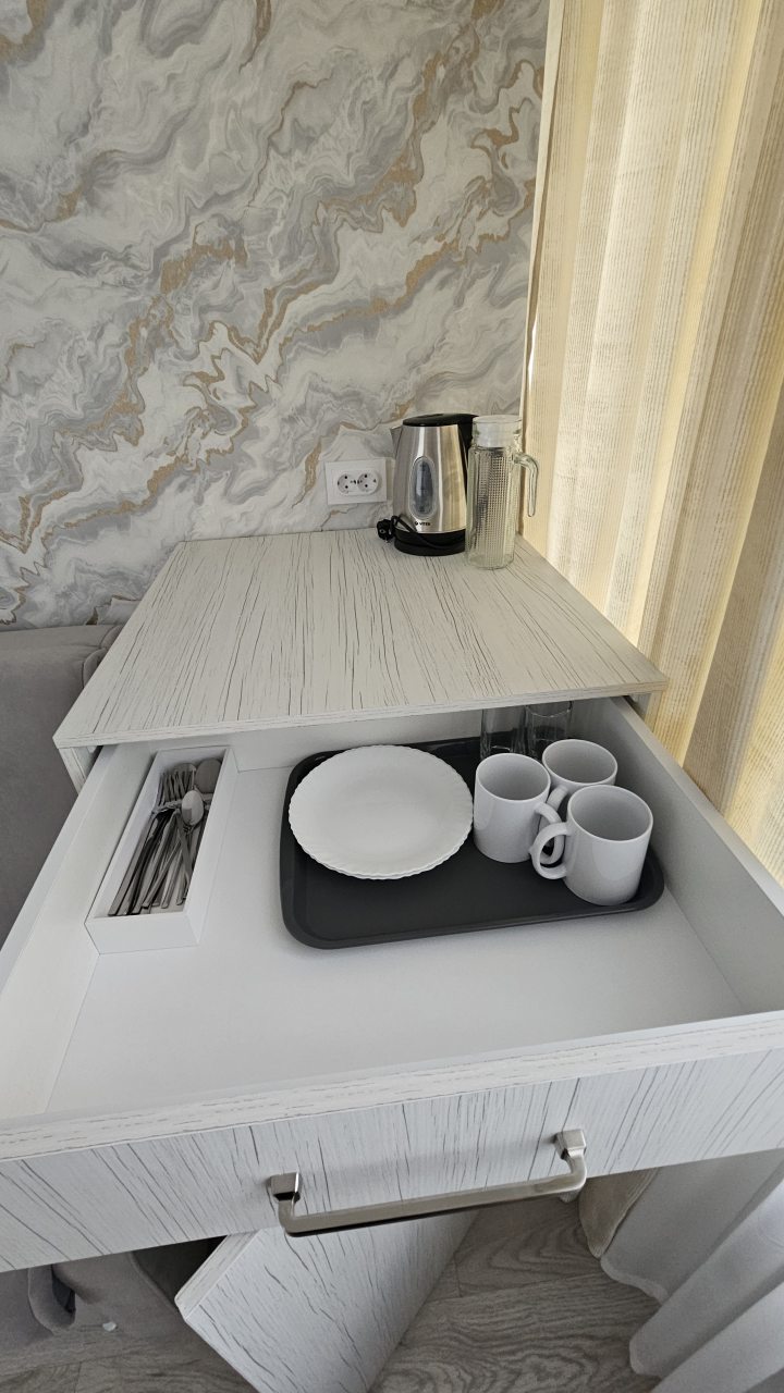 На 1м этаже - полноценная кухня-столовая с качественным ремонтом, с эл. чайником, индукционной плитой , микроволновкой , раковиной + тарелки и все необходимое для приготовления пищи.