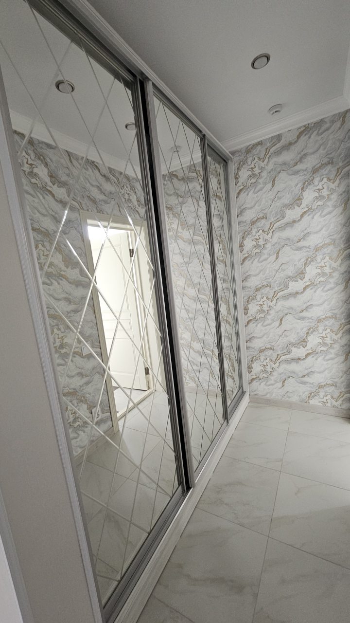 В нише - шкаф закрывающийся . В нем есть необходимое зеркало , приборы , стакан, тарелка, поднос.