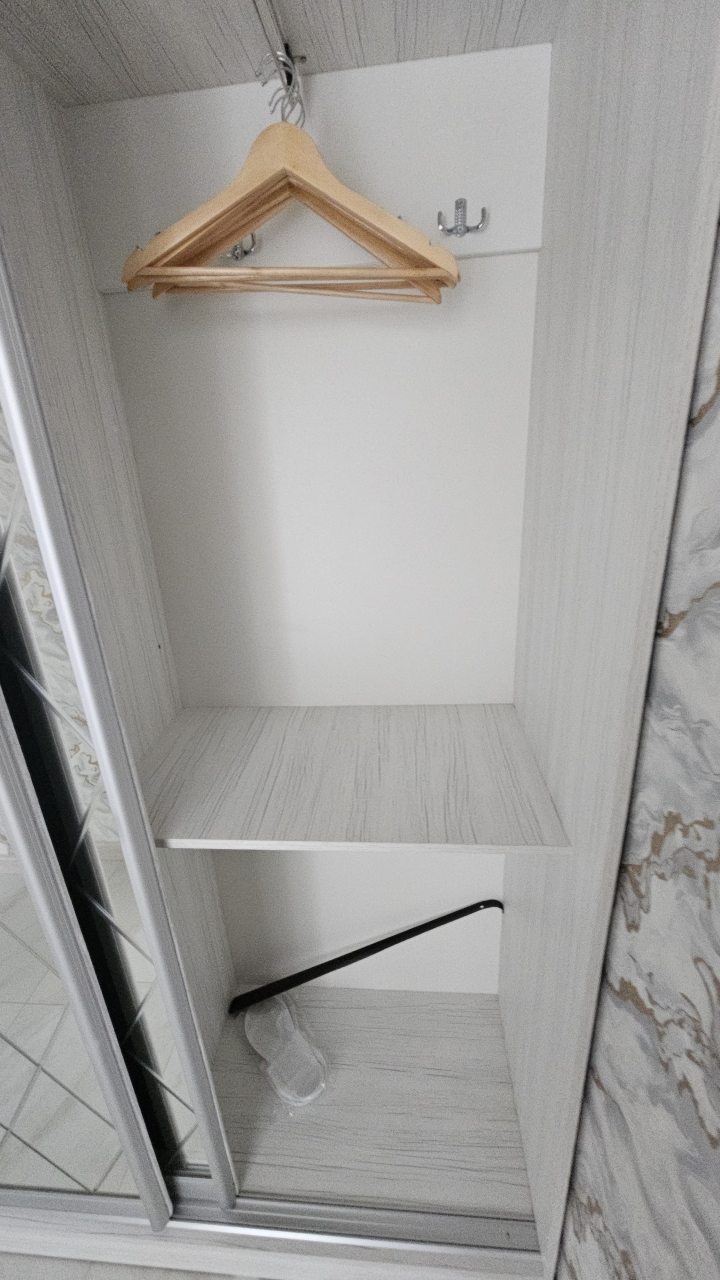Есть вешалки , доп. стеллаж , стул , полотенца.