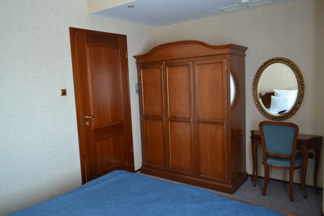 Из недостатков: мебель и сантехника старые. Требуется ремонт. На полу пыльное ковровое покрытие с пятнами.