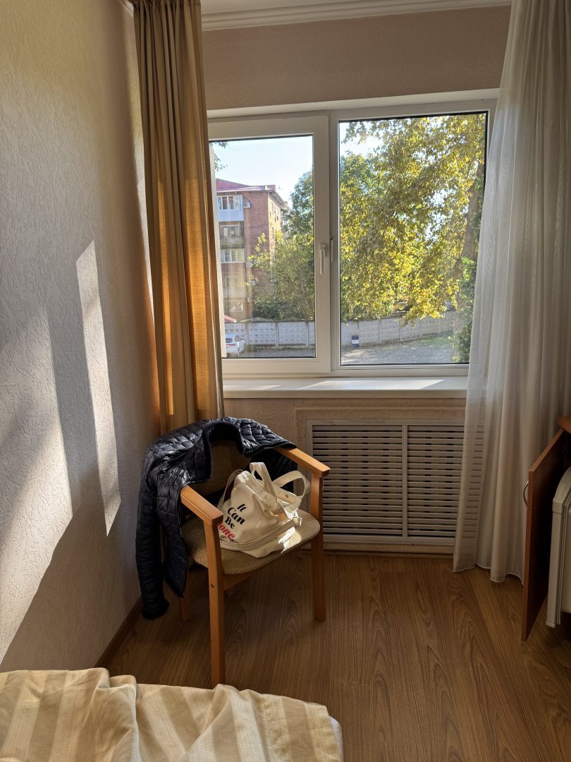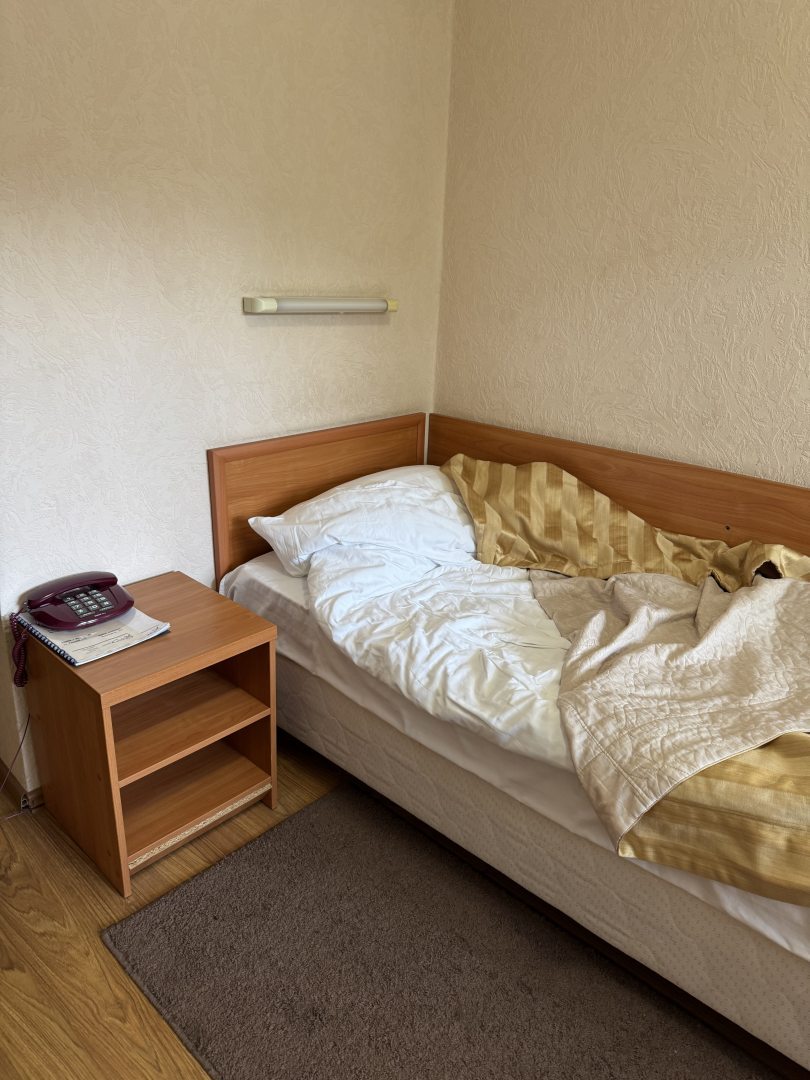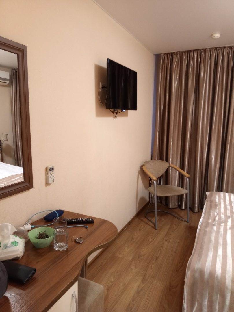 Былы в Краснодаре проездом, остановились в данном отеле. Заселили нас на третий этаж, окнами во внутренний дворик и стоянку. Номер чистый, постель свежая, матрас удобный.Ожидала увидеть конечно советскую классику по отзывам, но вполне приемлемо. Есть холодильник, телевизор, мыльные принадлежности. Брали двухместный за 3000 т.р. В коридоре есть кулер, чайник и микроволновка.
