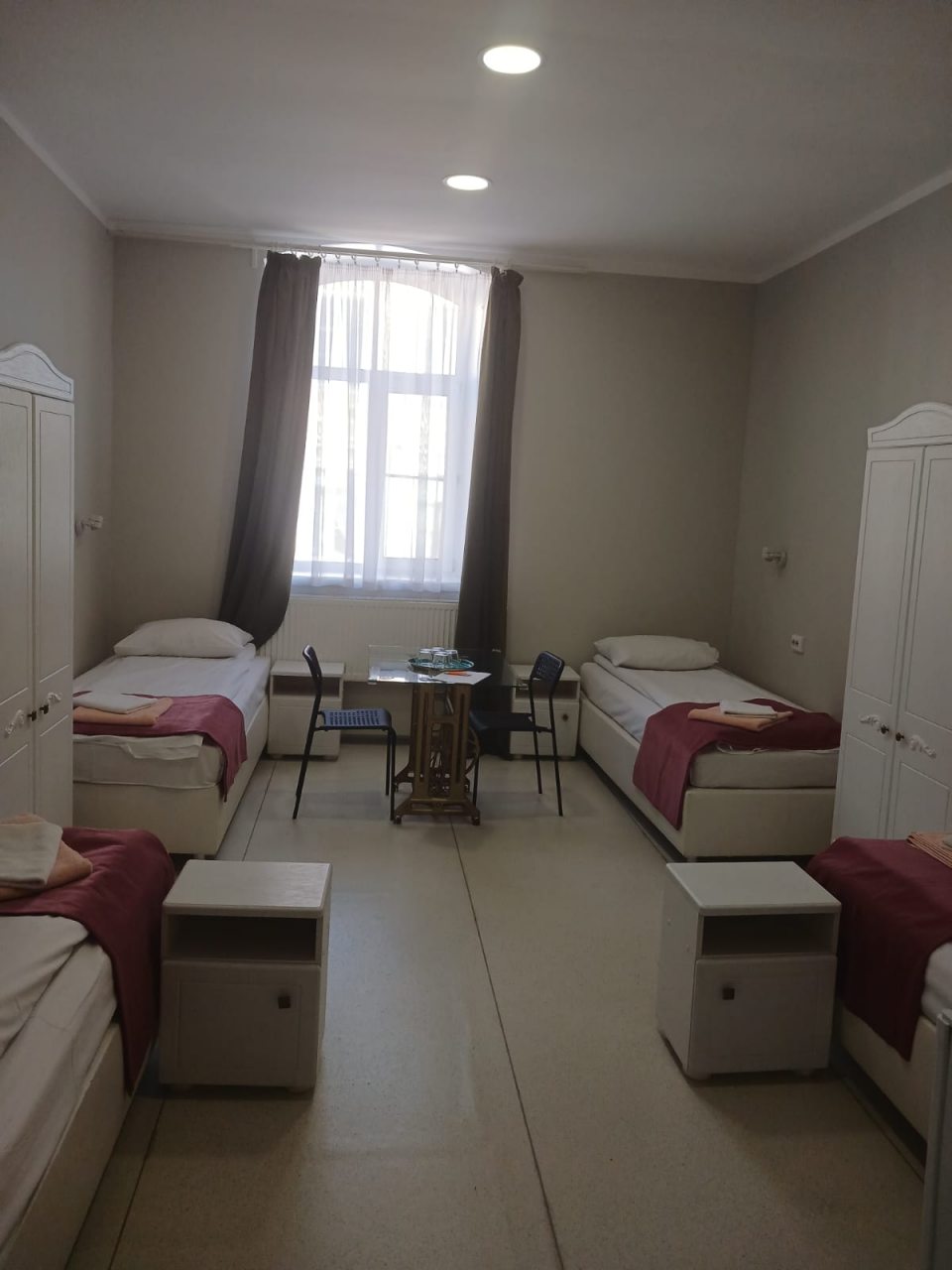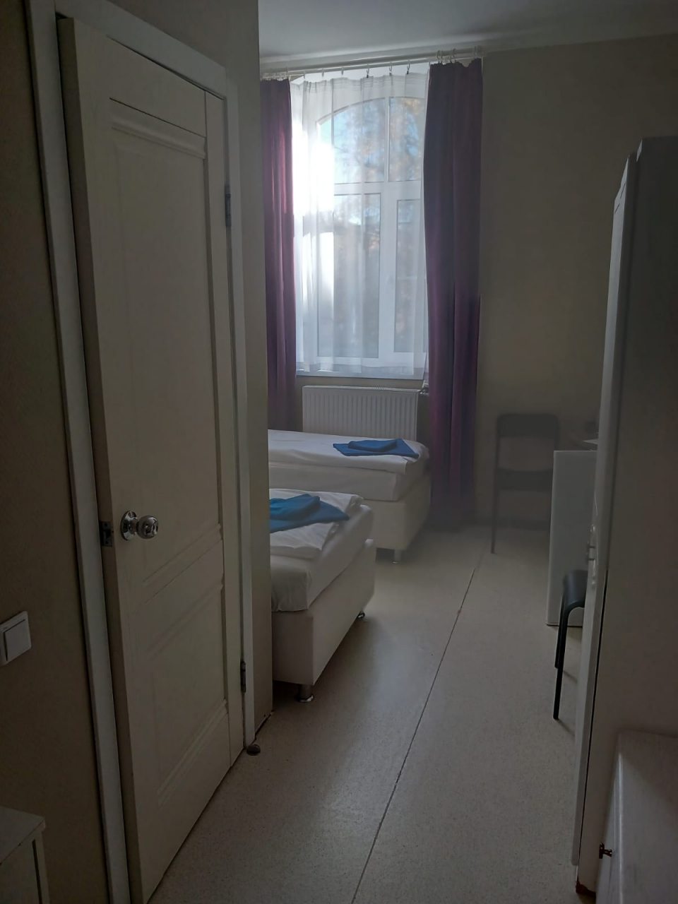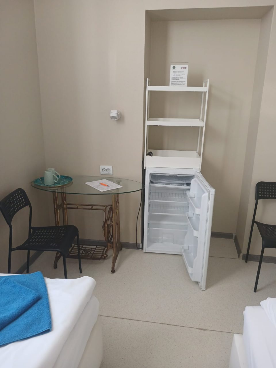 Гостиница находится в тихом месте, на общественном транспорте добираться удобно. Номера расположены на втором этаже, куда ведет лестница. В холле зона ожидания с диванами, кулером, микроволновой печью и шикарной кофемашиной. 4х местные номера довольно просторные. Есть телевизор, прикроватный тумбочки (не всегда по количеству кроватей), прикольный столик со стеклянной столешницей на чугунной раме от швейной машинки с ножным приводом, два стула, пара платяных шкафов, четыре кровати. В санузлах навесные унитазы, душевая кабина с текстильной шторкой, умывальник, зеркала в деревянной раме-полочке. Номера чистые, оборудование рабочее. На просьбы сотрудники отеля отвечают вежливо и быстро.