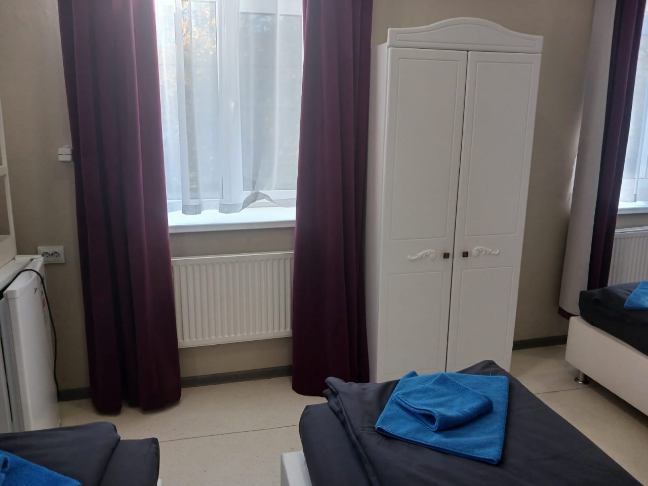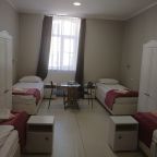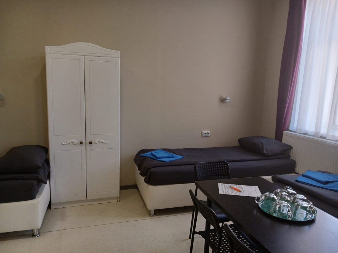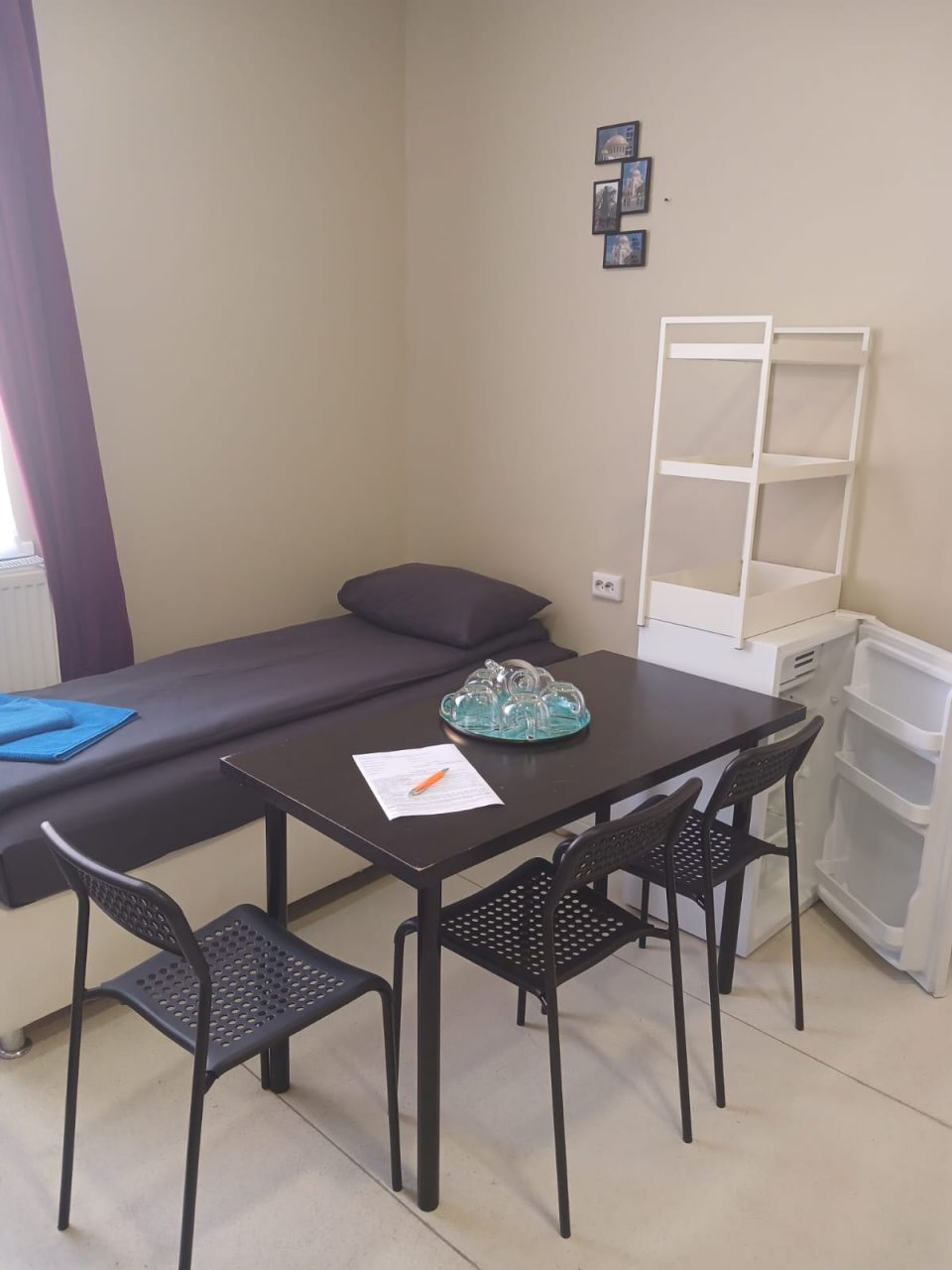 Гостиница находится в тихом месте, на общественном транспорте добираться удобно. Номера расположены на втором этаже, куда ведет лестница. В холле зона ожидания с диванами, кулером, микроволновой печью и шикарной кофемашиной. 4х местные номера довольно просторные. Есть телевизор, прикроватный тумбочки (не всегда по количеству кроватей), прикольный столик со стеклянной столешницей на чугунной раме от швейной машинки с ножным приводом, два стула, пара платяных шкафов, четыре кровати. В санузлах навесные унитазы, душевая кабина с текстильной шторкой, умывальник, зеркала в деревянной раме-полочке. Номера чистые, оборудование рабочее. На просьбы сотрудники отеля отвечают вежливо и быстро.