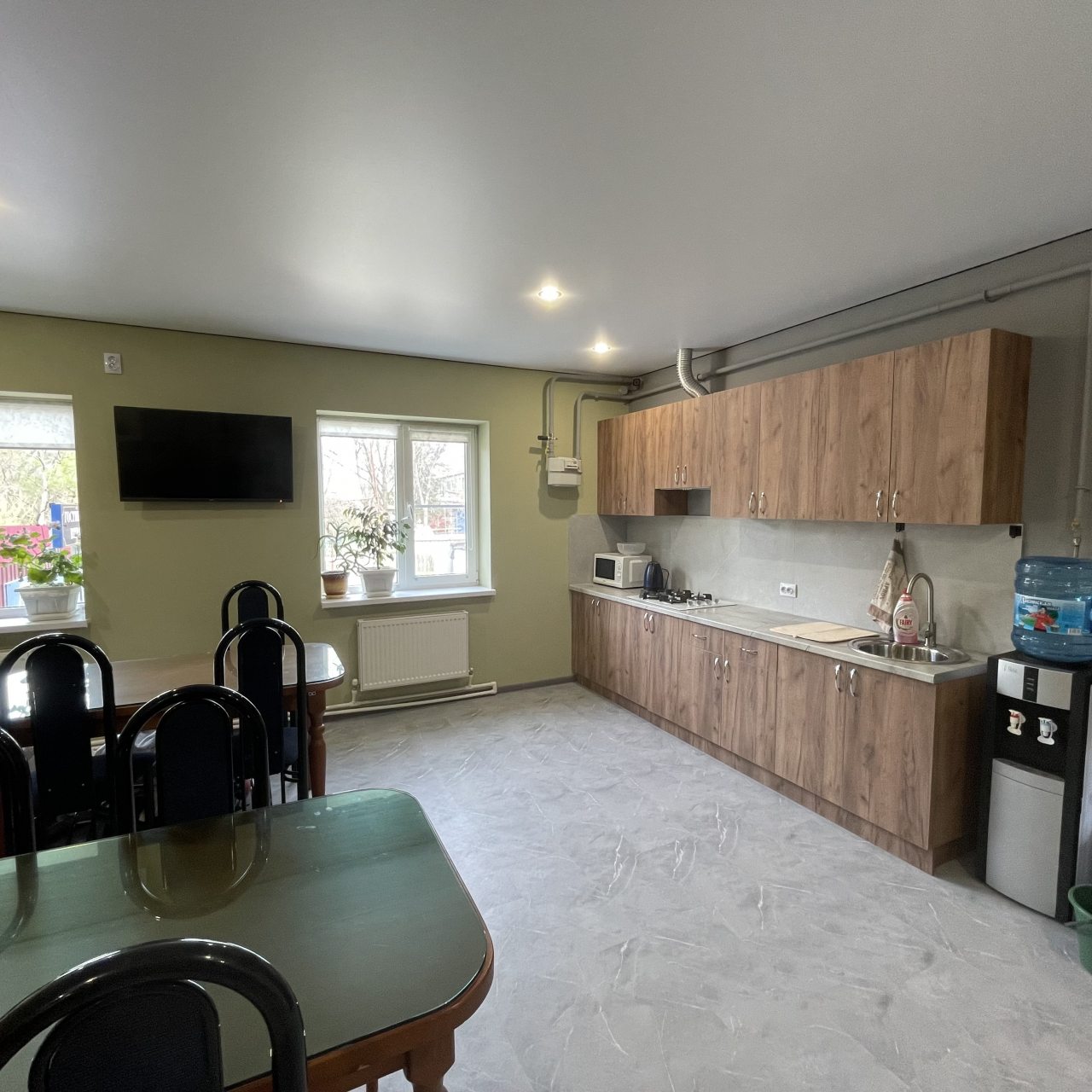 Есть кухня со всем необходимым (микроволновка,газовая плита,холодильник,раковина с моющим,вся необходимая посуда,вилки,ножи).Столы,стулья,телевизор..В общем полноценная столовая