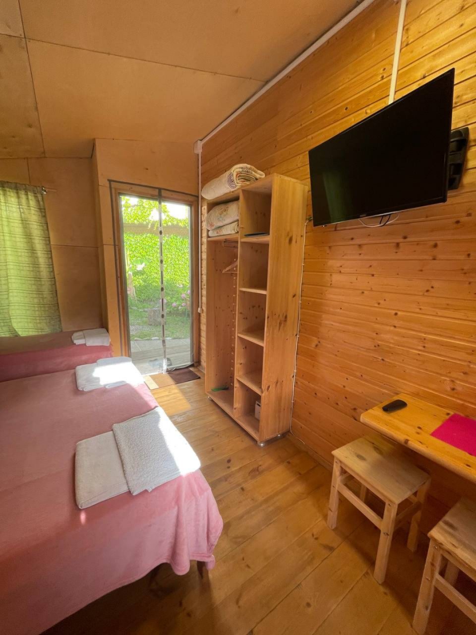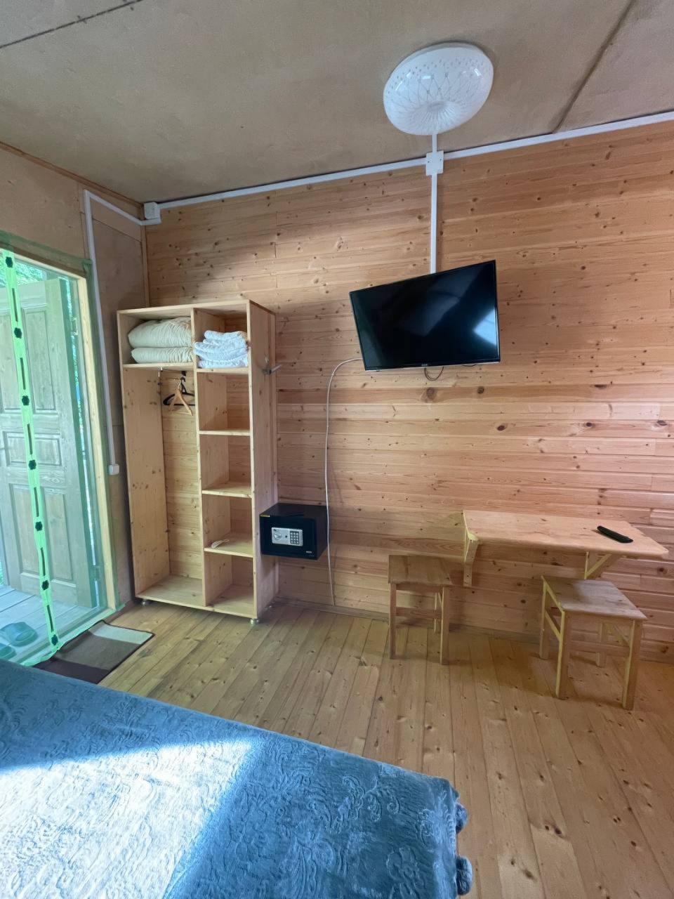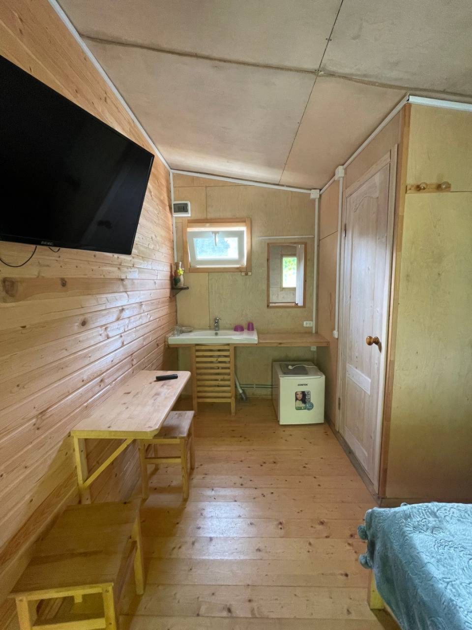 Мы снимали коттедж. Напротив каждого есть столик с лавками ,где можно посидеть и отдохнуть вечером ( можно заказать еду из бара). Бар Тоже очень понравился!! Все очень приветливые. Цена-качество всё отлично! Очень вкусный шашлык)