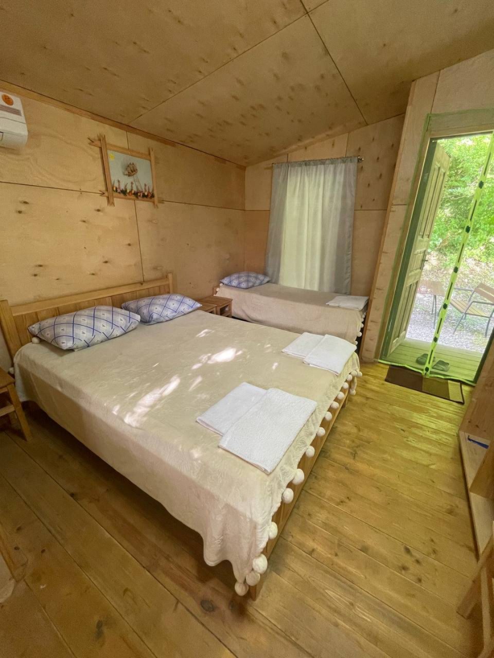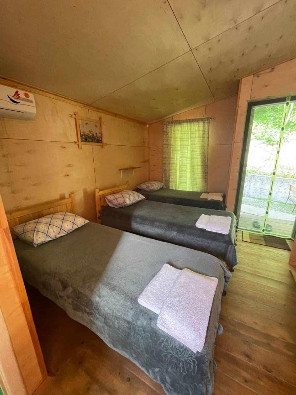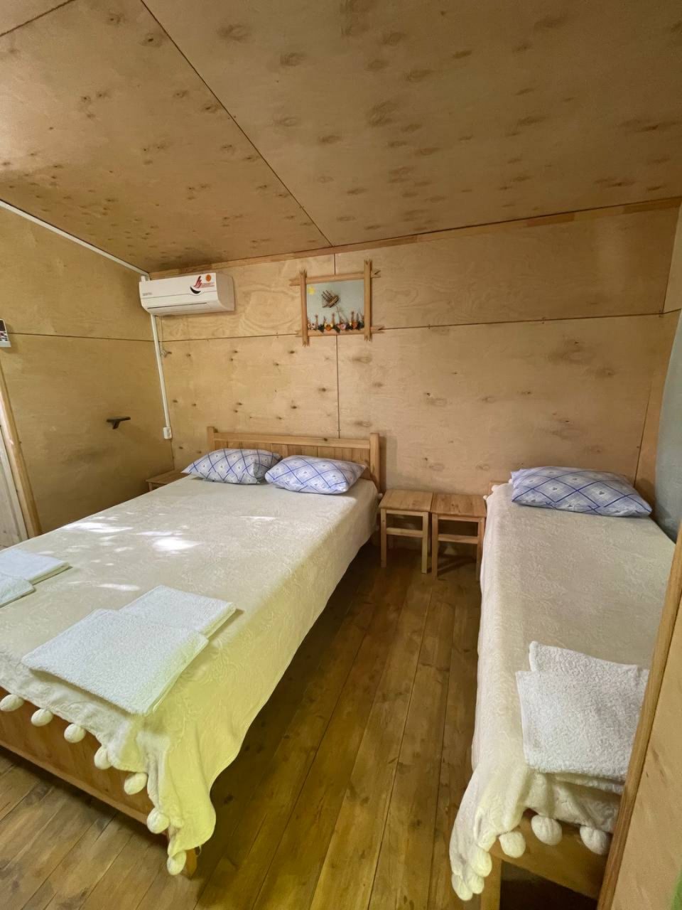 Мы снимали коттедж. Напротив каждого есть столик с лавками ,где можно посидеть и отдохнуть вечером ( можно заказать еду из бара). Бар Тоже очень понравился!! Все очень приветливые. Цена-качество всё отлично! Очень вкусный шашлык)