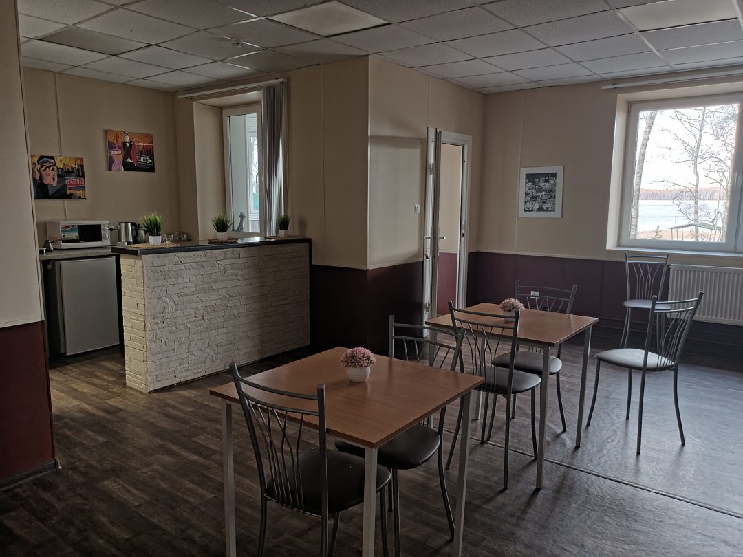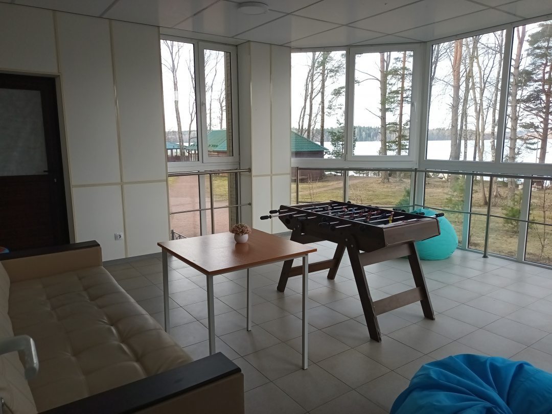 Отличный отель.Чистые ,уютные номера.Вид из окна на озеро был у нас-красота.Территория большая,ухоженная.Много беседок с мангалами.Общая кухня на каждом этаже.Все необходимое есть на ней.Есть детская площадка,футбольное поле.