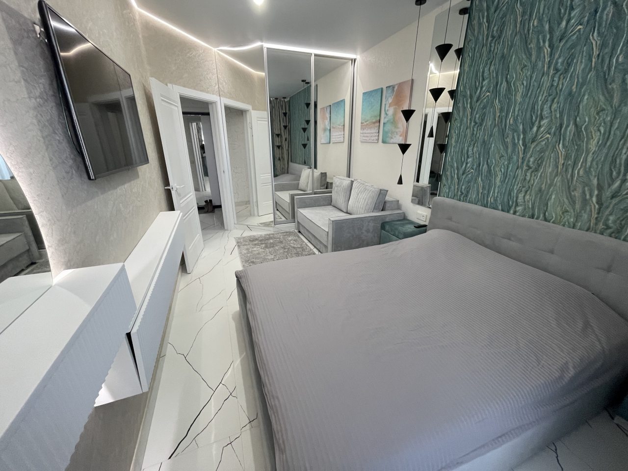 Квартира в серо-бирюзовых тонах, очень приятно смотрится. Чисто, комфортно, светло. Всё нужное для проживания есть и даже больше! Кровать, телевизор, доступ в интернет, выход на закрытый балкон. В ванной комнате зеркало и фен, очень удобно. Поблизости продуктовые магазины и рестораны. Советую!