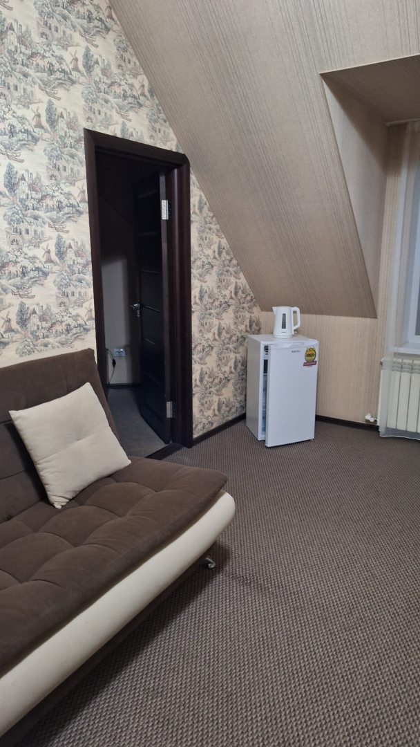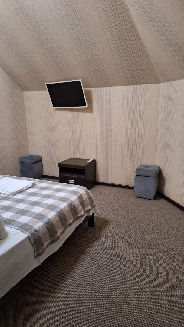 Для путешественников удобно расположен. Большой номер. Чисто, тепло, уютно. В номере холодильник, чайник, телевизор. Стаканы, кружки, ложки. Все блестит :) Рядом с отелем кафе. Вкусно. Будем останавливаться в этом отеле.