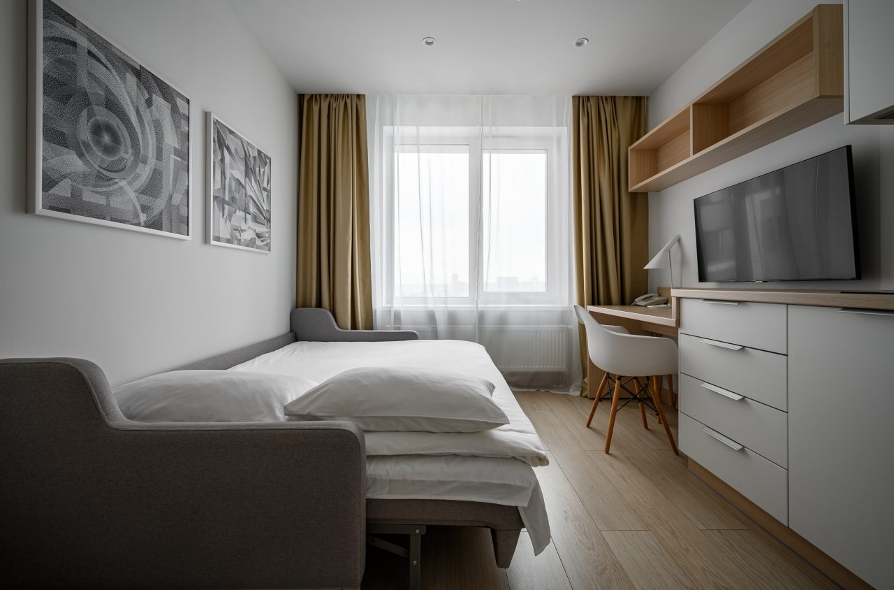 Останавливались на одну ночь — очень довольны отелем и условиями размещения. Красивый и современный отель, номера чистые и просторные . Брали 2 номера standard — были просторные номера с двуспальной кроватью (единый большой матрас и огромное одеяло ). В номере есть холодильник, чайник, большой телевизор, все продумано до мелочей ! Порадовало наличие тапочек и одноразовых гигиенических наборов. Мы жили на 18 этаже с видом на город, а дети -подростки с видом на остров мечты !Соседей не слышали — шумоизоляция хорошая)!спали прекрасно! В здании есть рестораны, кафе ,фитнес ,магазин дикси , кофейня! А также переход через дорогу и выход в метро (шаговая доступность ) это очень удобно ,спустился на лифте и на улицу выходить не нужно )))! Персонал очень доброжелательный, внимательный Нам все очень понравилось!!! Спасибо!