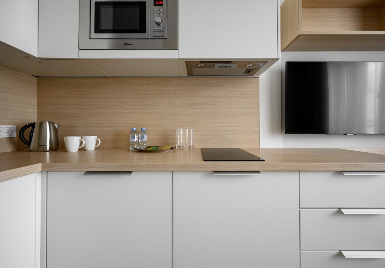 Из недостатков: некоторые мелочи портят впечатление об отеле: отличный вид из окна, но сами окна снаружи требуют чистки хорошая, удобная мебель, но диван в пятнах-тоже требует чистки две ванных комнаты, но нет гигиенического душа рядом с унитазом платная стоянка, но тесная и стоимость за сутки оказалась не 1000, как указывалось на сайте, а 1500. Завтраки тоже стоят 800, вместо 600. В номер завтрак не доставляют, либо завтракать в кафе на 2 этаже, либо брать из кафе в контейнерах с собой. В итоге решили сами готовить-меньше заморочек и все для этого в номере есть (холодильник, плита, посуда). Телефон для связи есть, но по нему никто не отвечает, как оказалось у них там совсем другой номер для связи на визитке. У нас возникла проблема с поиском стоянки когда приехали, дозвониться не смогли, а ресепшн на 13 этаже, лифт не сразу приезжает, вобщем понервничали, прежде, чем заселиться.