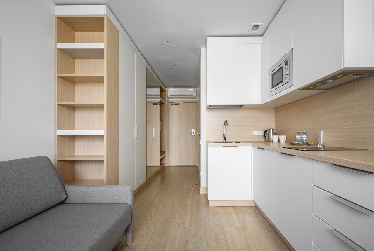Номер чистый, очень приятно, все как на фото, плюс своя кухня в номере. Тапочки, гигиенические наборы, чай, кофе, вода - когда едешь налегке очень спасают.