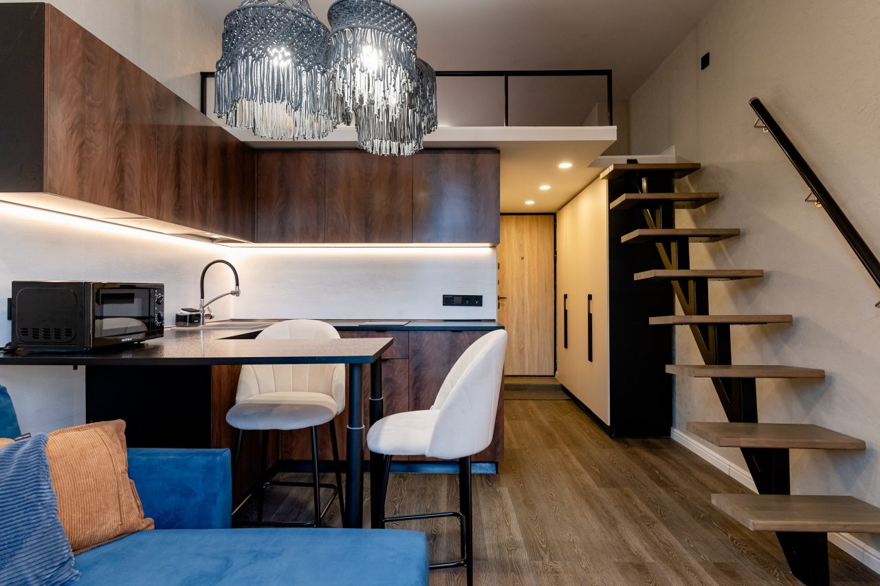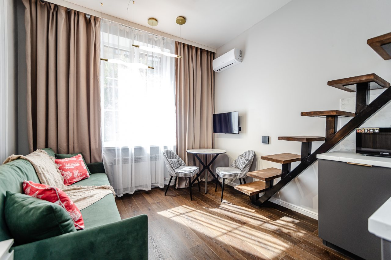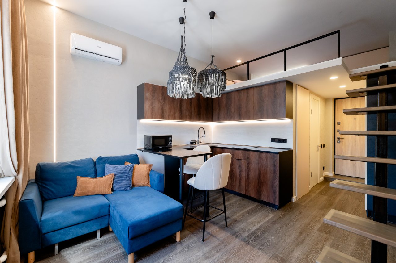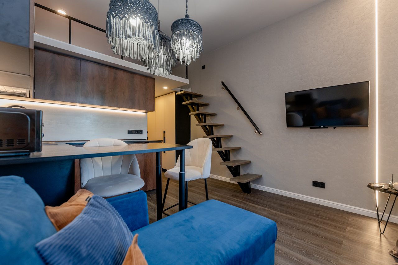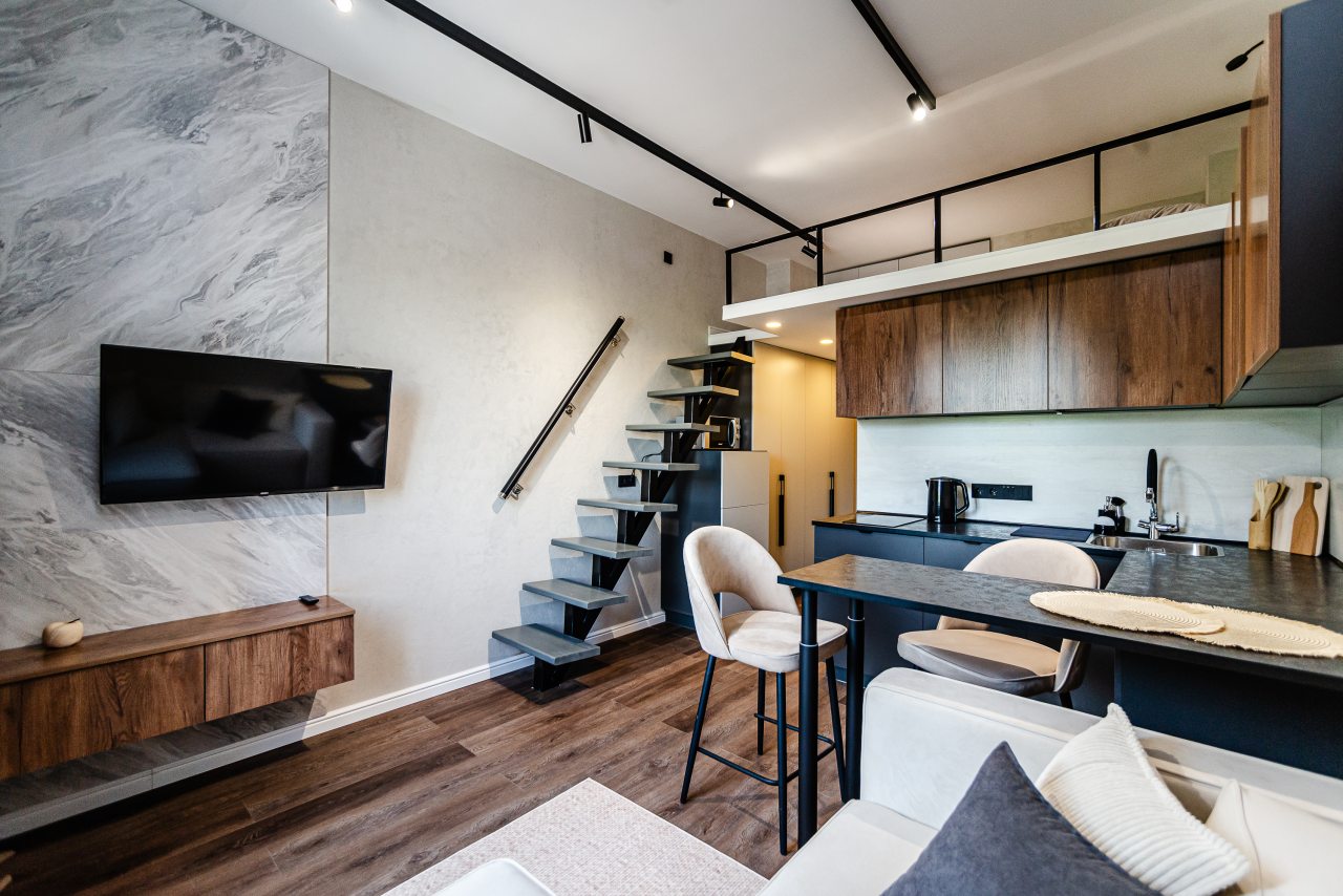 Квартира нам понравилась сразу. Мы заселились быстро, без каких-либо проблем. Хорошая обстановка, есть вся необходимая техника. Мы впервые останавливались в двухуровневых апартаментах, но нам все понравилось. Также расположение удобное. Есть парковка, что для нас было важно.
