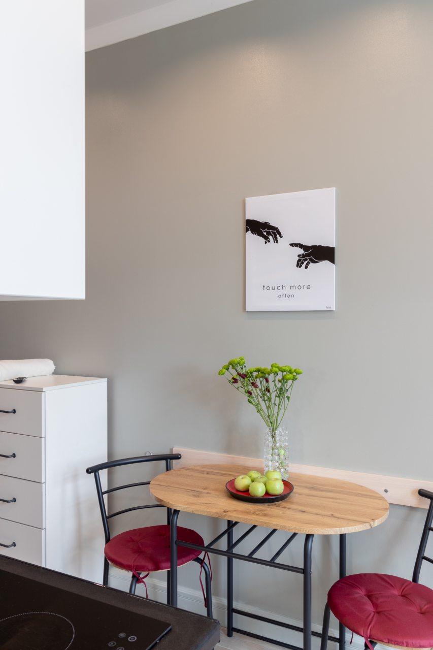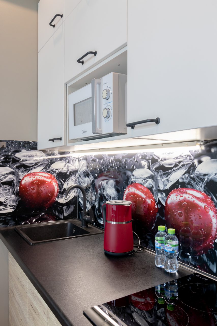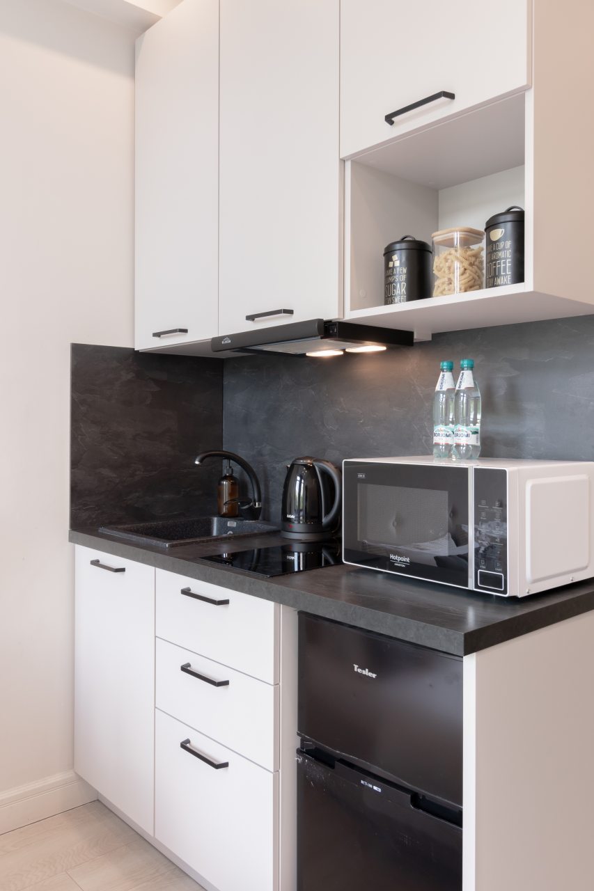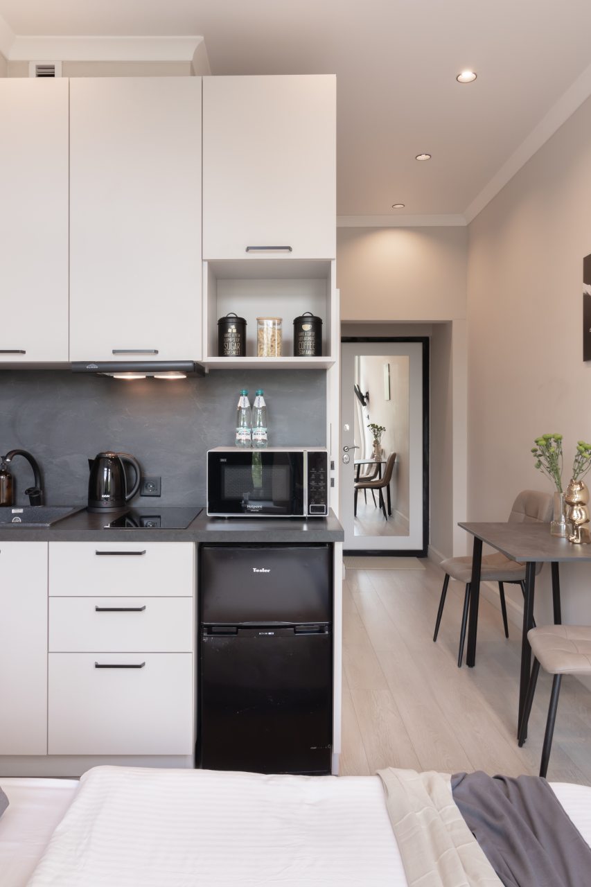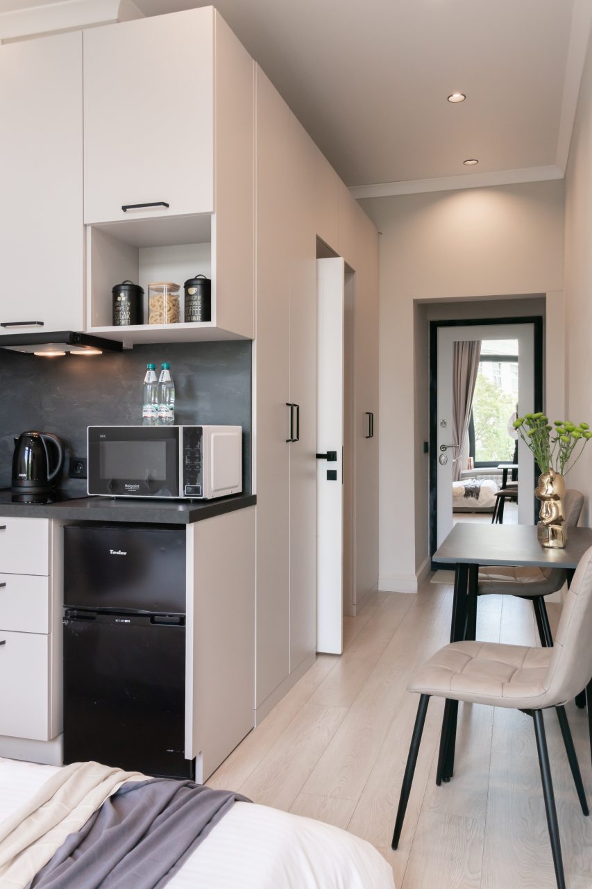 Выбрал апартаменты на сайте бронирования. Немного переживал перед заселением, так как у меня аллергия на пыль. Поэтому сразу всё проверил и остался доволен: порядок здесь поддерживается не только в легкодоступных местах! Так что все остальное уже было хорошо. Я был один, этой студии вполне достаточно для проживания.