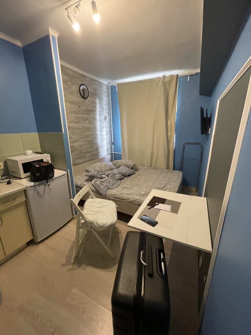 Бронировали апартаменты под номером 44-2, все оформили дистанционно. Очень удобно, так как даже не созванивались. Вся предоставленная информация об апартаментах соответствует действительности. Кровать удобная, достаточно большая. Душ и туалет совмещен, есть стиральная машина, утюг, фен. Зона кухни миниатюрная, есть холодильник. Метро в двух минутах от дома.