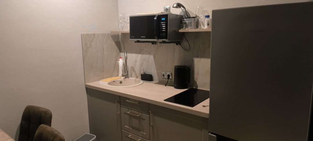 Хорошие и уютные апартаменты рядом с метро. В апартаментах большая кухня студия и отдельная спальня. По вместительности до 4 человек на мой взгляд. Хотя мы были там вдвоем))) Есть телевизор. Микроволновка, холодильник, чайник, посуда включая бокалы))