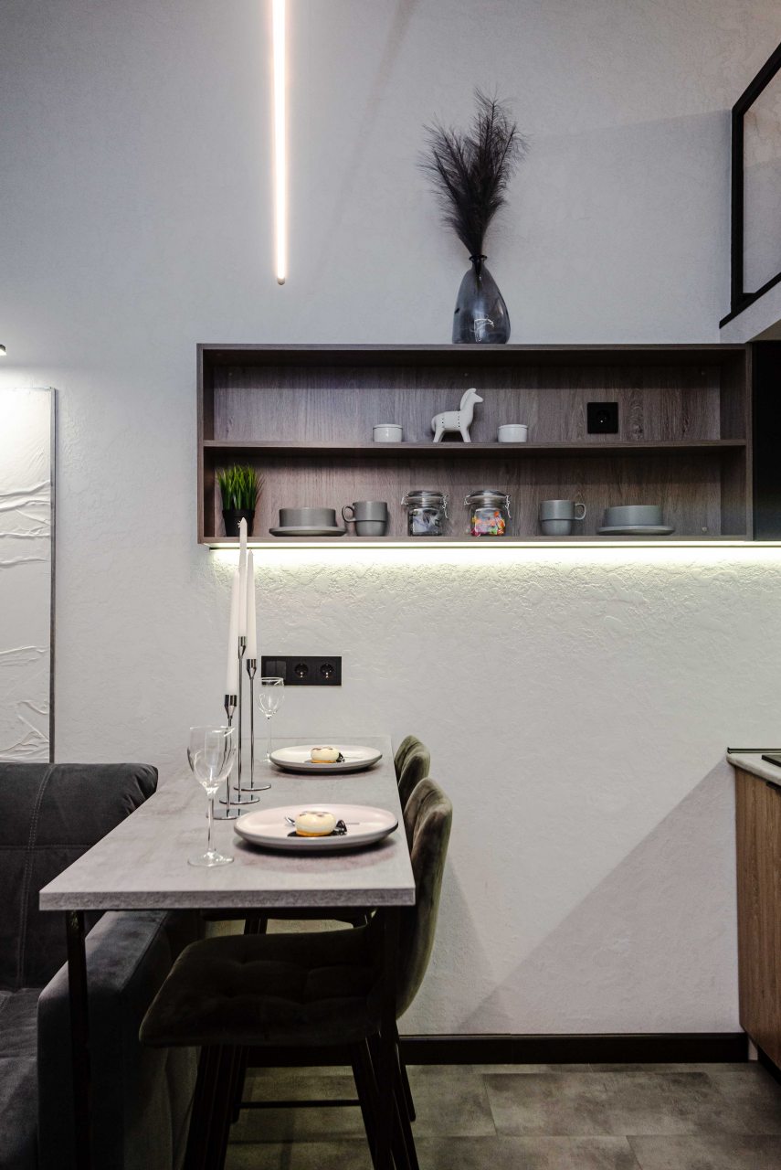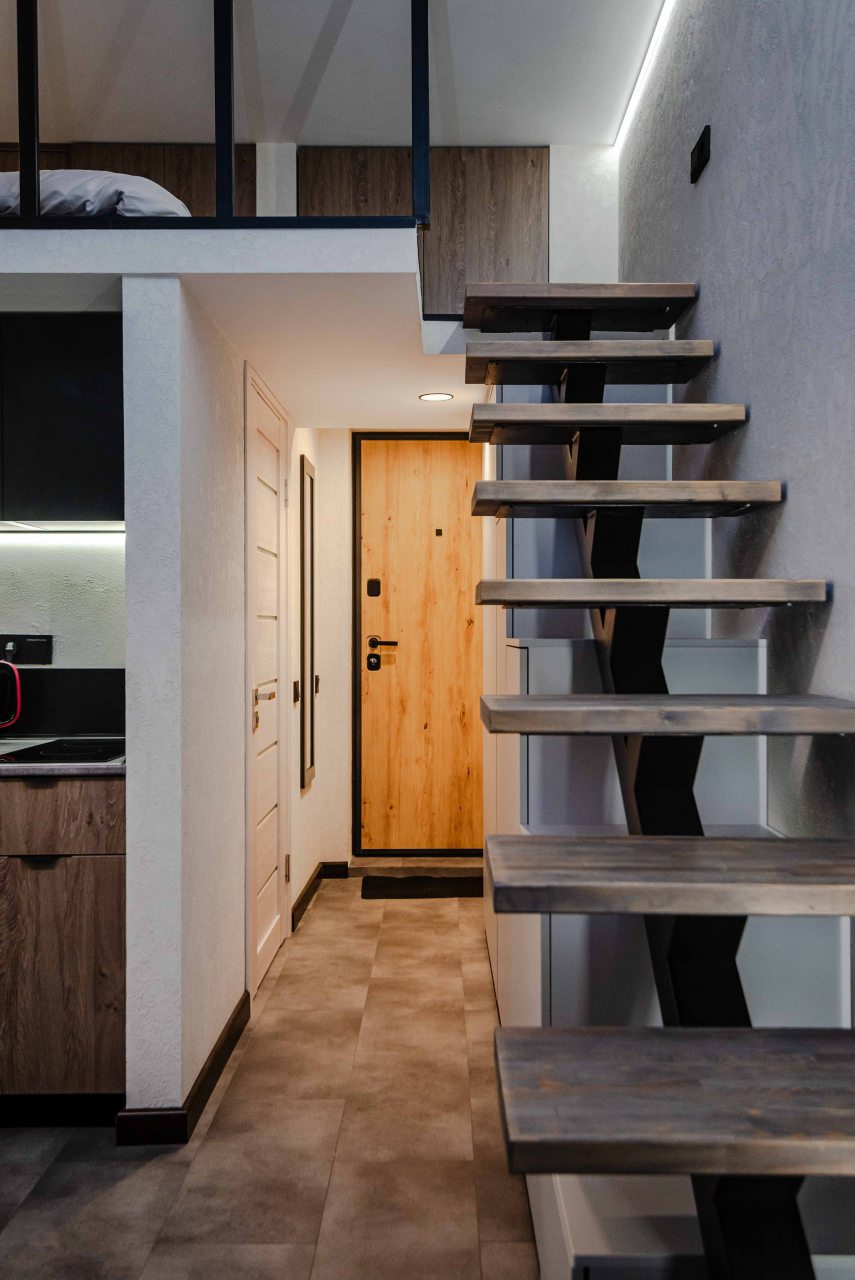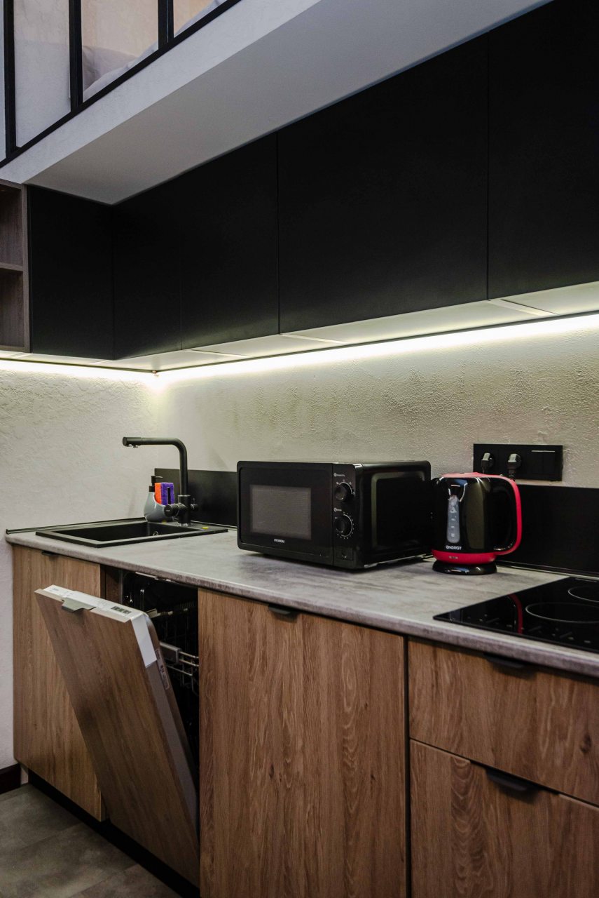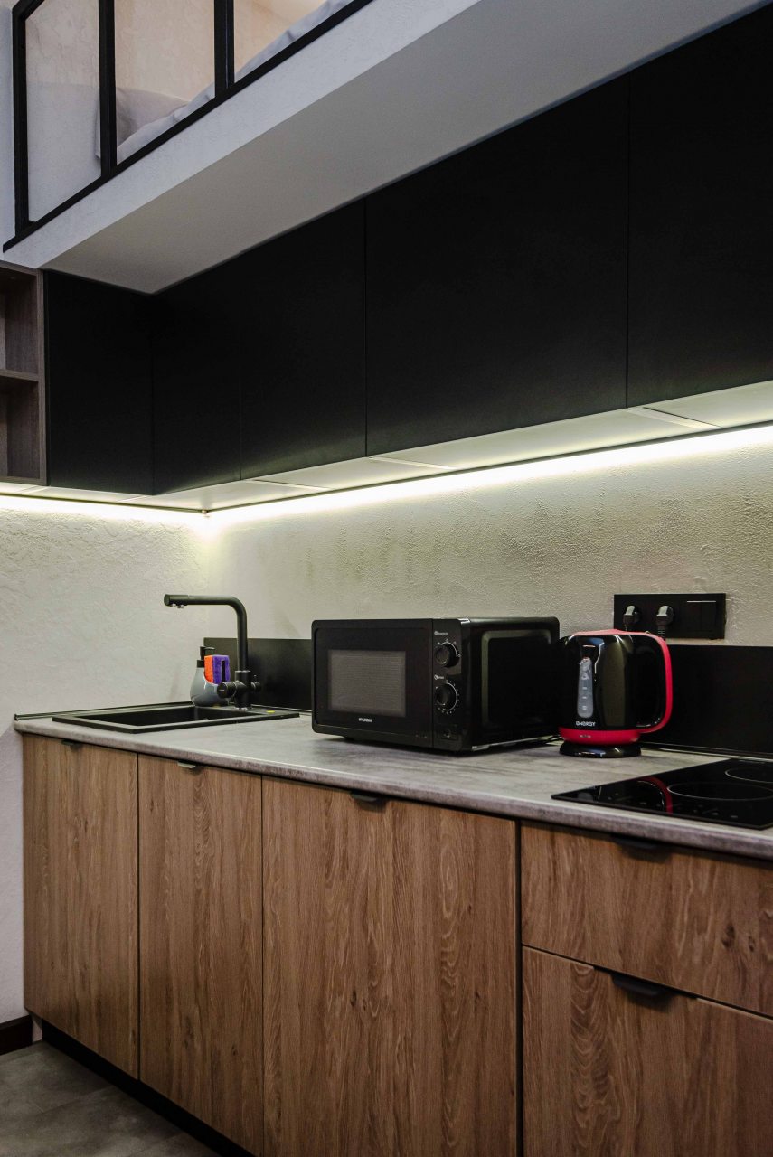 Апартаменты небольшие по площади, но в них все отлично разместилось. Кровать двухместная на втором этаже, есть подсветка под потолком. С ней намного комфортнее в вечерние часы. Кухонная зона имеется, телевизор есть. Посуды и техники лично мне хватило. Стиральная машина есть. Ступеньки на второй уровень широкие, устойчивые. Но поручня нет.