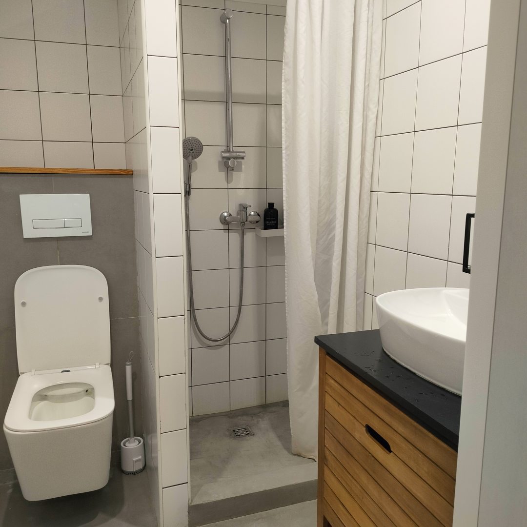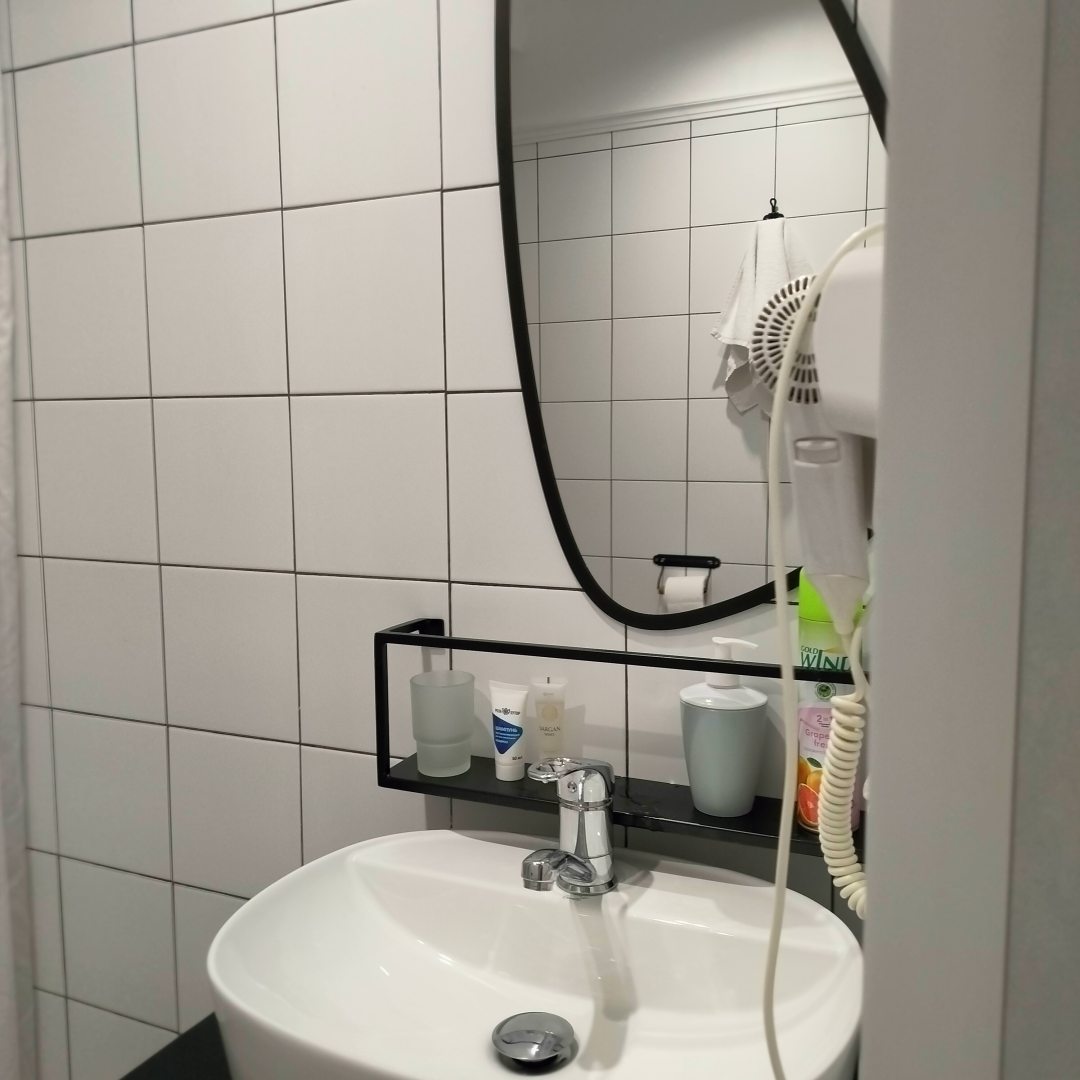 Номер небольшой, зато всё под рукой, кровать с ортопедическим матрасом, полка для вещей, зеркало. Понравилось, что у каждого спального места своя подсветка — можно читать, не мешая соседям. Ванная комната общая, но чистая, душ работает исправно. В хостеле тихо по ночам, соседи не шумят.