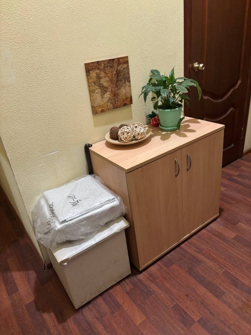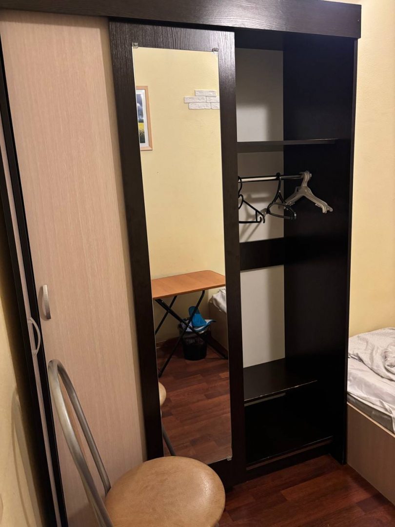 Мы неприхотливы, поэтому нам достаточно кровати, душа, туалета, кухни с чайником, посудой, холодильником и микроволновкой. Есть столик, шкаф с вешалками, телевизор и зеркало. Т.е. есть все необходимое.